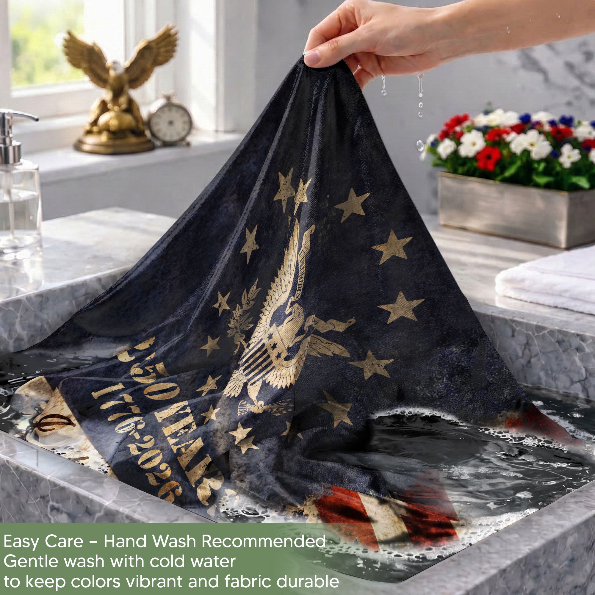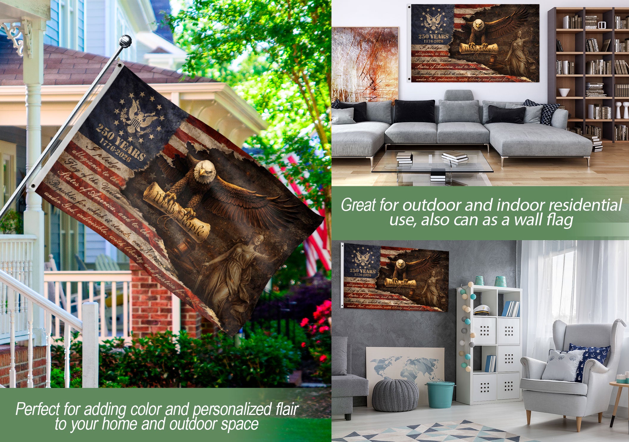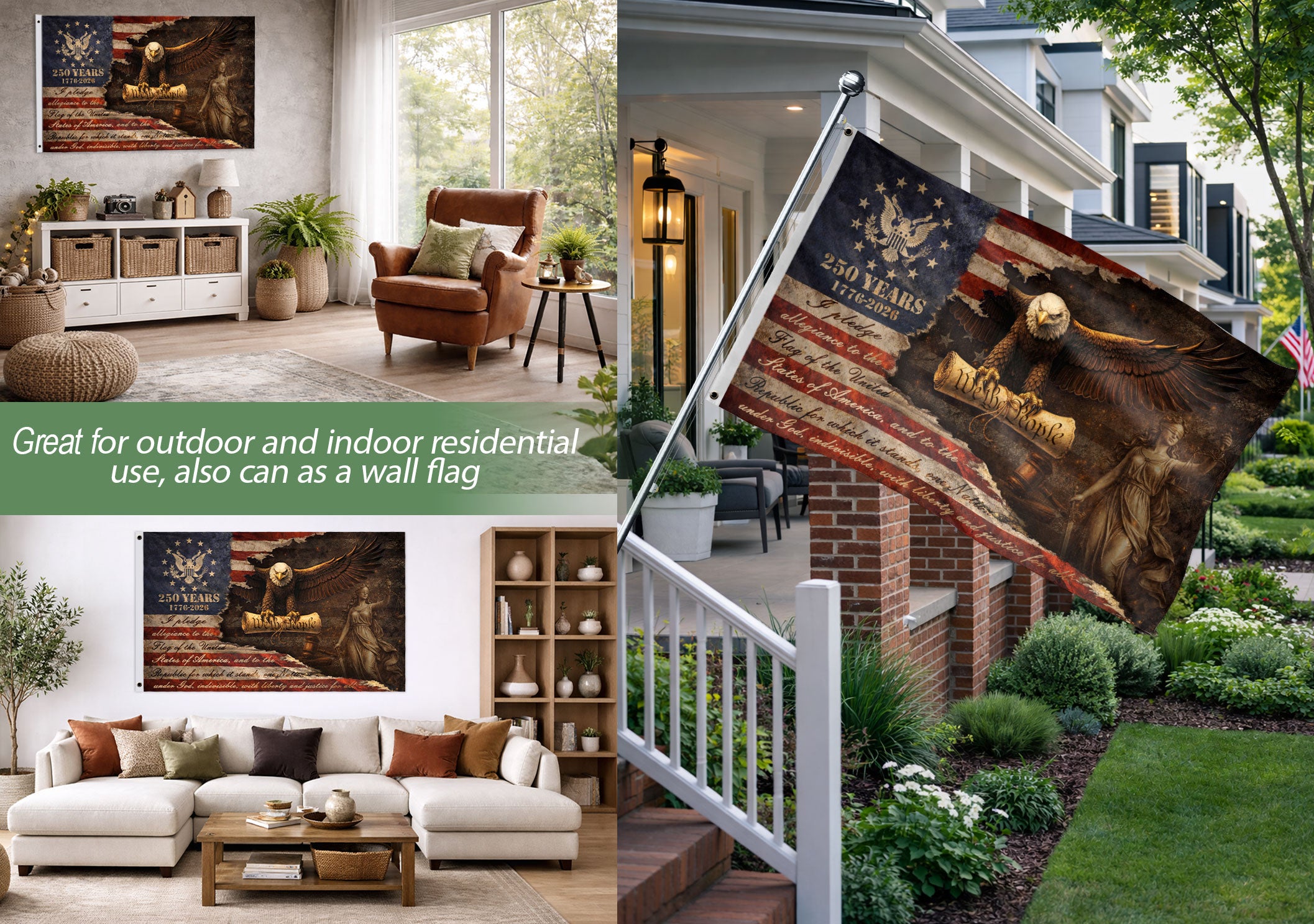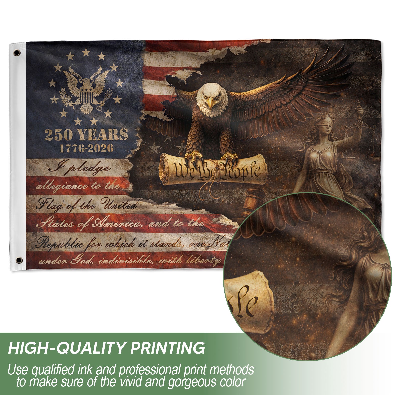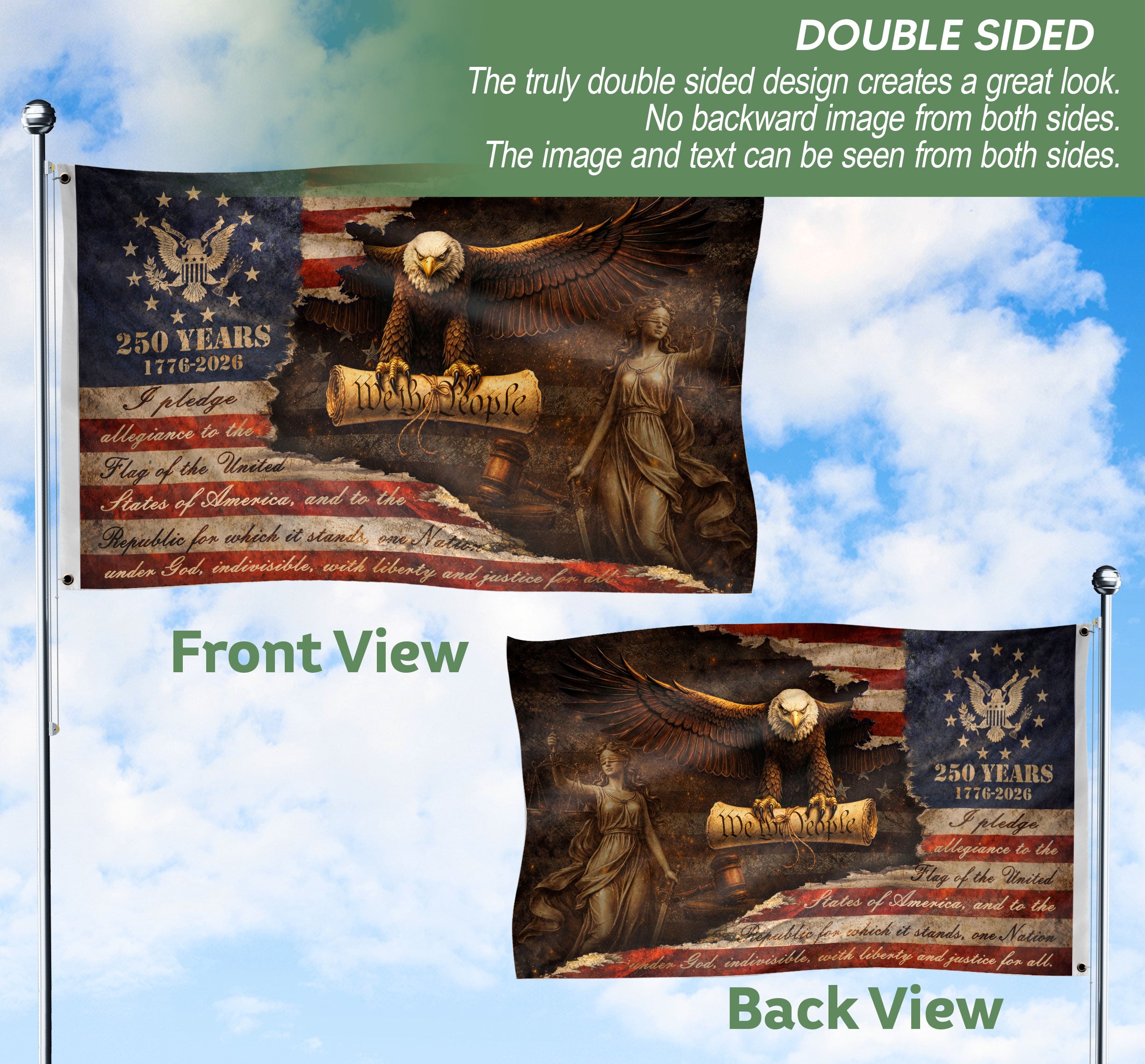 Celebrate America’s 250th anniversary from 1776 to 2026 with this striking Justice Gavel Eagle house flag. Featuring a vigilant Bald Eagle perched on a judicial gavel, alongside Lady Justice and the Statue of Liberty, this patriotic design embodies freedom, authority, and national pride. The ‘We The People’ motif highlights constitutional heritage. Perfect for porches, gardens, or homes during Independence Day, Memorial Day, or everyday display. Crafted for durability and vibrant colors that withstand outdoor conditions. Double-sided printing ensures visibility from both sides. Ideal for patriots honoring U.S. history and semiquincentennial milestone.
