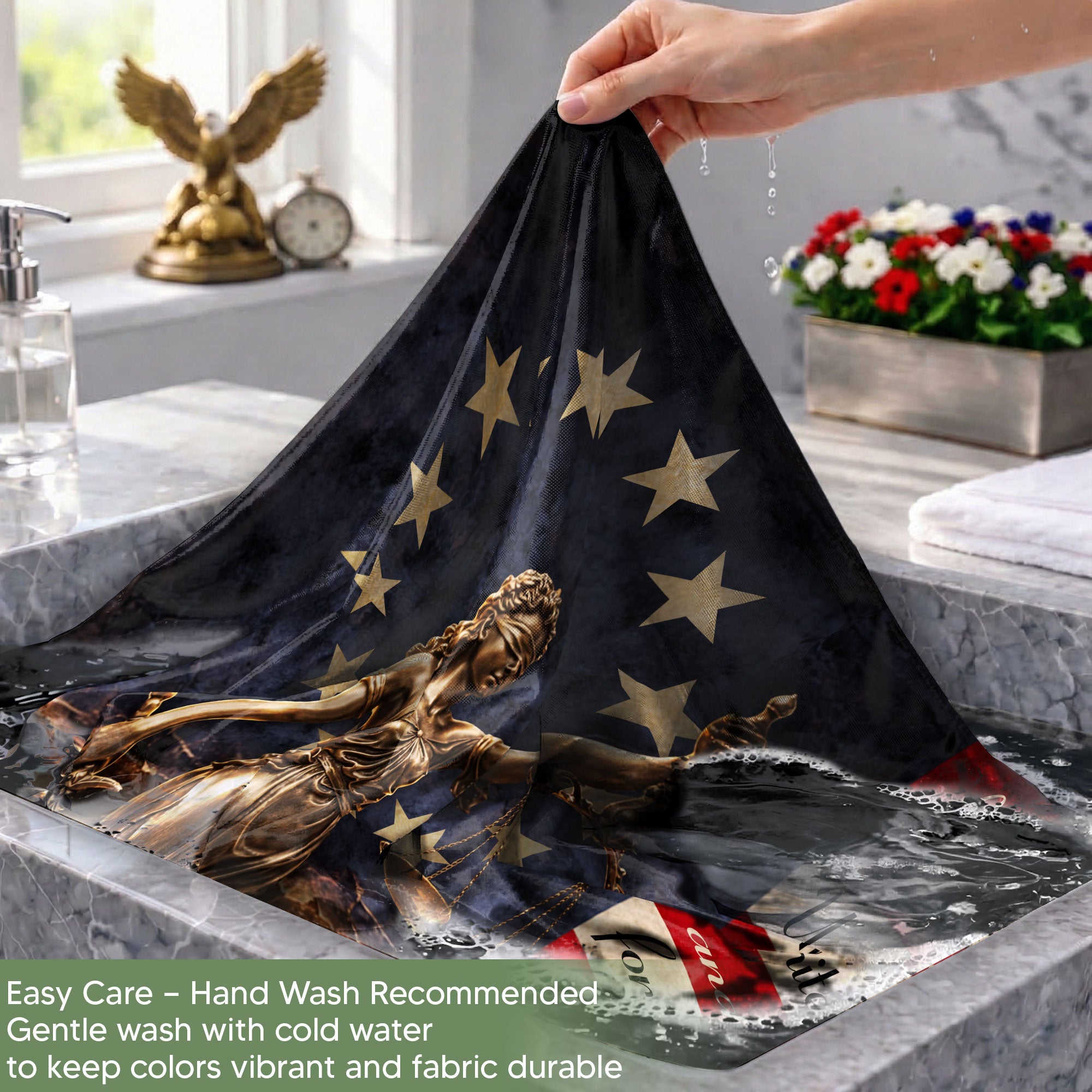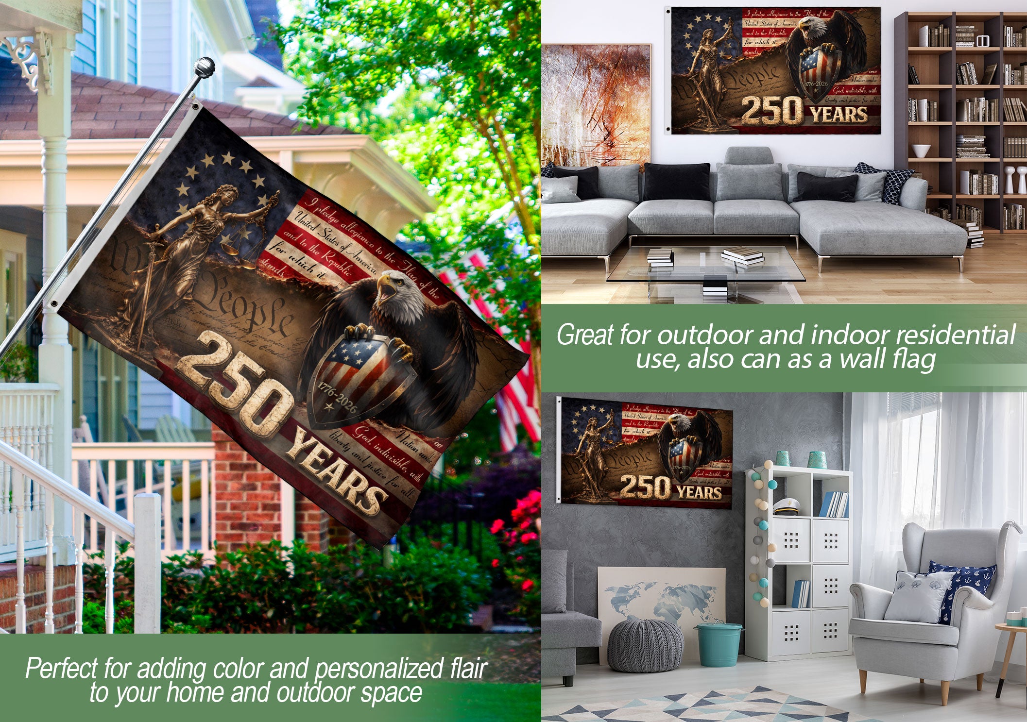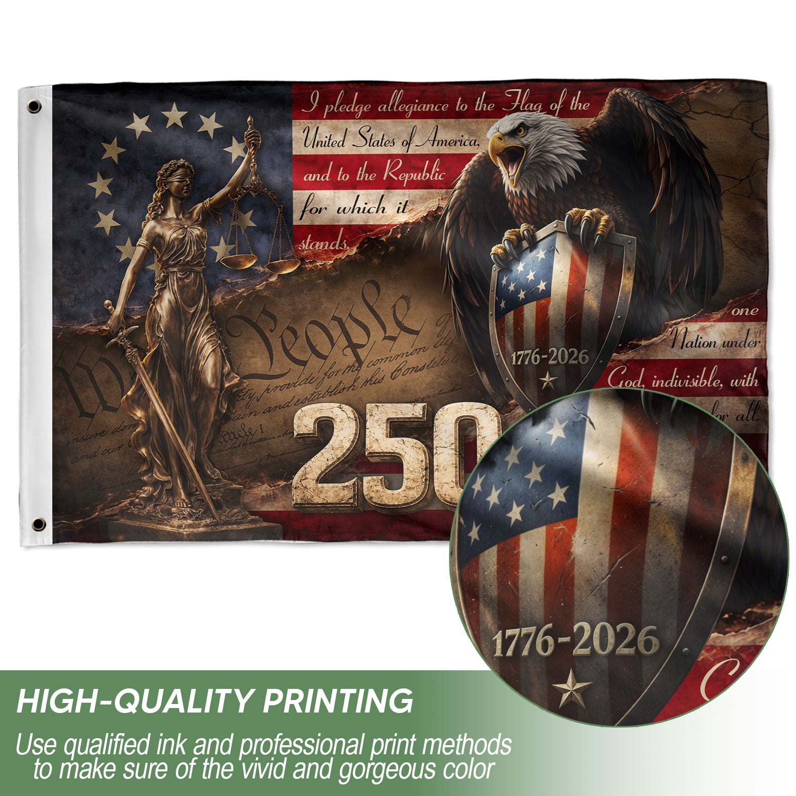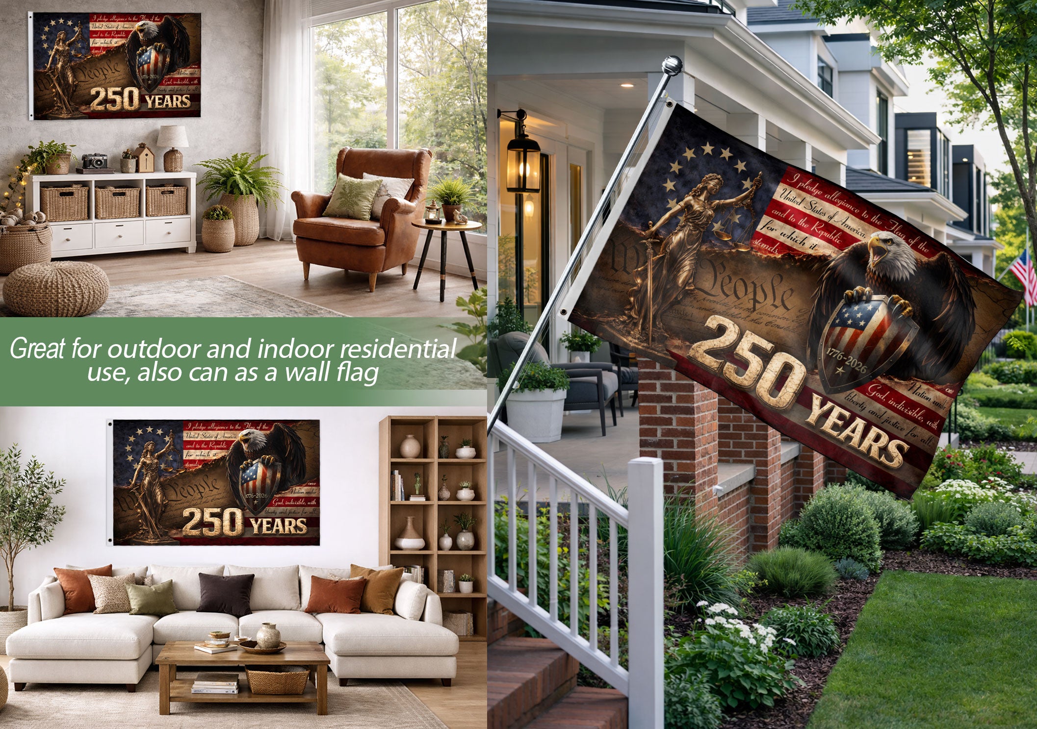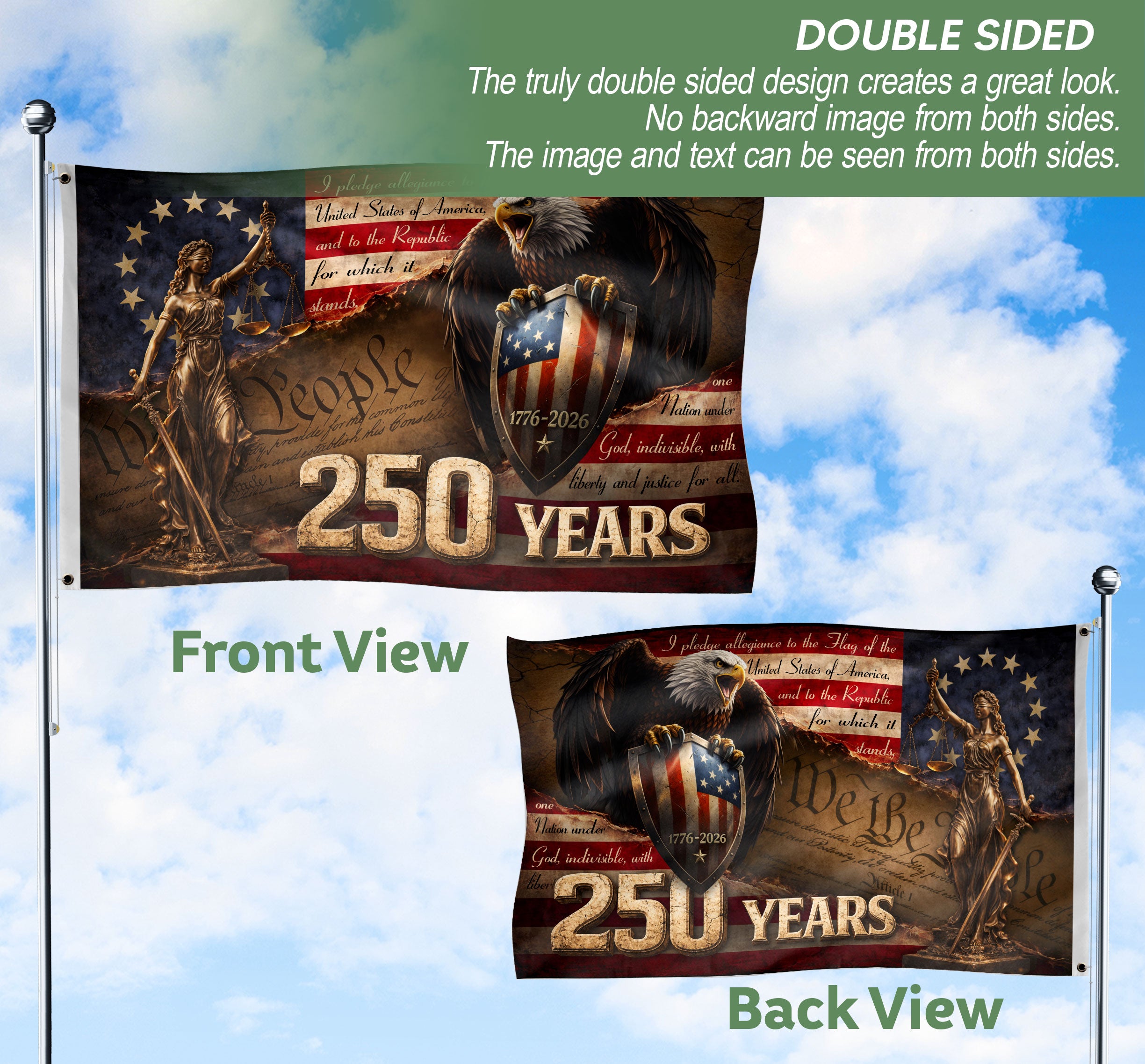 Celebrate 250 years of American freedom with this Lady Justice house flag, commemorating the journey from 1776 to 2026. Featuring a striking artwork of Lady Justice holding her iconic scales of justice, paired with a majestic bald eagle perched on a patriotic shield emblazoned with ‘We The People’ and the historic milestone. Perfect for displaying outside your home to honor the United States’ quarter-millennium of independence. Crafted from durable, weather-resistant polyester fabric, this double-sided flag measures standard house flag size for easy attachment to flagpoles or garden stands. Vibrant colors and high-quality printing ensure long-lasting visibility and fade resistance. Ideal for patriots, history enthusiasts, Fourth of July celebrations, or everyday display of national pride. Add a touch of symbolism and Americana to your porch, yard, or balcony.
