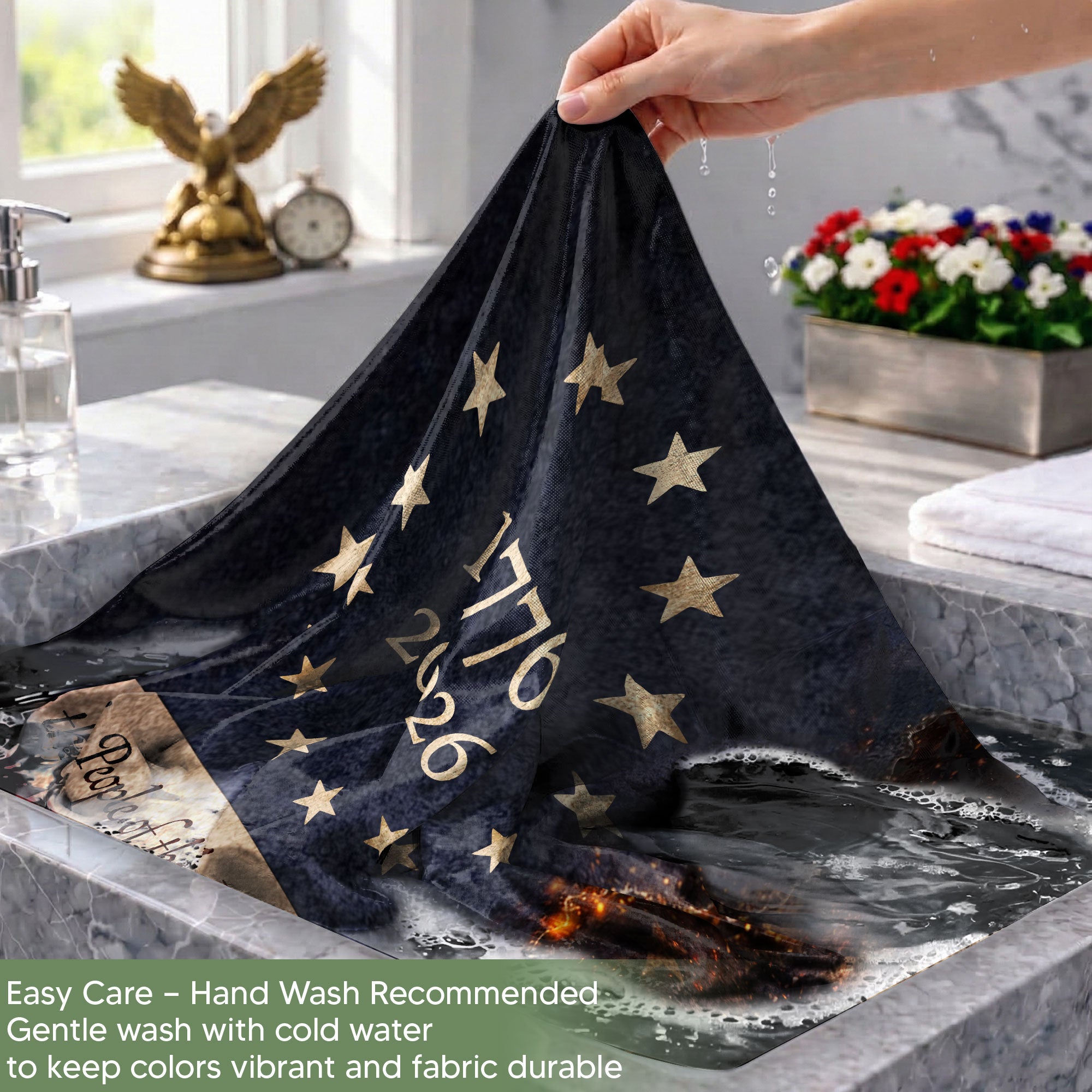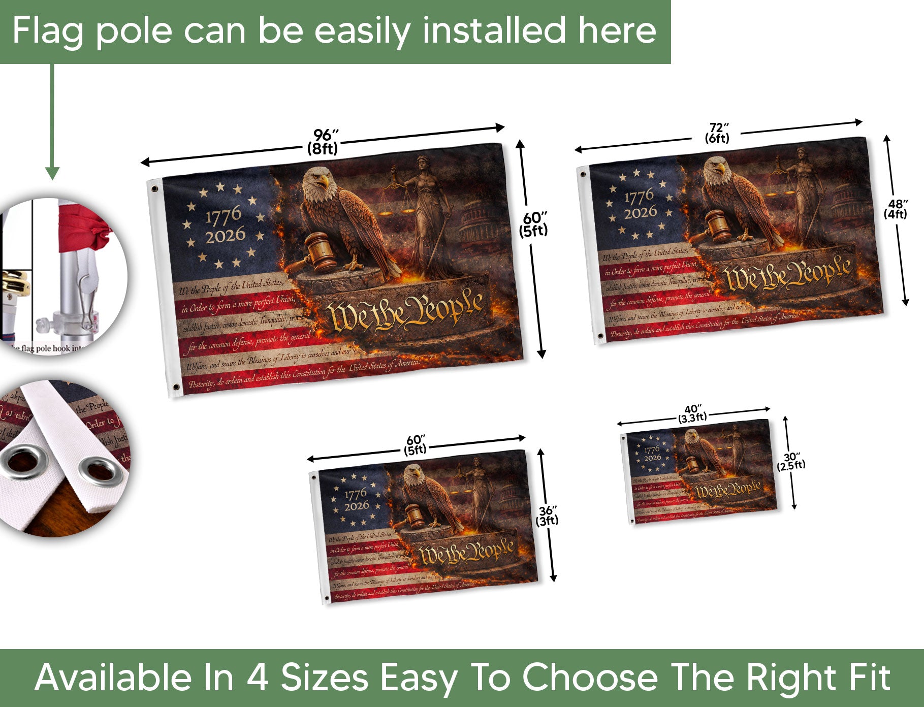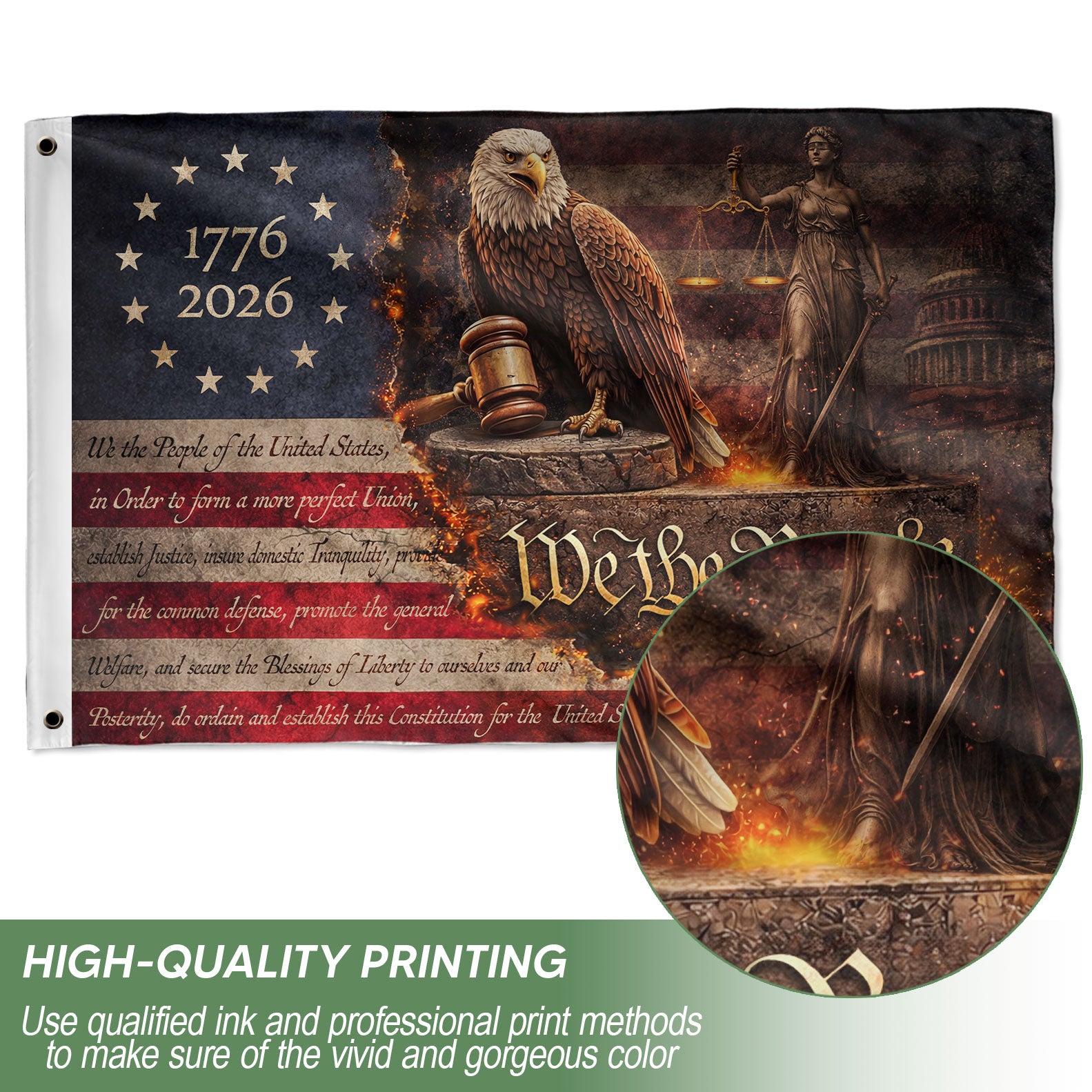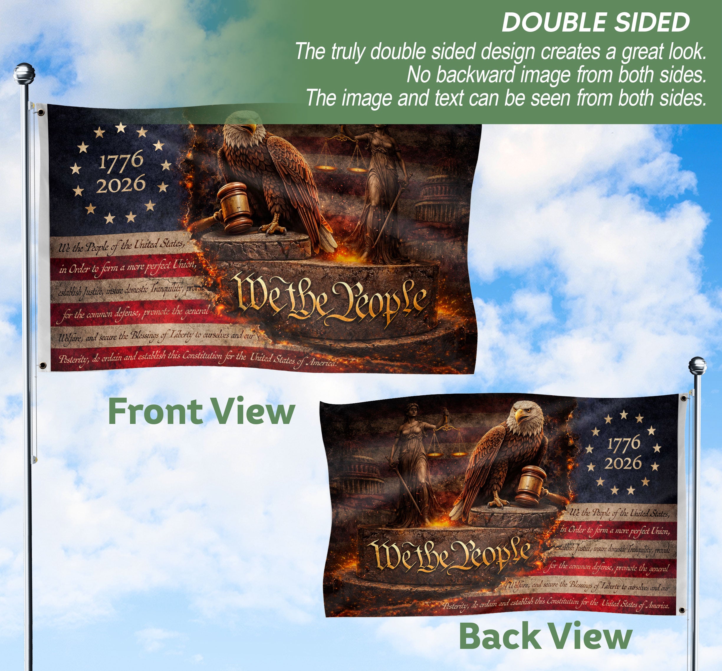 Celebrate 250 years of American independence with this striking Lady Justice house flag featuring We The People design. The artwork showcases Lady Justice holding her iconic scales and sword, flanked by a vigilant bald eagle guarding a shield marked 1776-2026. Crafted for outdoor display, this durable house flag embodies the core principles of the Republic—justice, liberty, and patriotism. Perfect for porches, gardens, or flagpoles to honor U.S. heritage during the semiquincentennial. Made with weather-resistant fabric to withstand the elements while proudly displaying American symbols like the eagle, shield, and founding motto. Ideal for patriots, history enthusiasts, and those commemorating the enduring promise of justice for all.