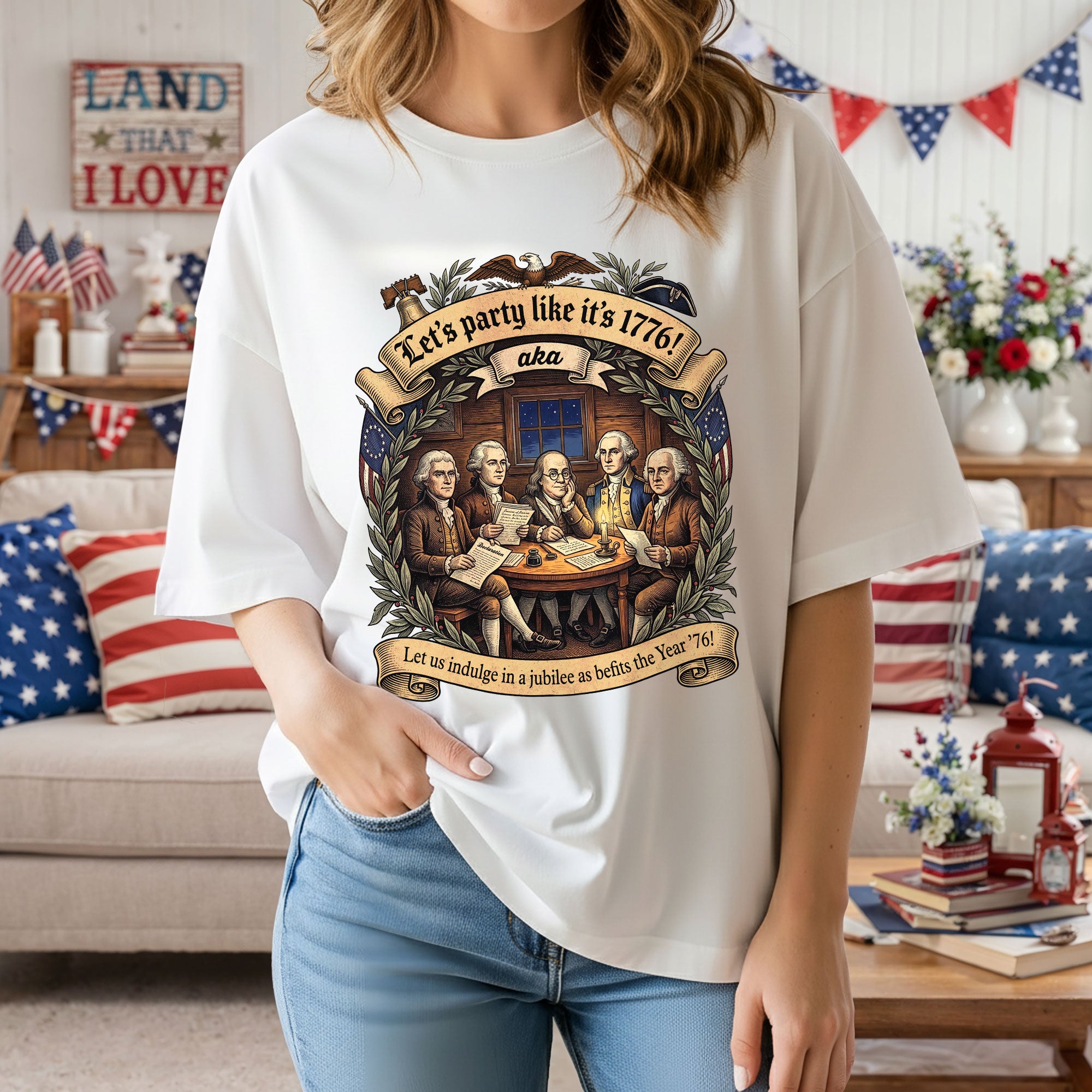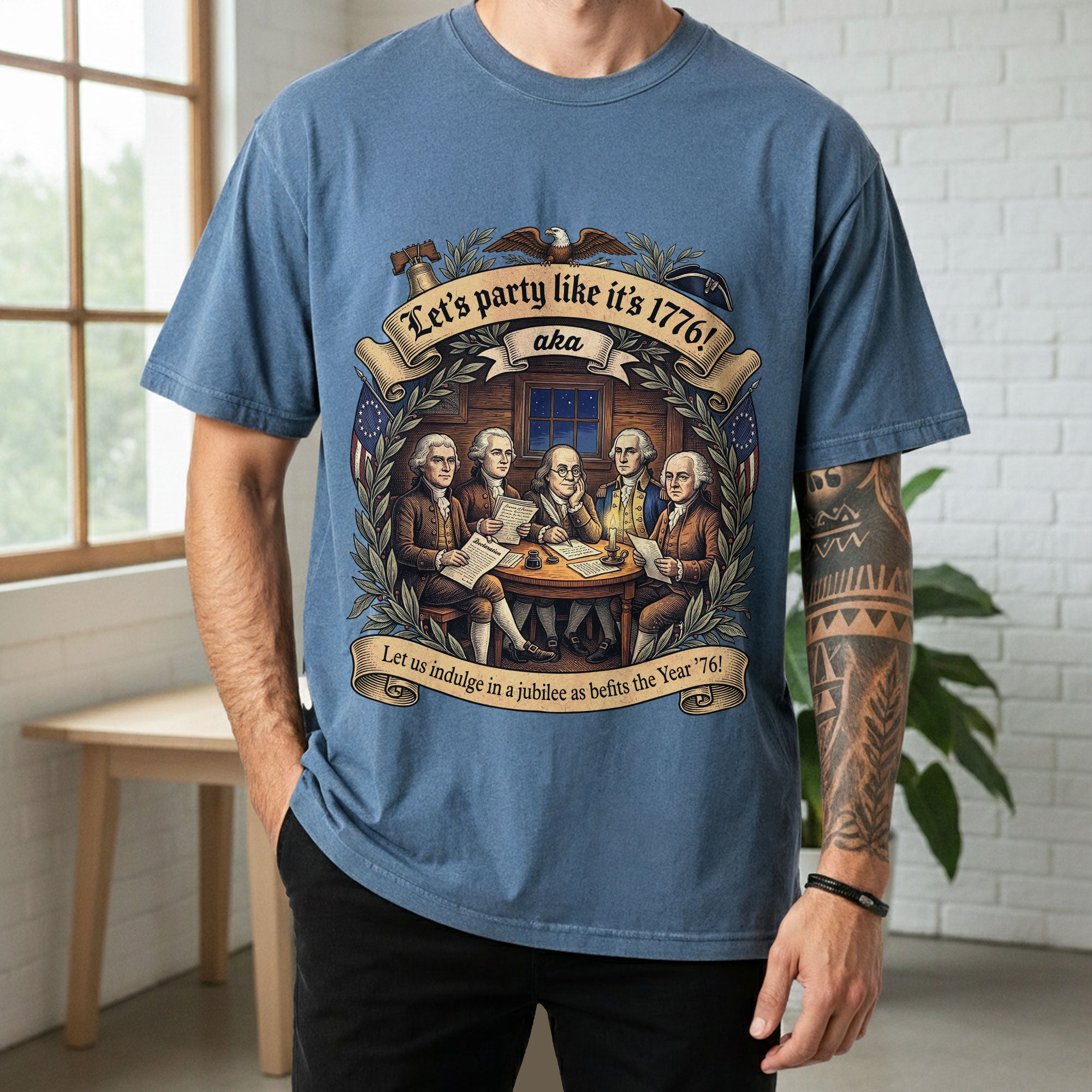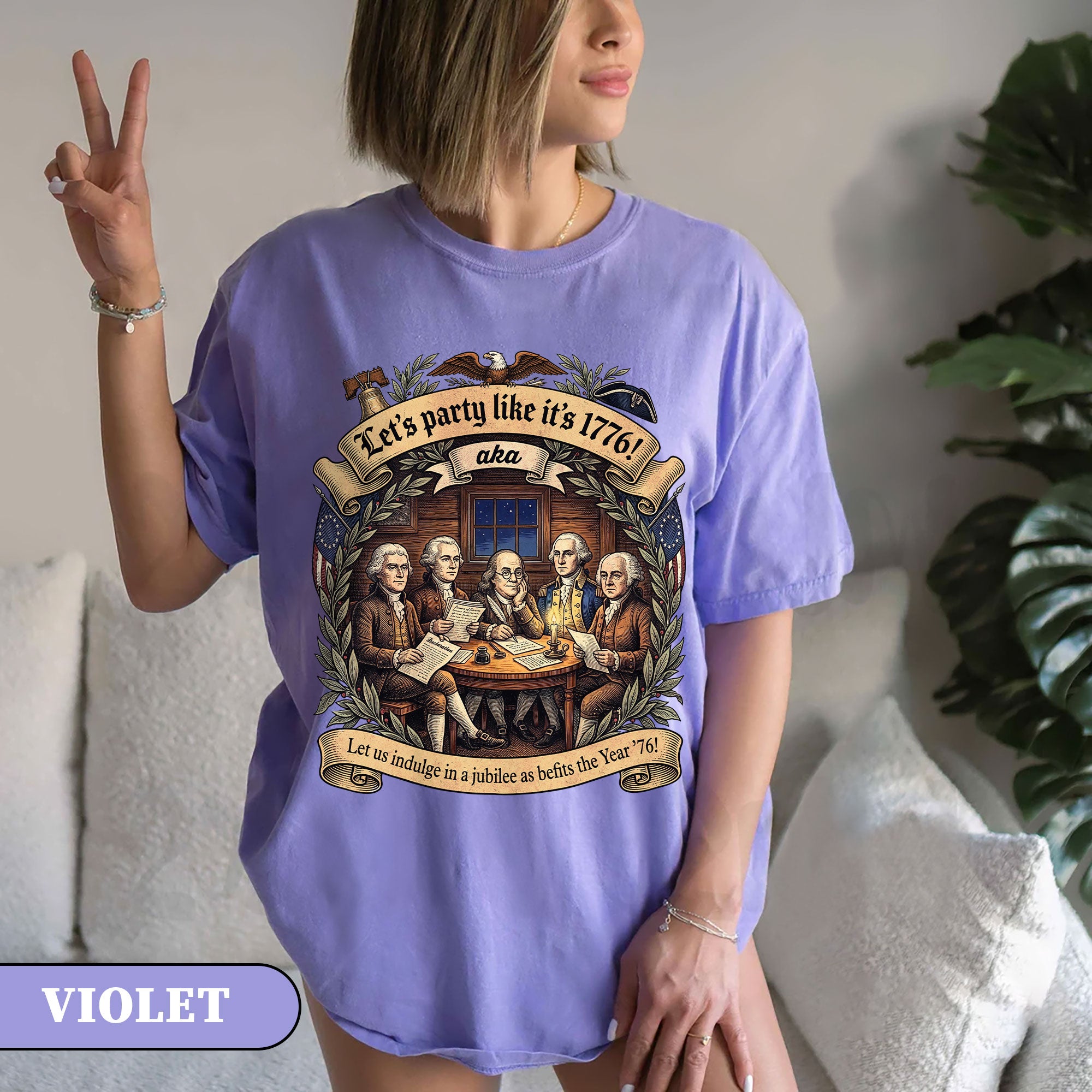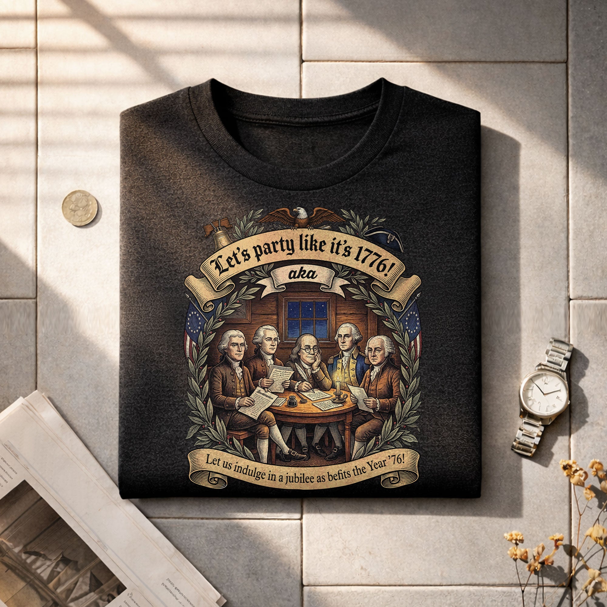 Celebrate America’s revolutionary spirit with this Let’s Party Like It’s 1776 vintage Founding Fathers patriotic USA unisex T-shirt. Featuring a classic retro illustration of the iconic Founding Fathers and the bold phrase “Let’s Party Like It’s 1776,” this comfortable tee is ideal for Independence Day celebrations, 250th USA anniversary events, Memorial Day, Fourth of July barbecues, or any patriotic gathering. Made from soft, breathable cotton-poly blend fabric, it offers a relaxed unisex fit for all-day wear. Perfect for history buffs, veterans, and proud Americans who love vintage-style apparel that honors the birth of the nation in 1776. Machine washable and durable for everyday use.