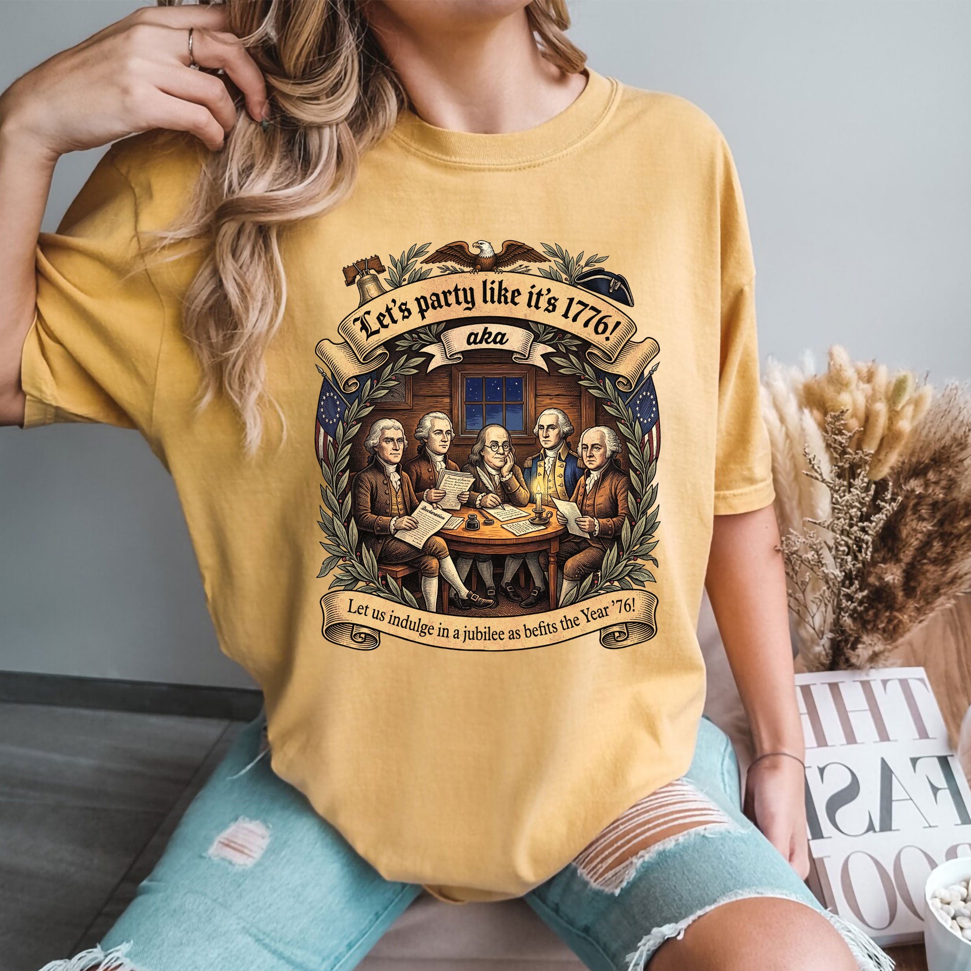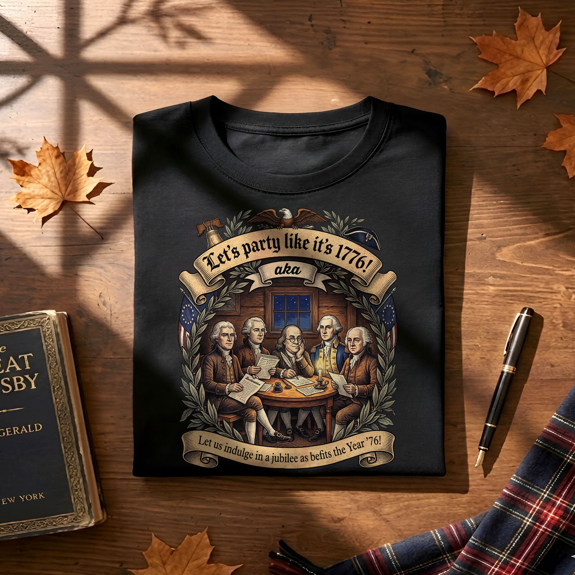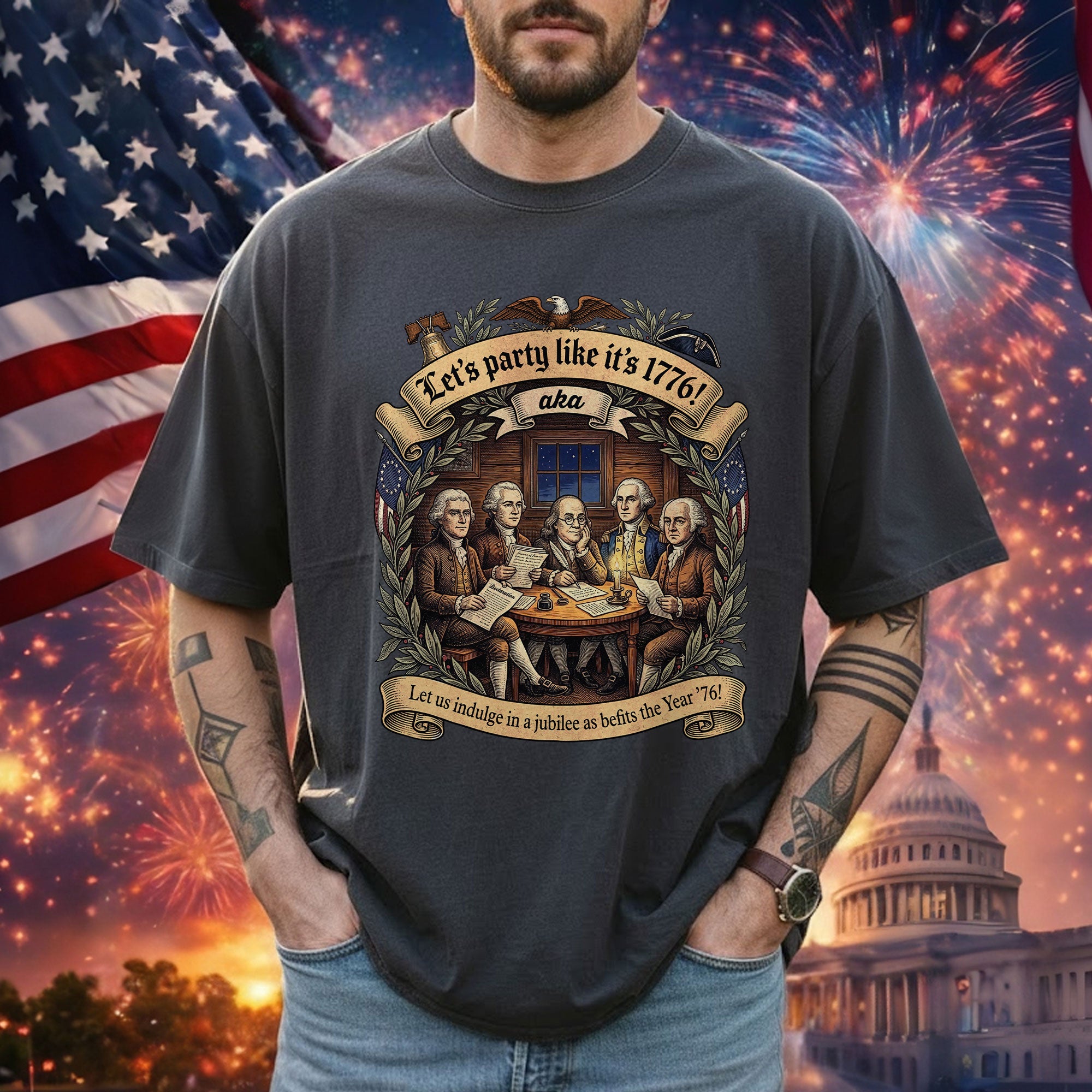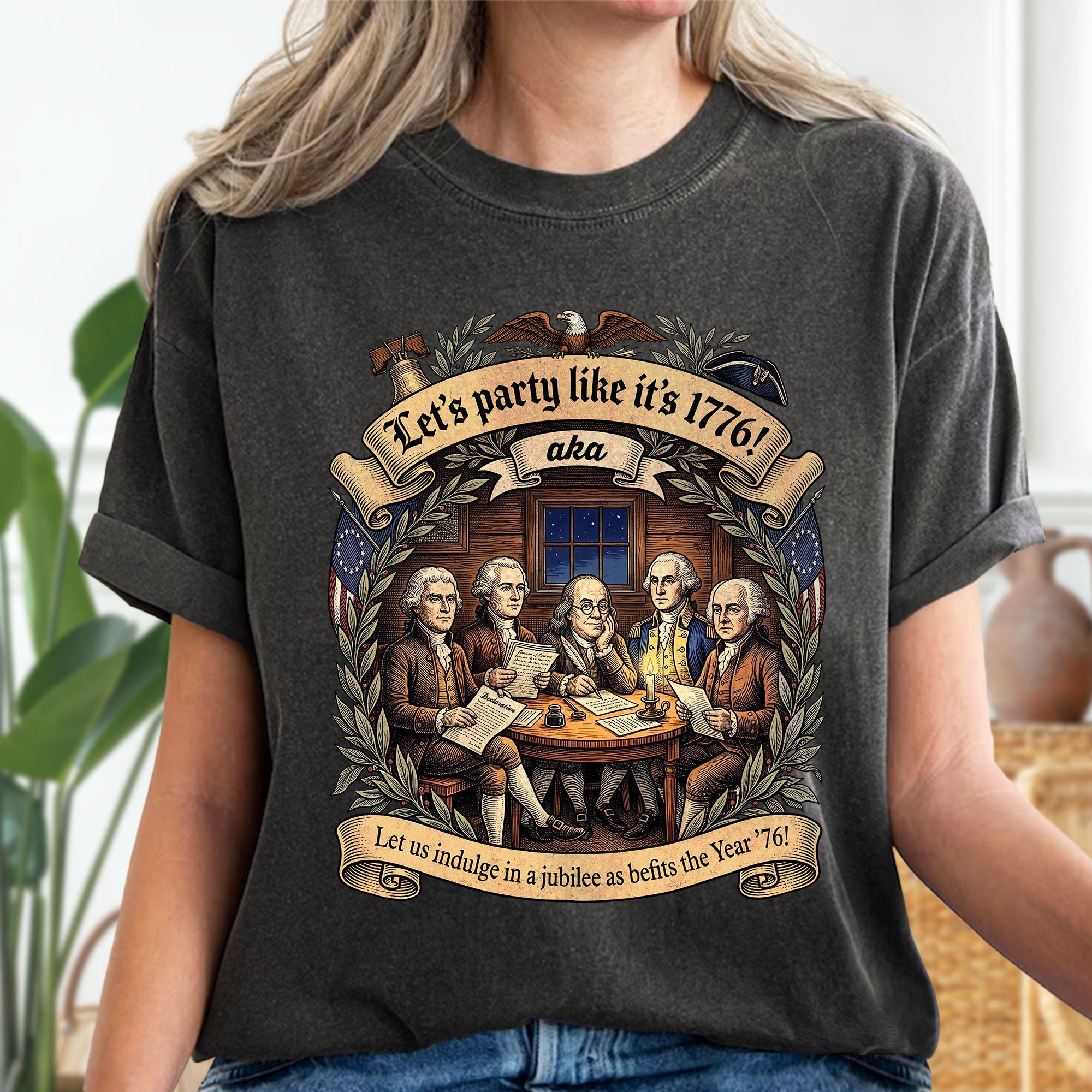 Celebrate America’s revolutionary spirit with this Let’s Party Like It’s 1776 vintage Founding Fathers patriotic USA unisex T-shirt. Featuring a classic retro illustration of the iconic Founding Fathers and the bold phrase “Let’s Party Like It’s 1776,” this comfortable tee is ideal for Independence Day celebrations, 250th USA anniversary events, Memorial Day, Fourth of July barbecues, or any patriotic gathering. Made from soft, breathable cotton-poly blend fabric, it offers a relaxed unisex fit for all-day wear. Perfect for history buffs, veterans, and proud Americans who love vintage-style apparel that honors the birth of the nation in 1776. Machine washable and durable for everyday use.
