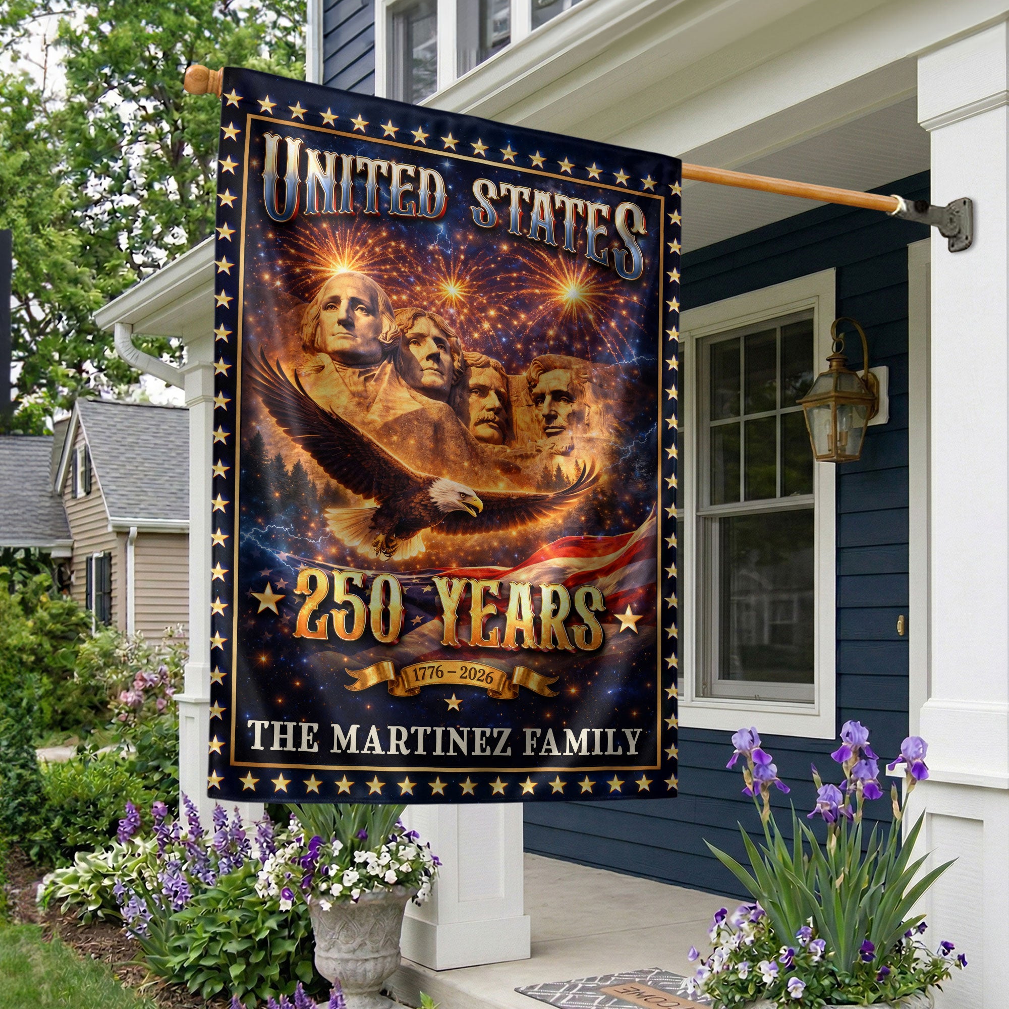 Celebrate America’s 250th anniversary with this Mount Rushmore Patriotic Garden Flag featuring a custom family name. The striking design showcases the iconic Mount Rushmore presidents, a soaring bald eagle, vibrant fireworks, and a bold ‘United States’ header. The commemorative ‘250 Years 1776-2026’ banner adds historical significance, making it a perfect heritage display for your garden, yard, or porch. Crafted for outdoor durability, this personalized banner withstands weather elements while proudly displaying your family name alongside timeless American symbols. Ideal for patriotic holidays like Independence Day, Memorial Day, or everyday display to honor national pride and family legacy.