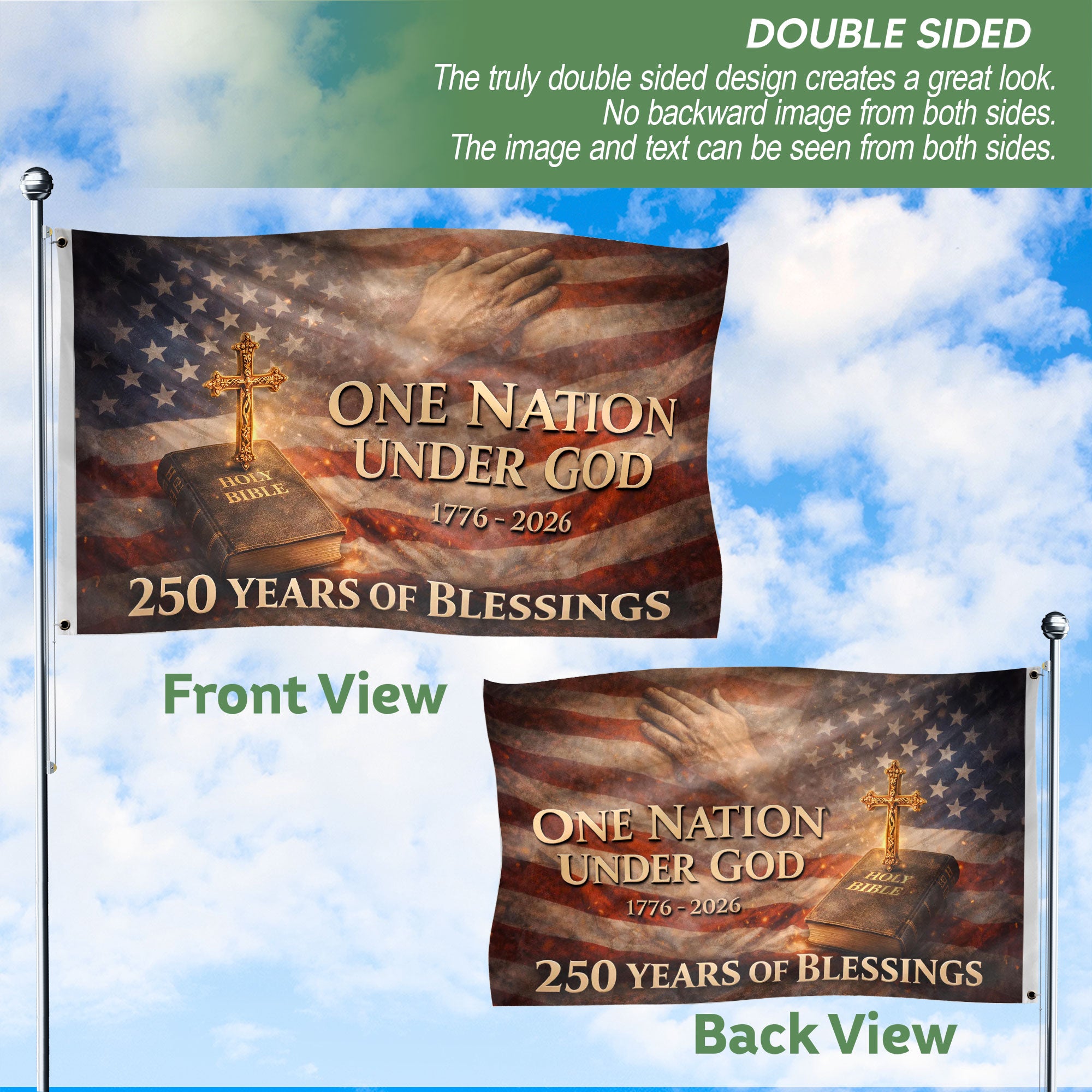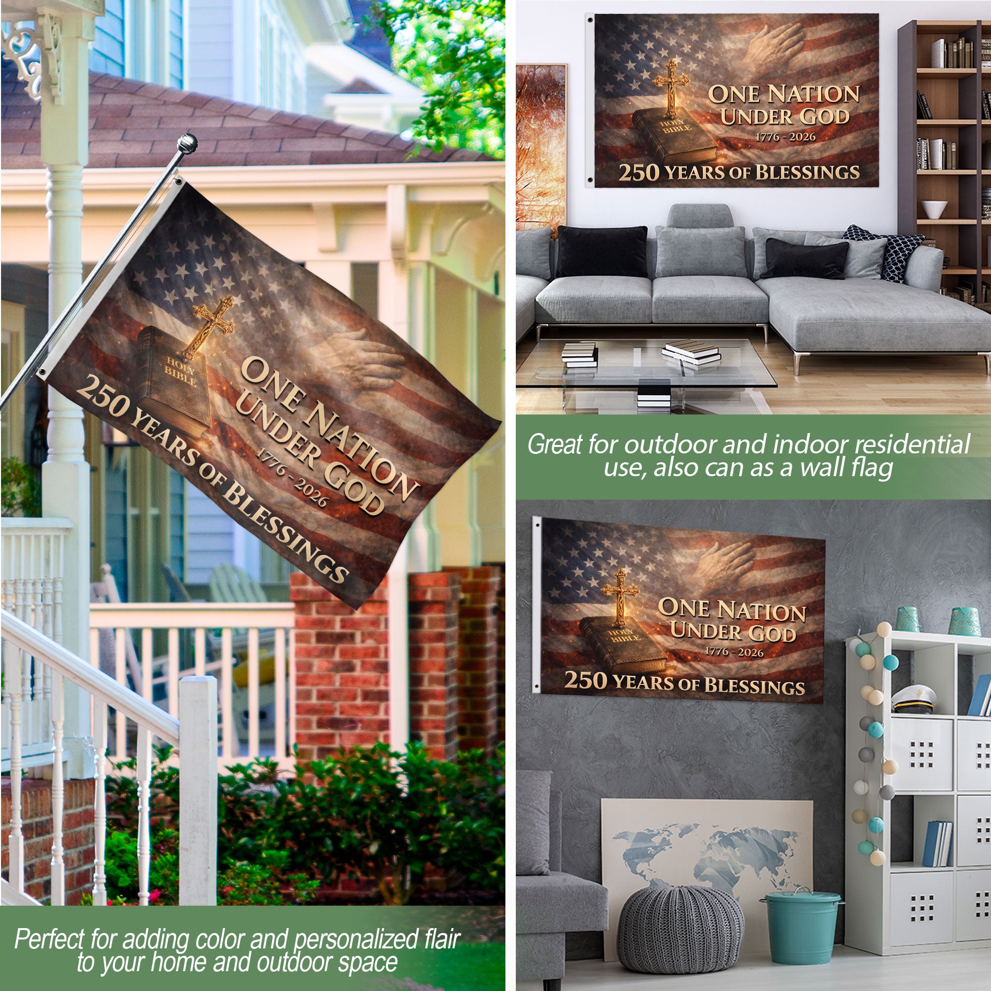 Celebrate America’s 250th anniversary from 1776 to 2026 with this double-sided house flag featuring ‘One Nation Under God,’ Holy Bible, and cross design. Measuring 28×40 inches, this patriotic garden banner is crafted from premium polyester fabric for exceptional durability and vibrant color retention. It withstands weather elements including wind, rain, and sun, making it ideal for porches, patios, mailboxes, or yards. Double-sided printing ensures the design is clearly visible from both sides, perfect for displaying national pride, Christian faith, and gratitude. The included sleeve allows for easy hanging on flag poles or stands. A meaningful addition for Independence Day, Memorial Day, Fourth of July, or everyday patriotic displays honoring 250 years of American blessings and enduring values.