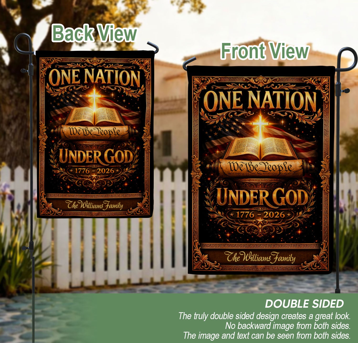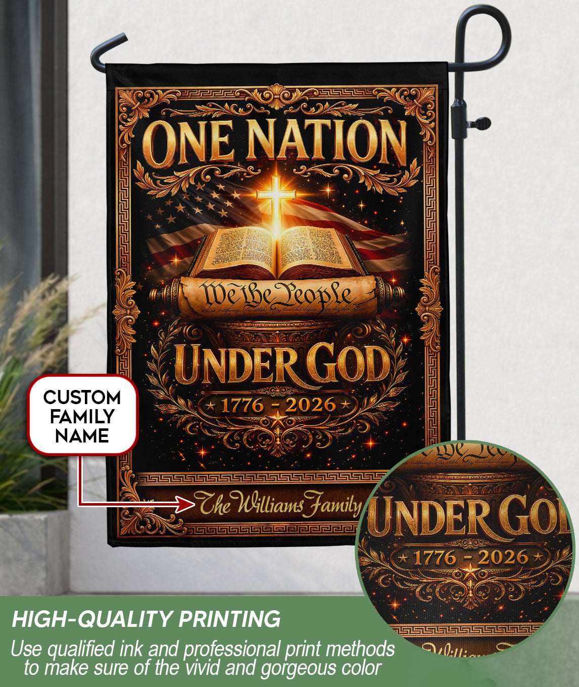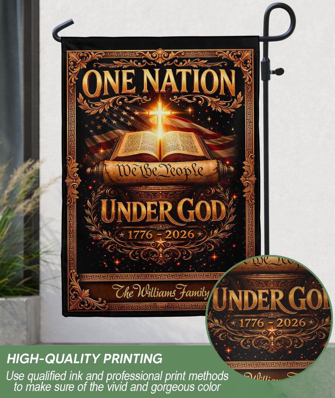 One Nation Under God 250th Anniversary Garden Flag Custom Family Name Bible Cross We the People 1776-2026