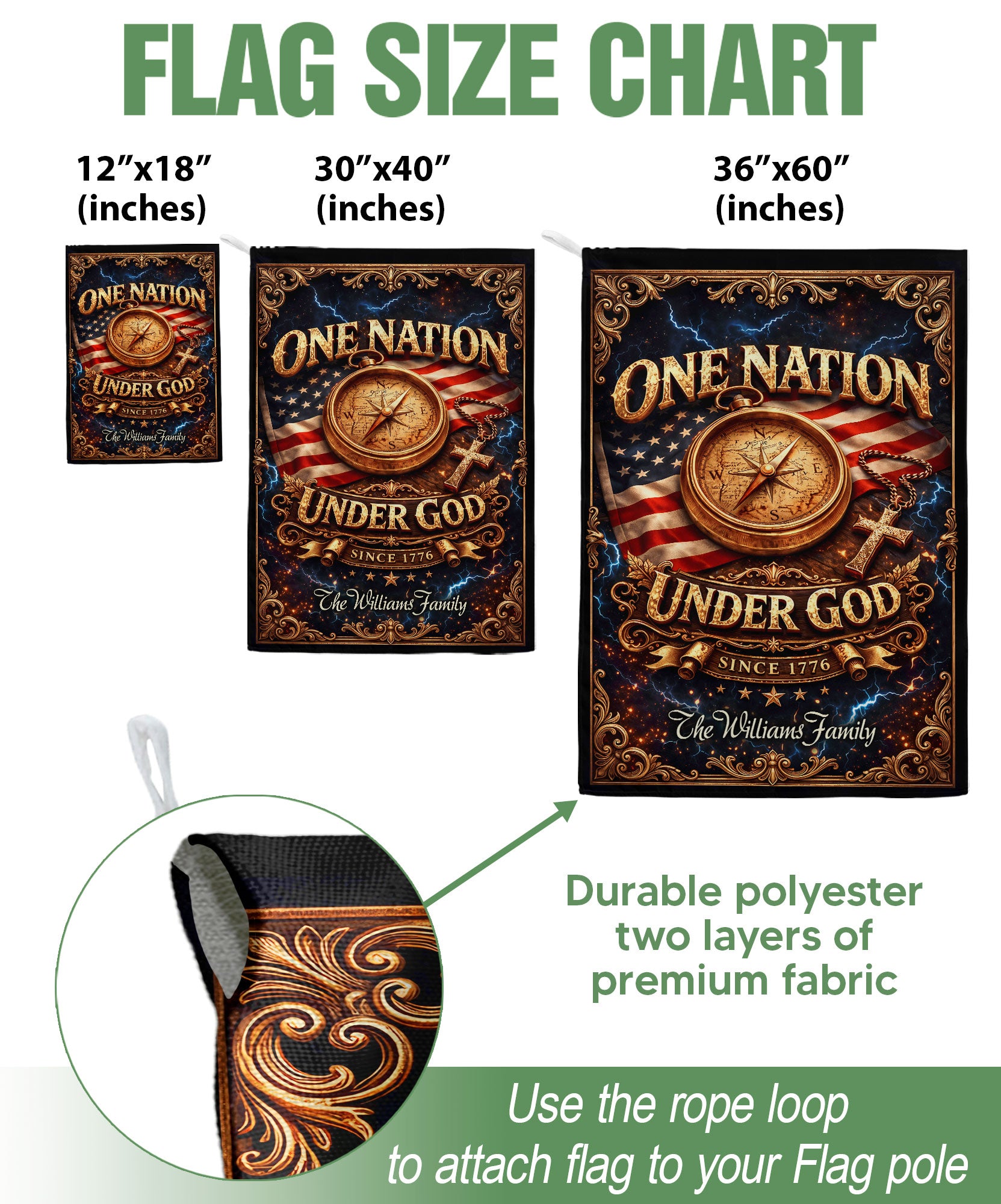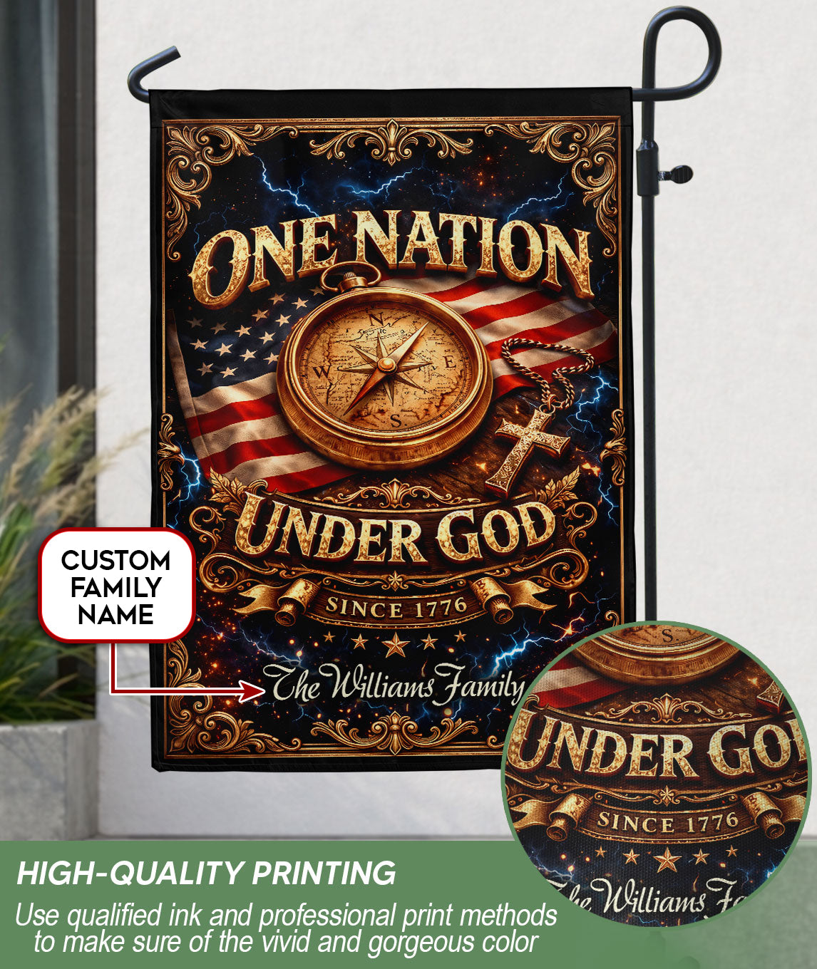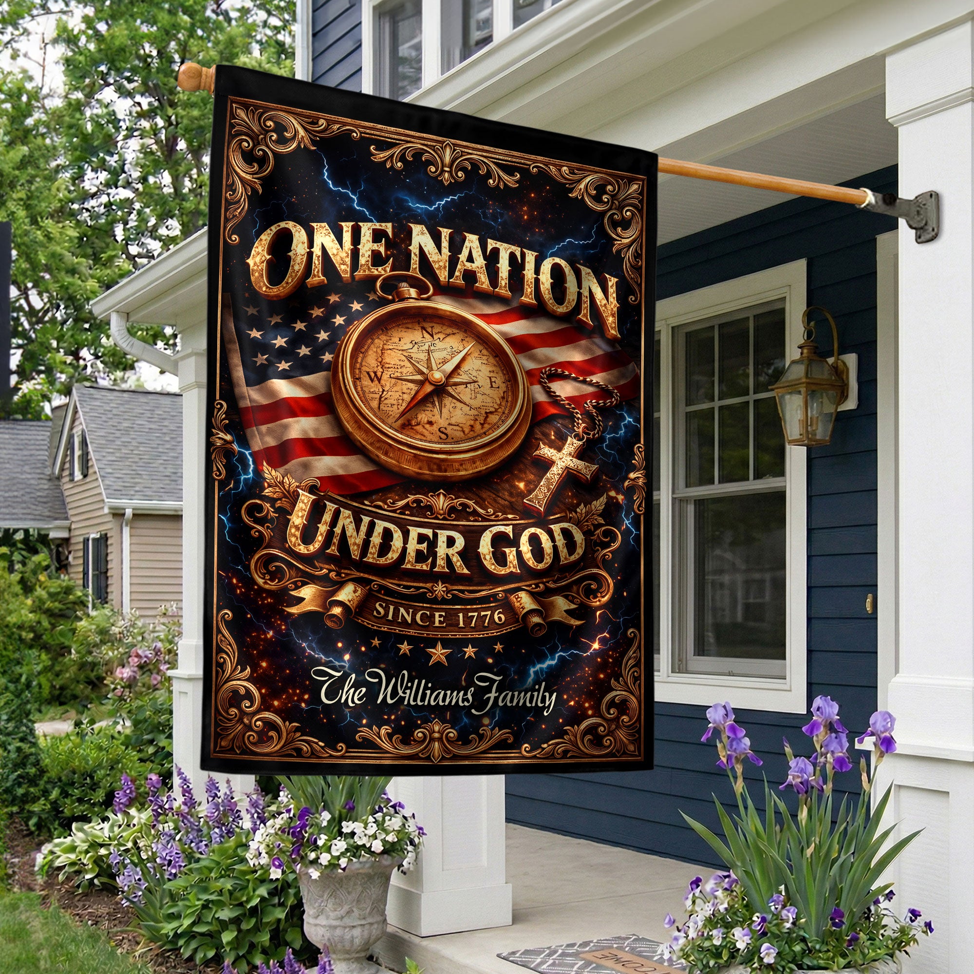 One Nation Under God 250th Anniversary Garden Flag – Custom Family Name Compass Cross USA Flag 1776-2026