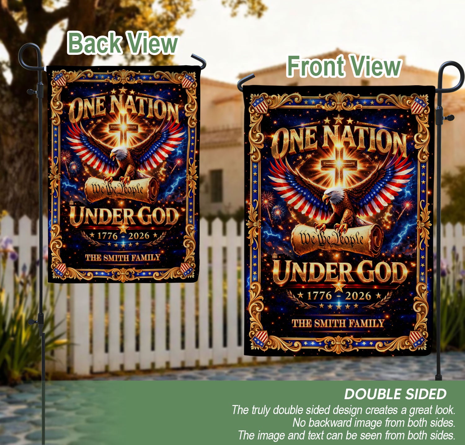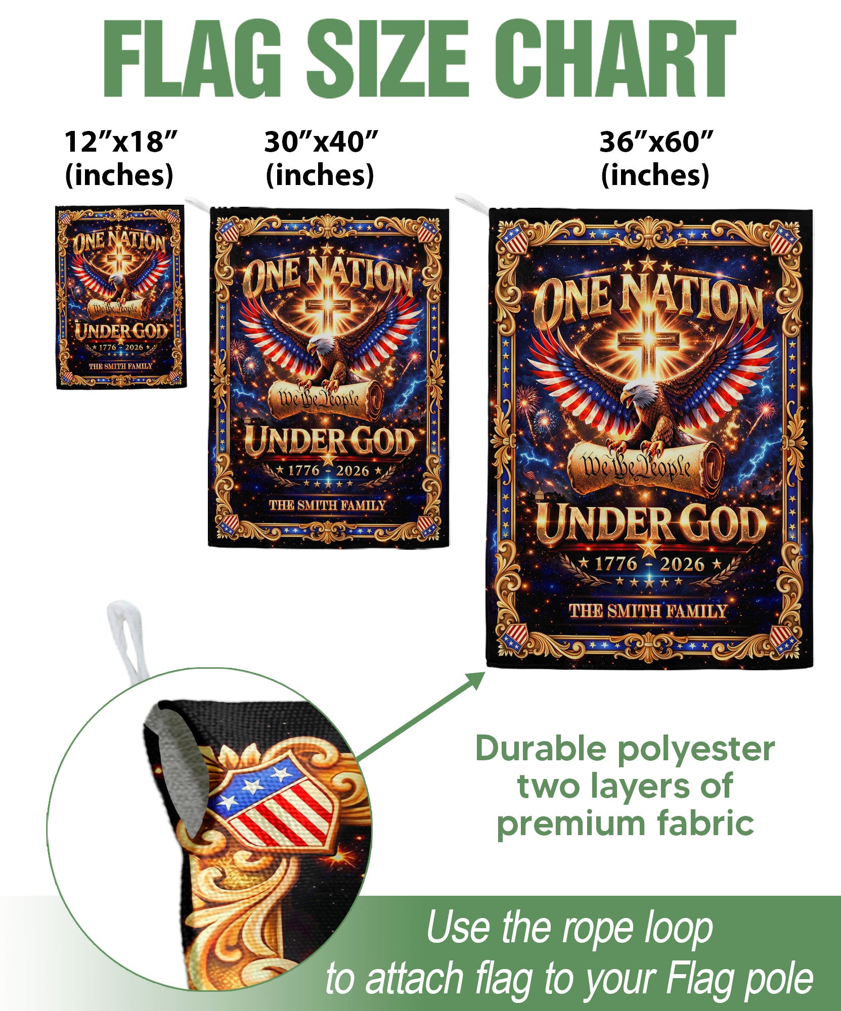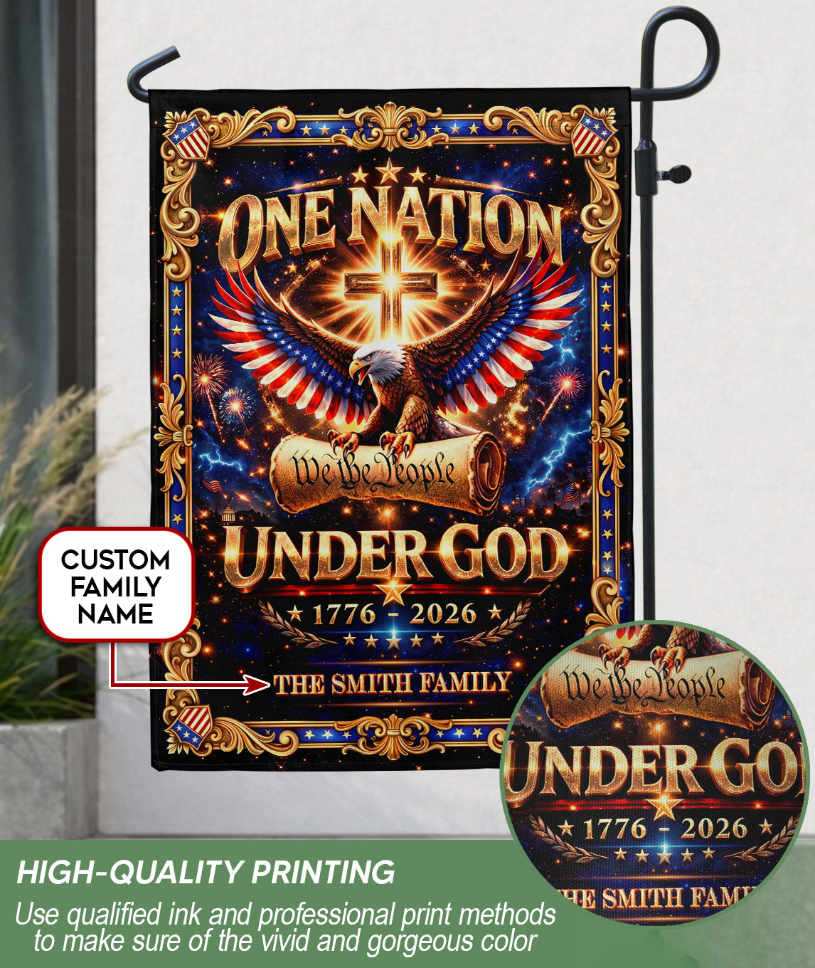 One Nation Under God 250th Anniversary Garden Flag Custom Family Name Eagle Cross We the People 1776-2026