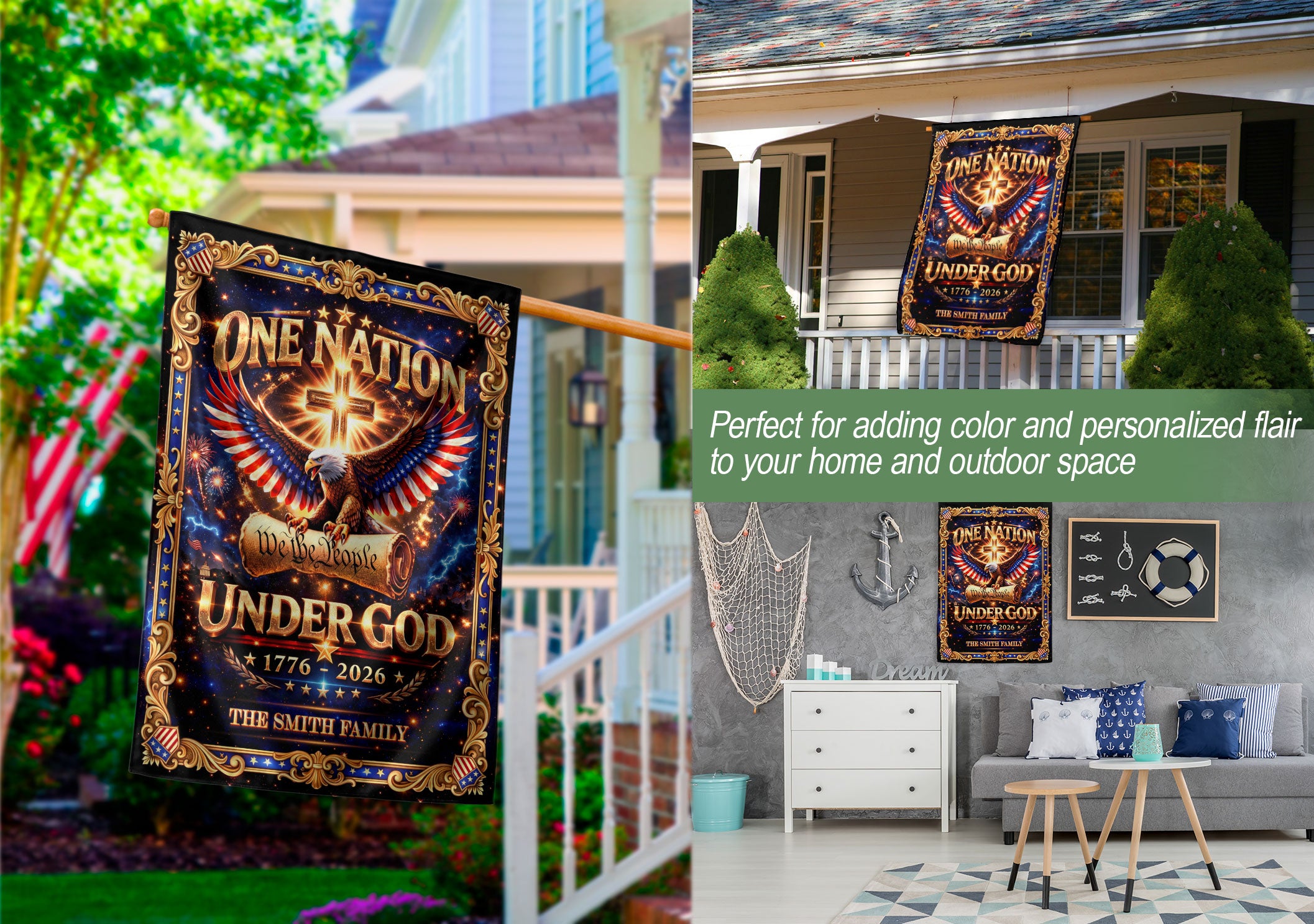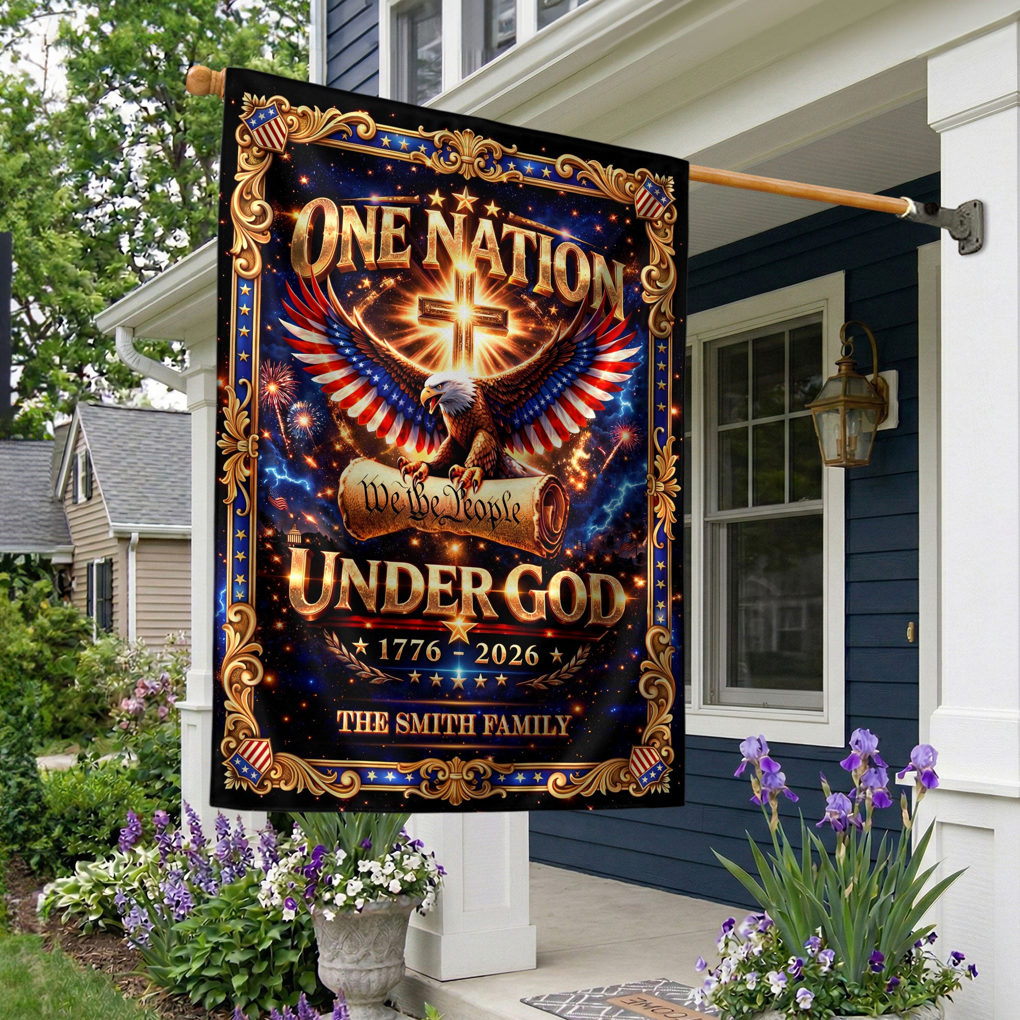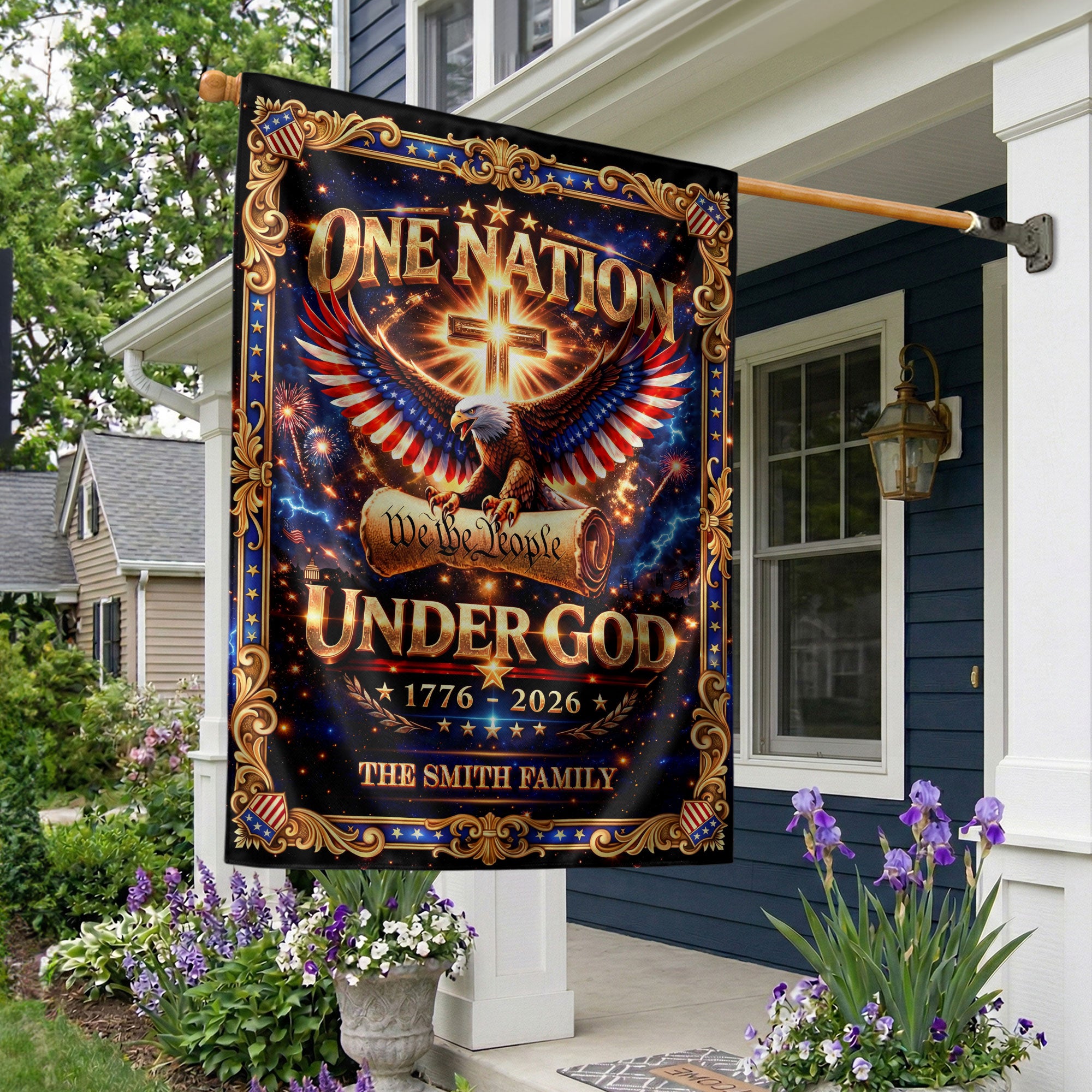 One Nation Under God 250th Anniversary Garden Flag Custom Family Name Eagle Cross We the People 1776-2026