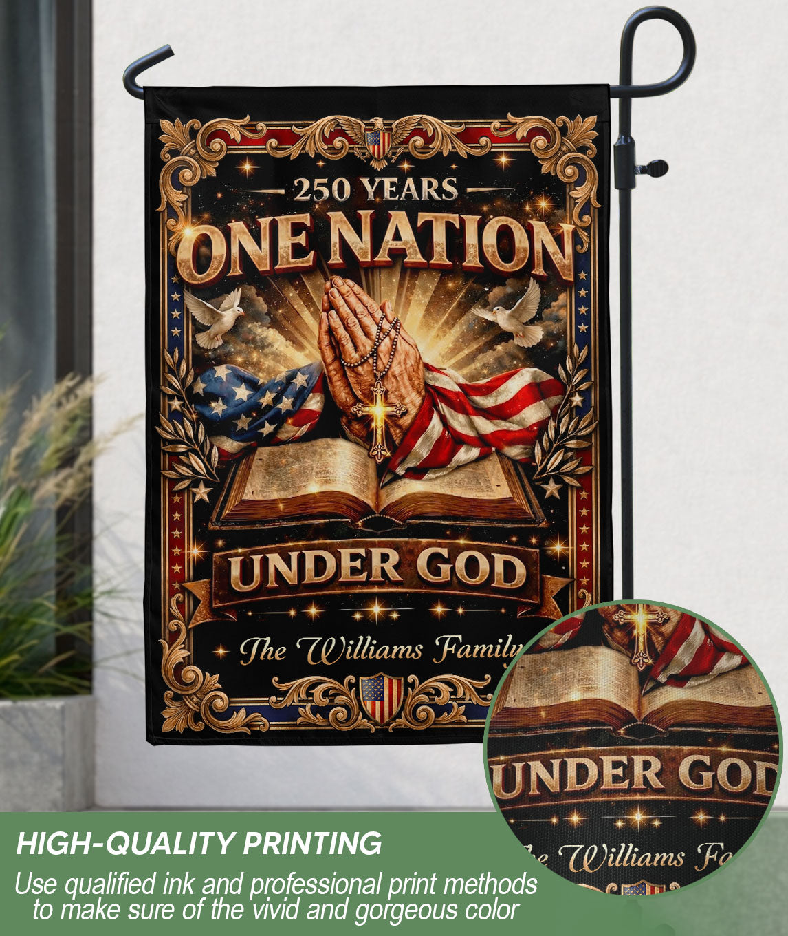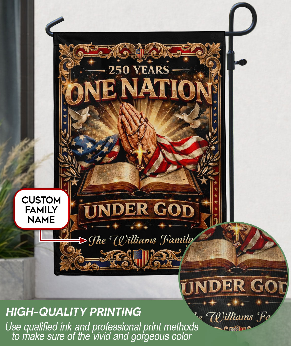 Celebrate America’s 250th anniversary from 1776 to 2026 with this custom family name garden flag. Featuring iconic praying hands, an open Bible, a prominent cross, and the inspiring ‘One Nation Under God’ inscription, this flag honors the nation’s spiritual heritage and historic journey. Personalized with your family name, it’s crafted for durability to withstand outdoor conditions, making it ideal for gardens, porches, patios, or yards. Perfect for patriots, history enthusiasts, or as a meaningful gift for family gatherings, Independence Day, or commemorative events. Easy to display on standard garden flag poles (not included). Show your faith and pride in this limited-edition design.