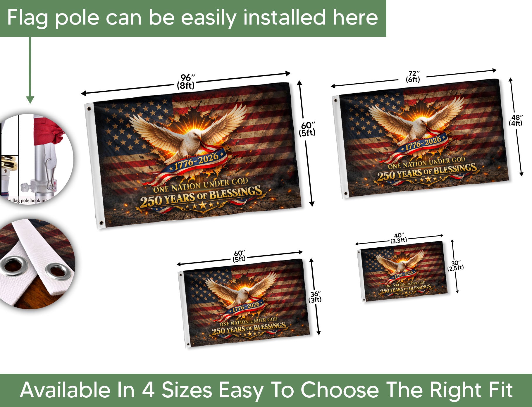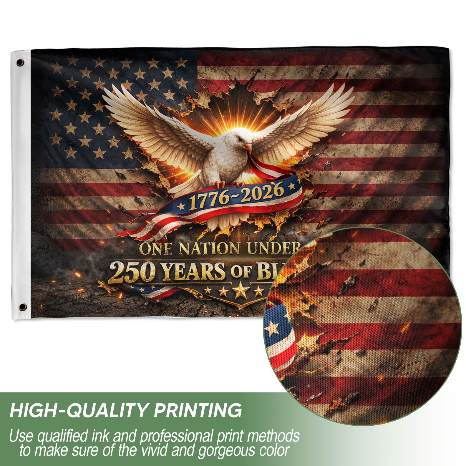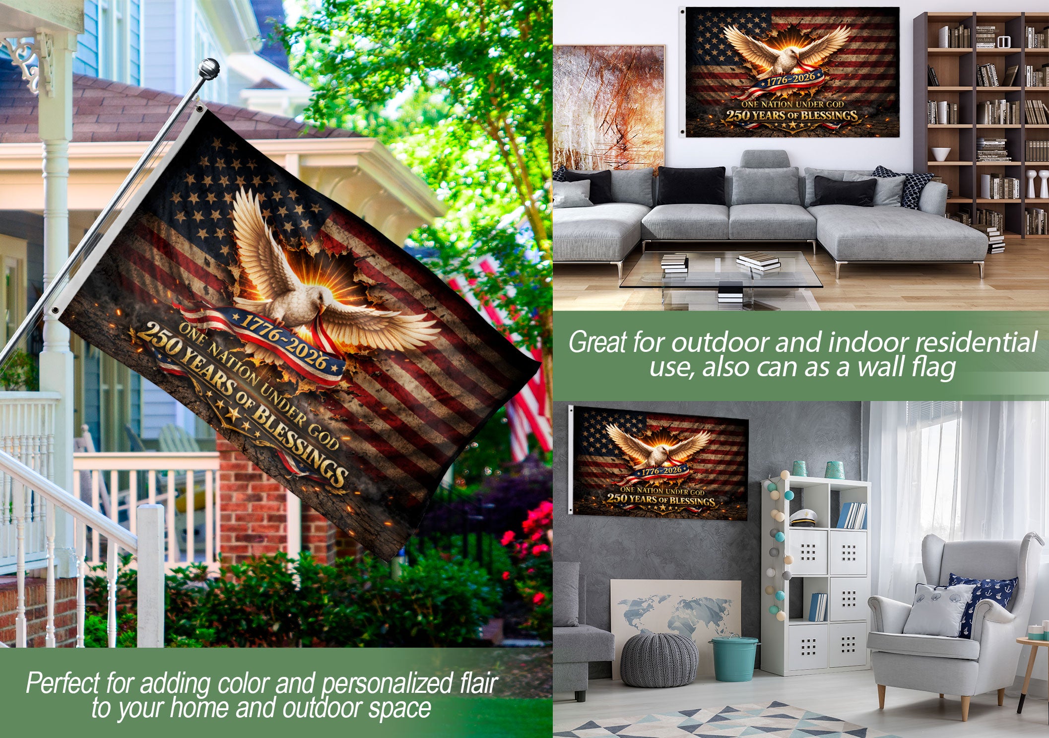 Celebrate America’s 250th anniversary with this One Nation Under God house flag, spanning 1776-2026. The design features a majestic white eagle soaring proudly against a backdrop of stars and stripes, symbolizing freedom, faith, and national pride. Perfect for patriotic decor on porches, gardens, or homes during holidays, Independence Day, or everyday display. Crafted for outdoor durability, this commemorative flag withstands weather while showcasing blessings and American heritage. Ideal for patriots honoring 250 years of USA history.