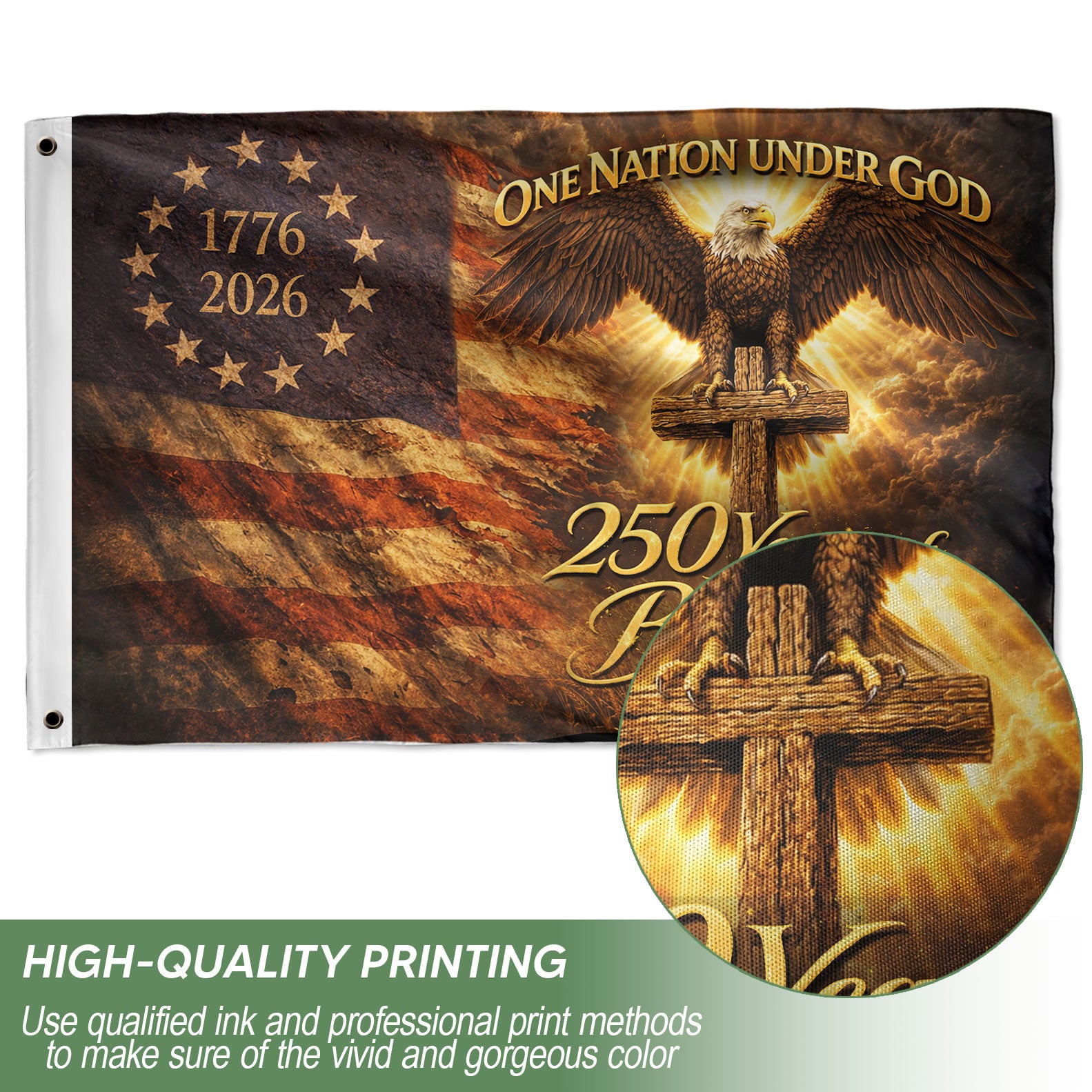Celebrate faith, freedom, and American pride with this Patriotic Christian House Flag. Featuring a majestic eagle perched on a cross under the bold text ‘One Nation Under God,’ set against a vintage American flag background. It commemorates the journey from 1776 to 2026, ideal for the USA 250th anniversary. Perfect for displaying on your porch, yard, or home to showcase your Christian values and patriotism. Durable design suitable for outdoor use, bringing blessings and inspiration to your decor. High-quality printed flag that withstands weather while maintaining vibrant colors and details.
