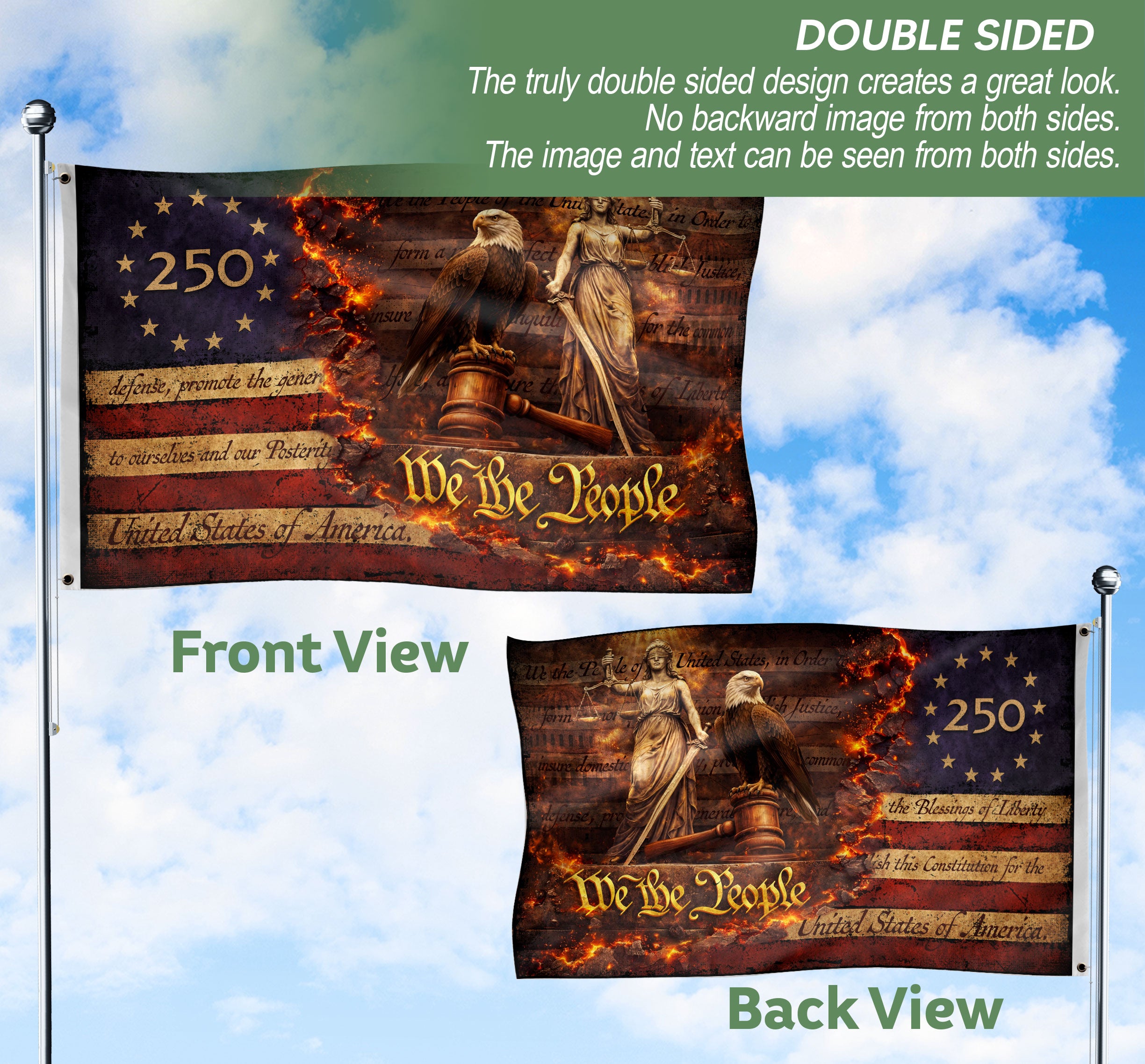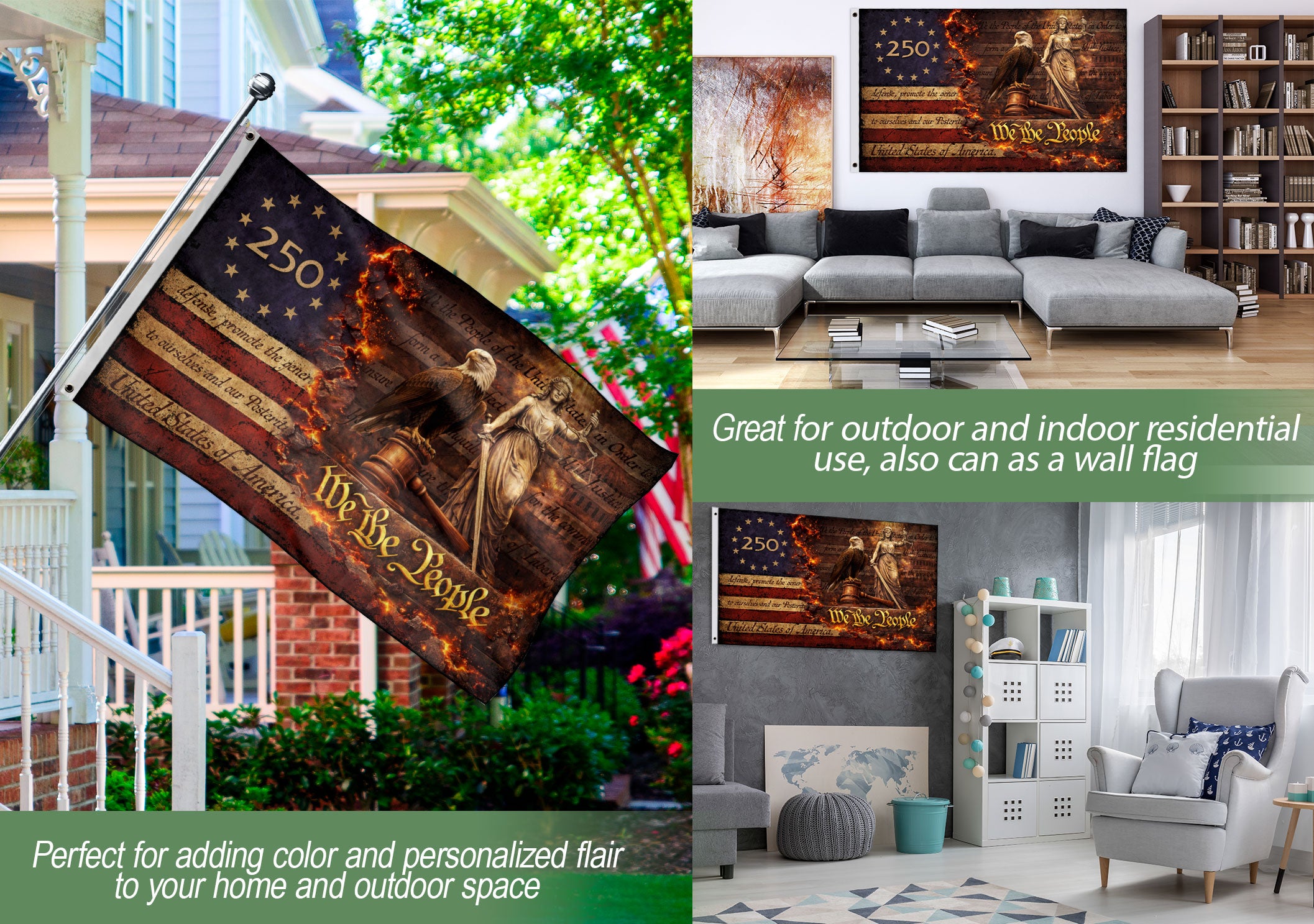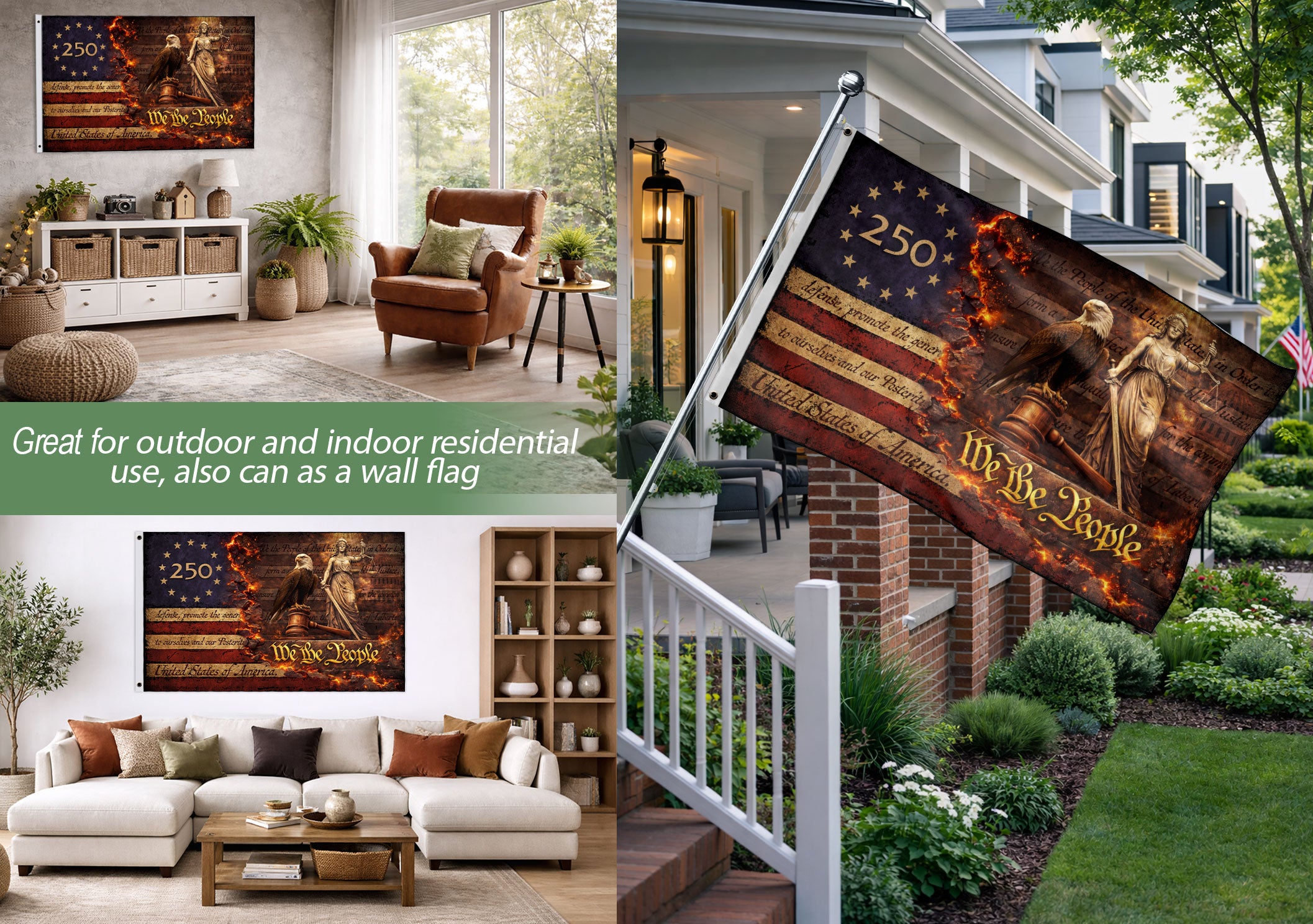 Celebrate 250 years of American blessings with this Patriotic Eagle Justice House Flag, commemorating the journey from 1776 to 2026. The striking design features a majestic bald eagle perched on a gavel alongside the iconic Lady Justice statue, embodying the enduring principles of ‘We The People.’ Perfect for displaying outside your home to honor U.S. history, independence, and justice. Crafted for outdoor durability, this house flag withstands weather elements while adding a bold patriotic statement to your porch, garden, or entryway. Ideal for July 4th celebrations, historical anniversaries, or everyday pride in American values. Easy to hang on standard house flag poles.