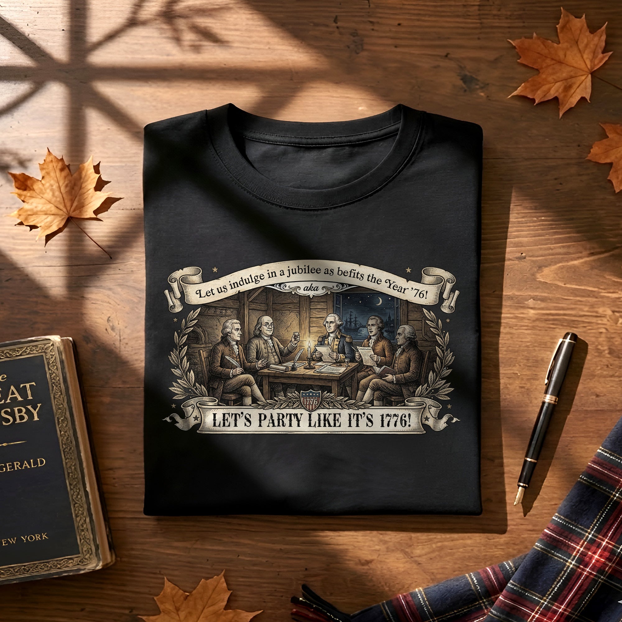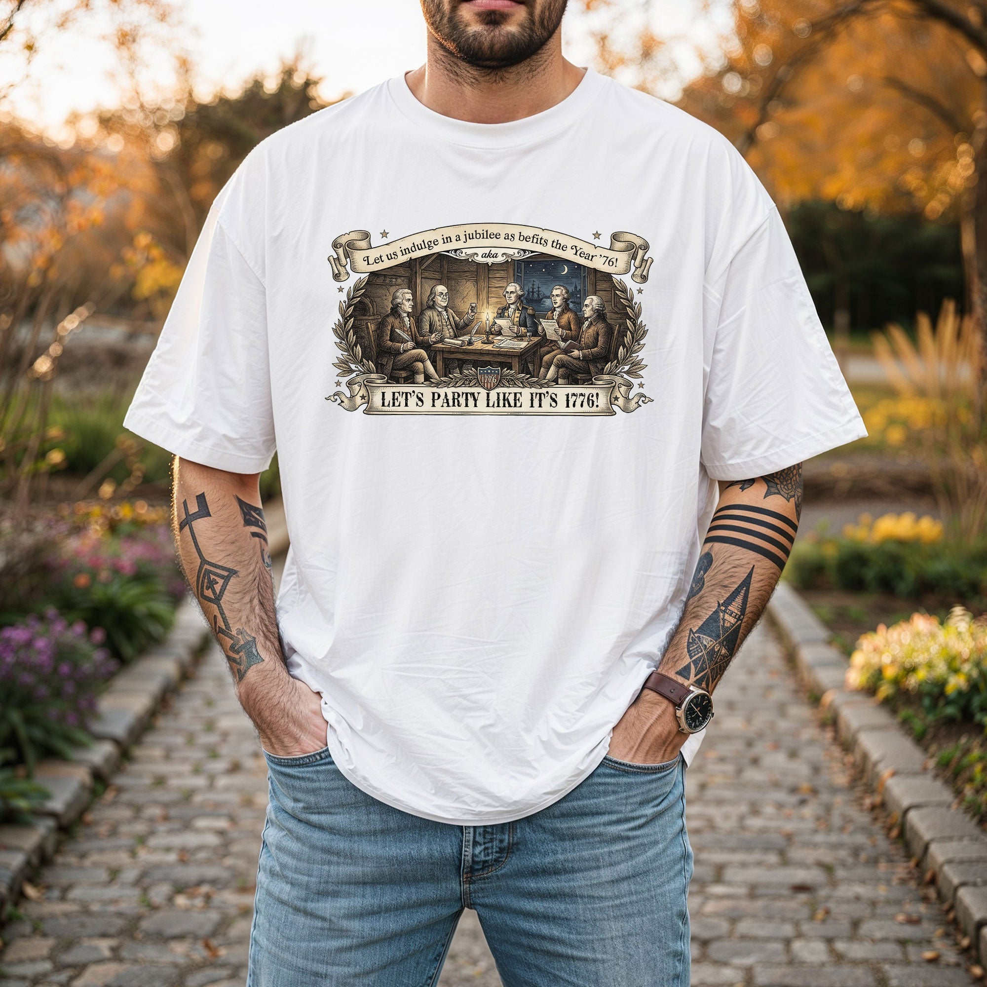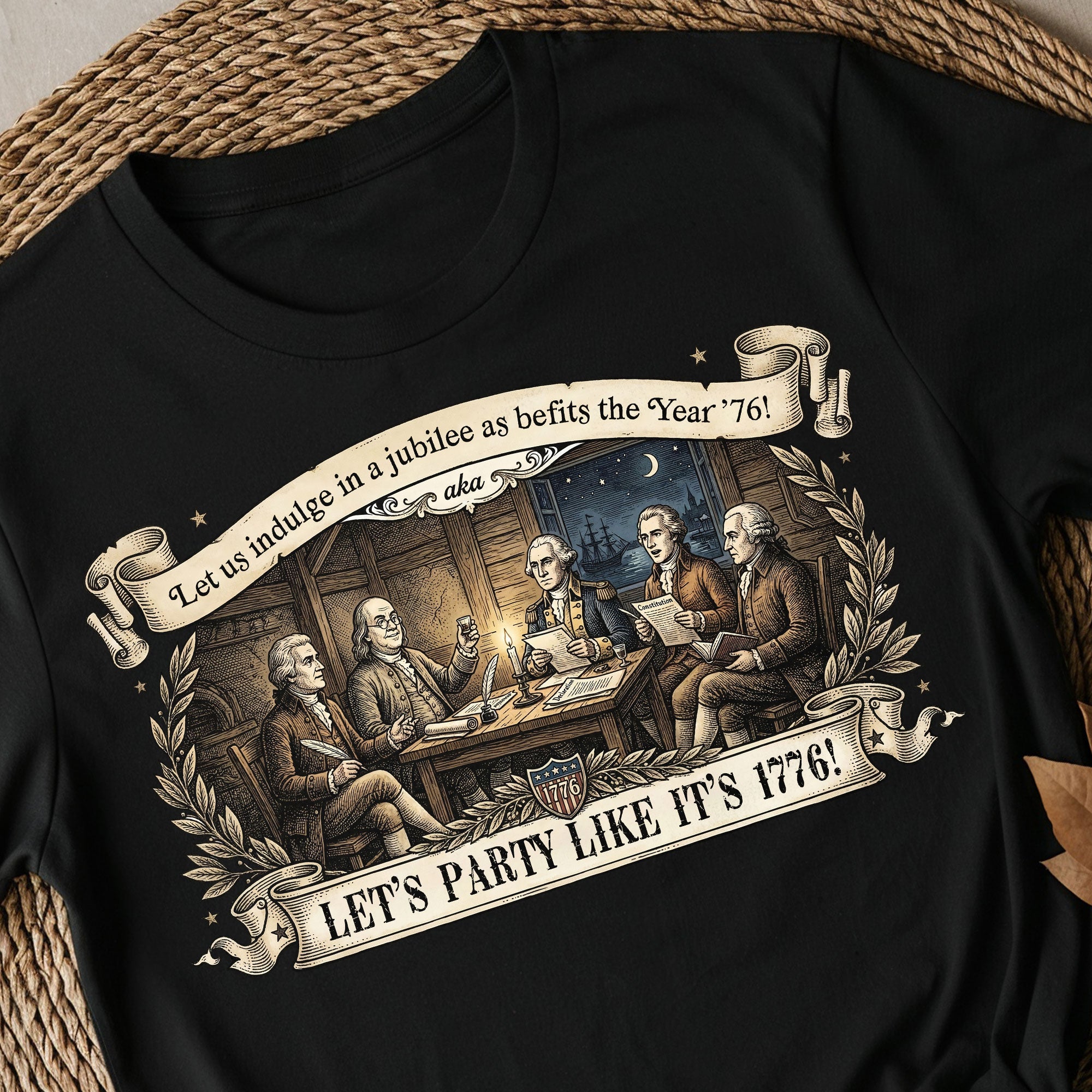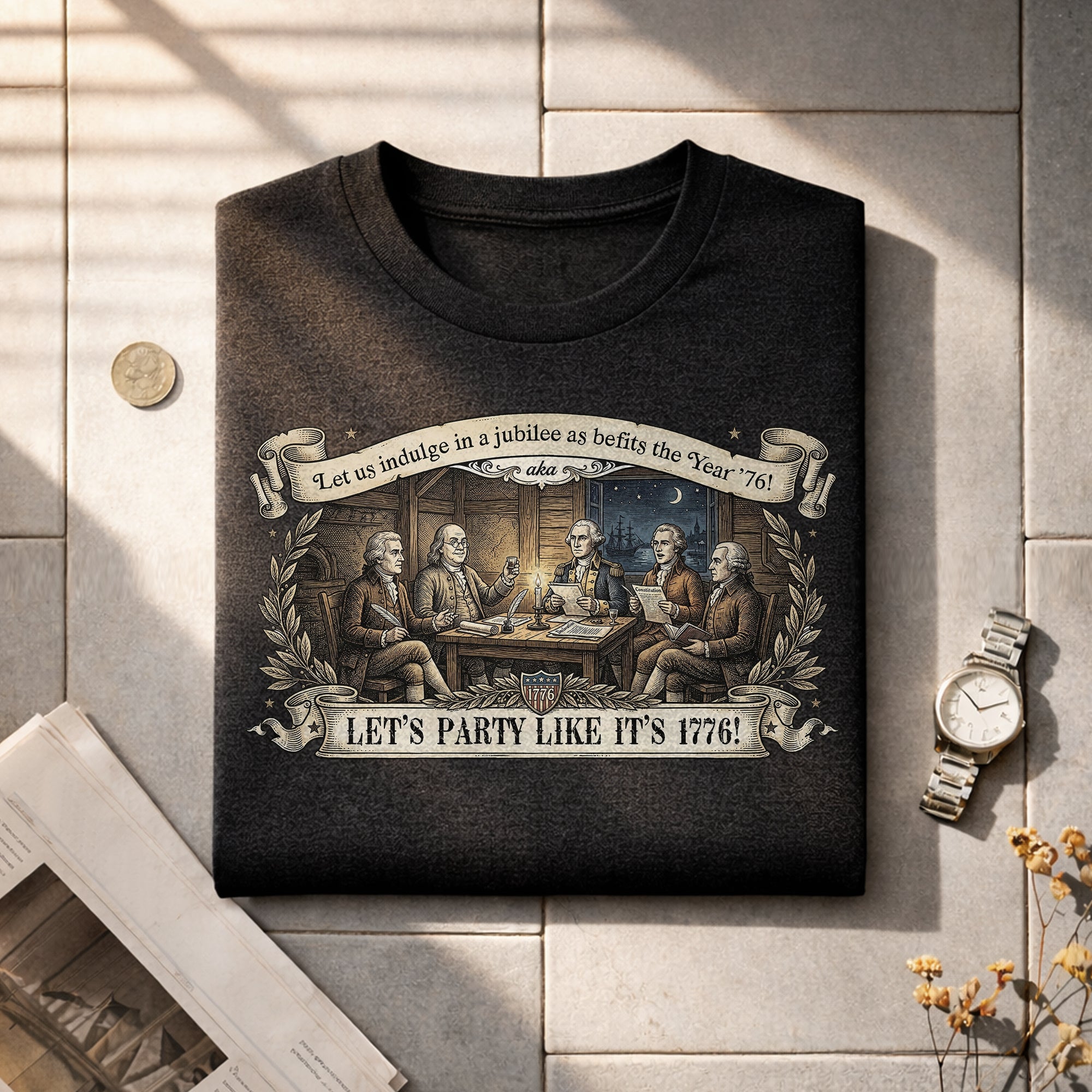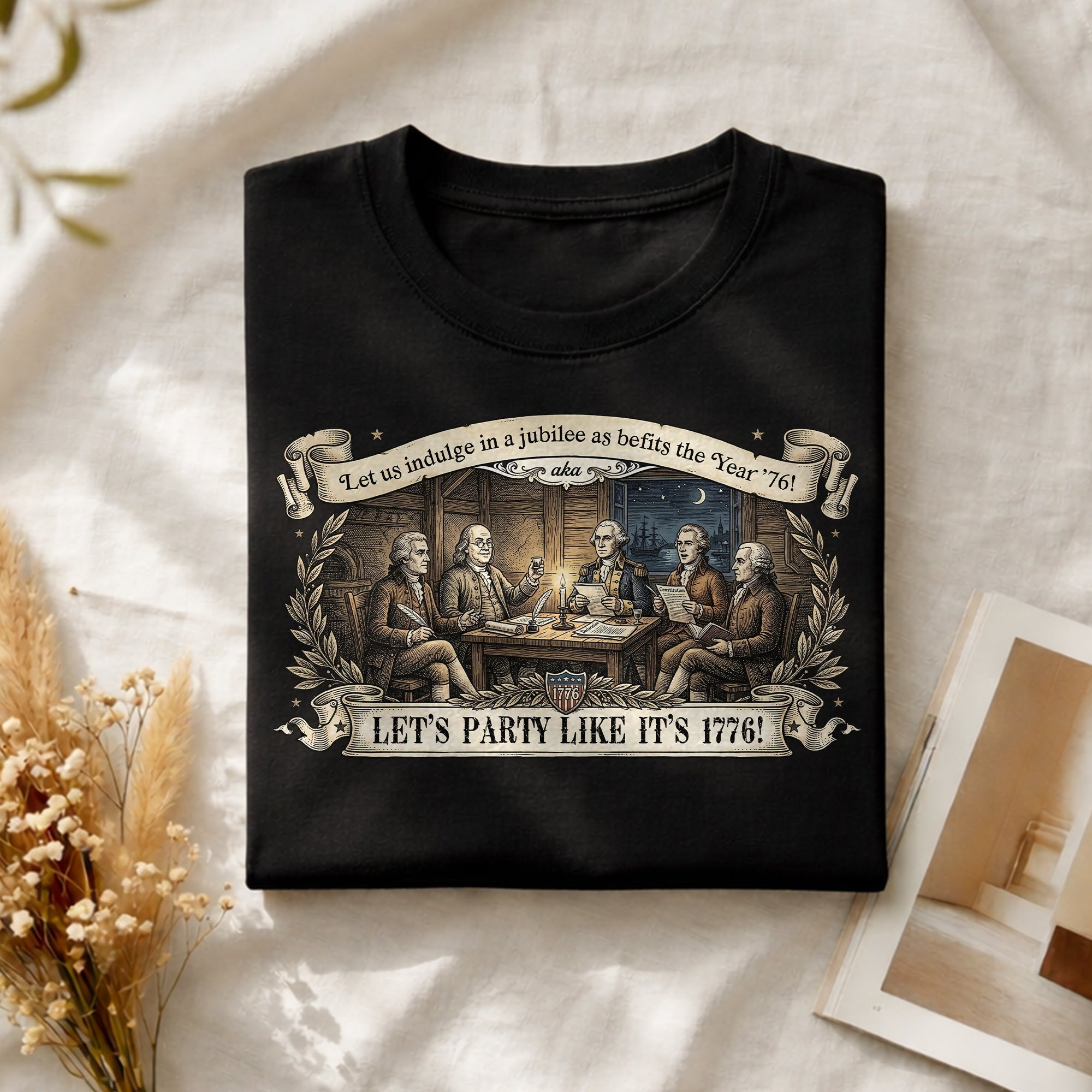 Celebrate American history with this vintage Founding Fathers 1776 T-shirt. Featuring a classic historical illustration and the bold phrase “Let’s Party Like It’s 1776,” this unisex tee captures the spirit of independence and patriotism. Crafted from soft, comfortable cotton blend fabric, it’s perfect for everyday wear, Independence Day celebrations, 4th of July parties, history enthusiasts, and showing American pride. Available in multiple sizes for men, women, and all patriots. Ideal for barbecues, historical events, or casual outings. Durable print ensures long-lasting vibrancy through washes. Embrace the revolutionary vibe with this timeless patriotic apparel piece.