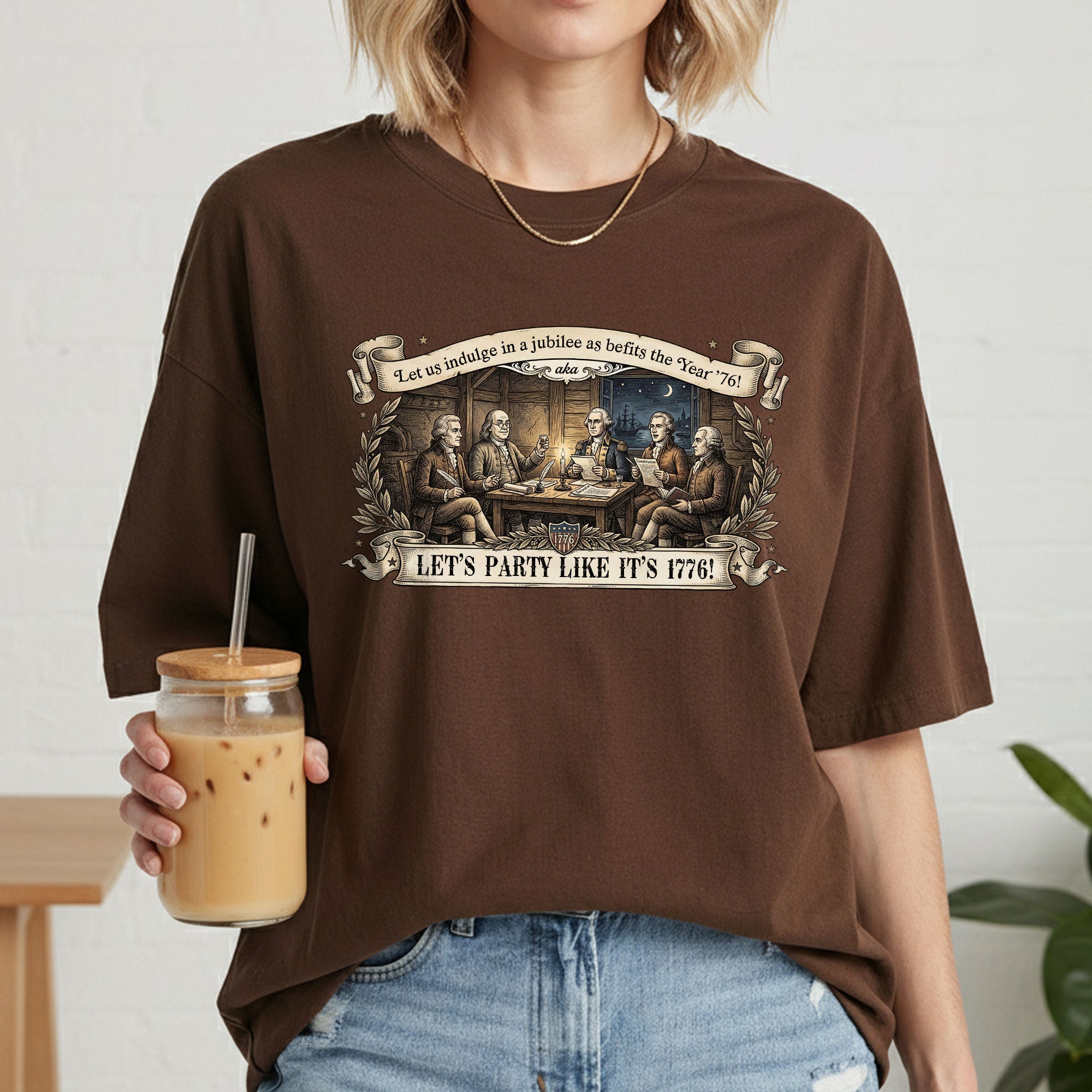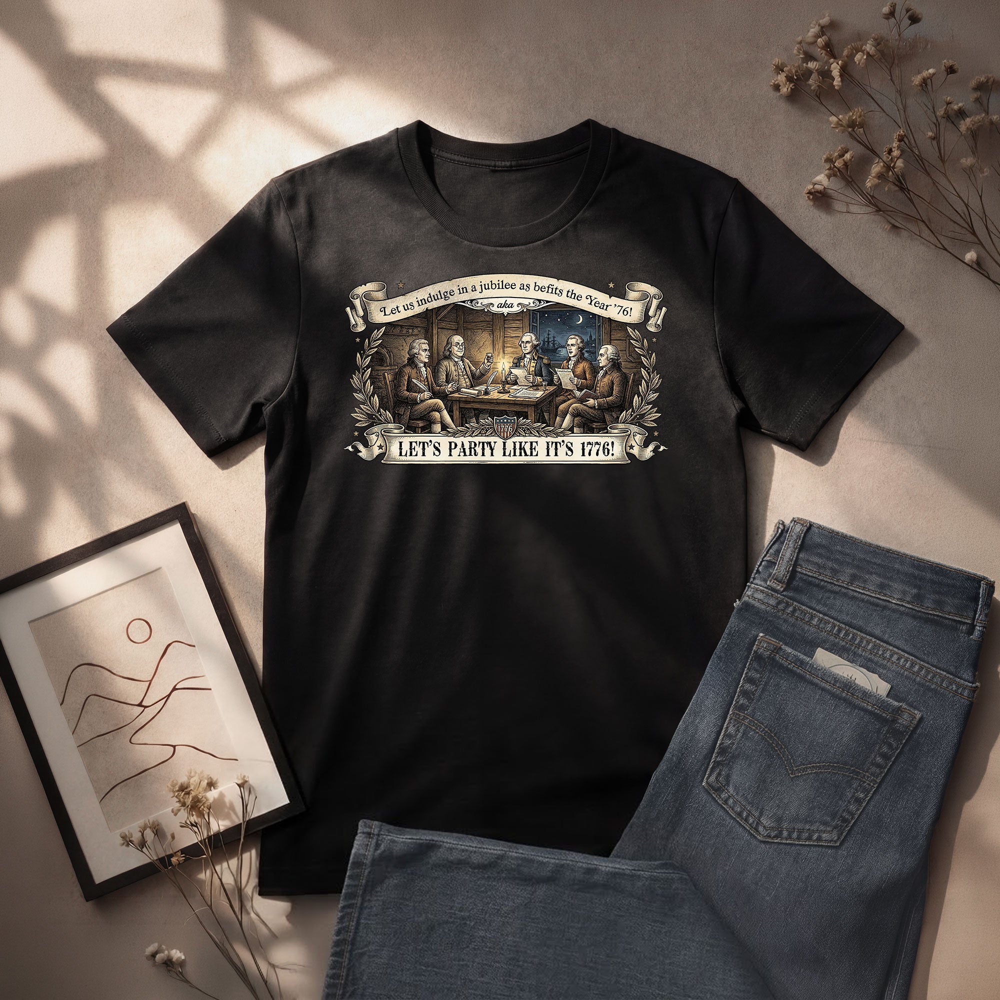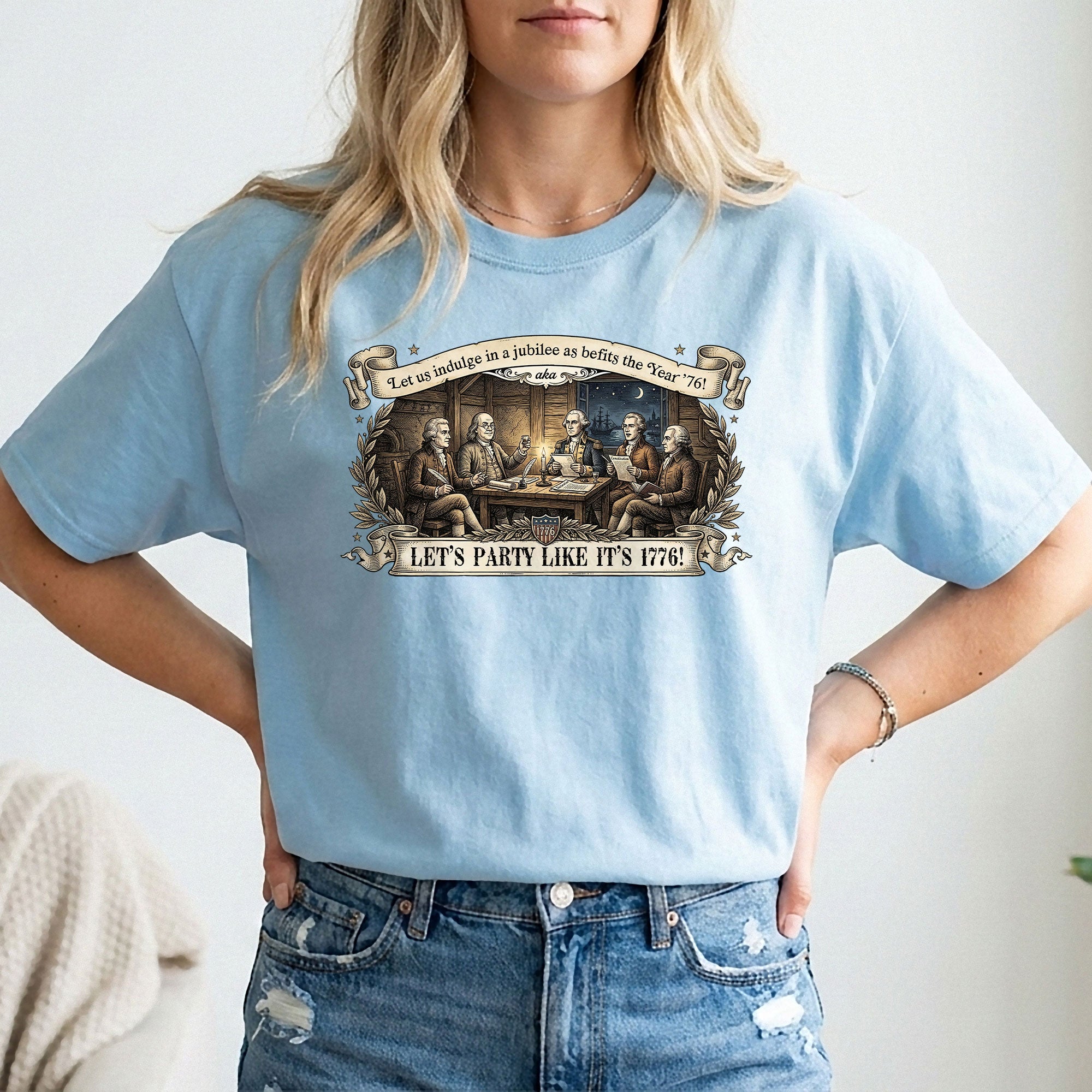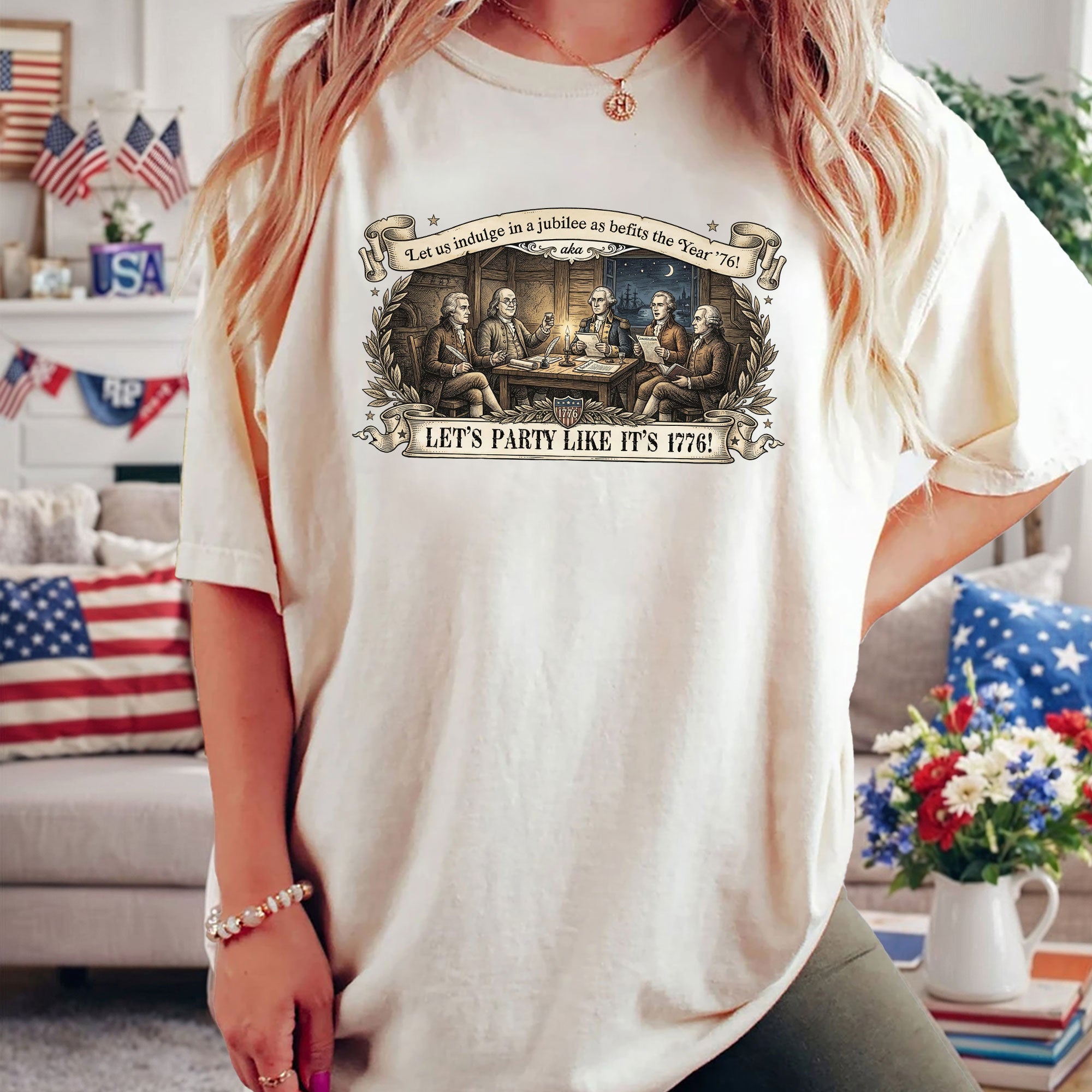 Celebrate American history with this vintage Founding Fathers 1776 T-shirt. Featuring a classic historical illustration and the bold phrase “Let’s Party Like It’s 1776,” this unisex tee captures the spirit of independence and patriotism. Crafted from soft, comfortable cotton blend fabric, it’s perfect for everyday wear, Independence Day celebrations, 4th of July parties, history enthusiasts, and showing American pride. Available in multiple sizes for men, women, and all patriots. Ideal for barbecues, historical events, or casual outings. Durable print ensures long-lasting vibrancy through washes. Embrace the revolutionary vibe with this timeless patriotic apparel piece.