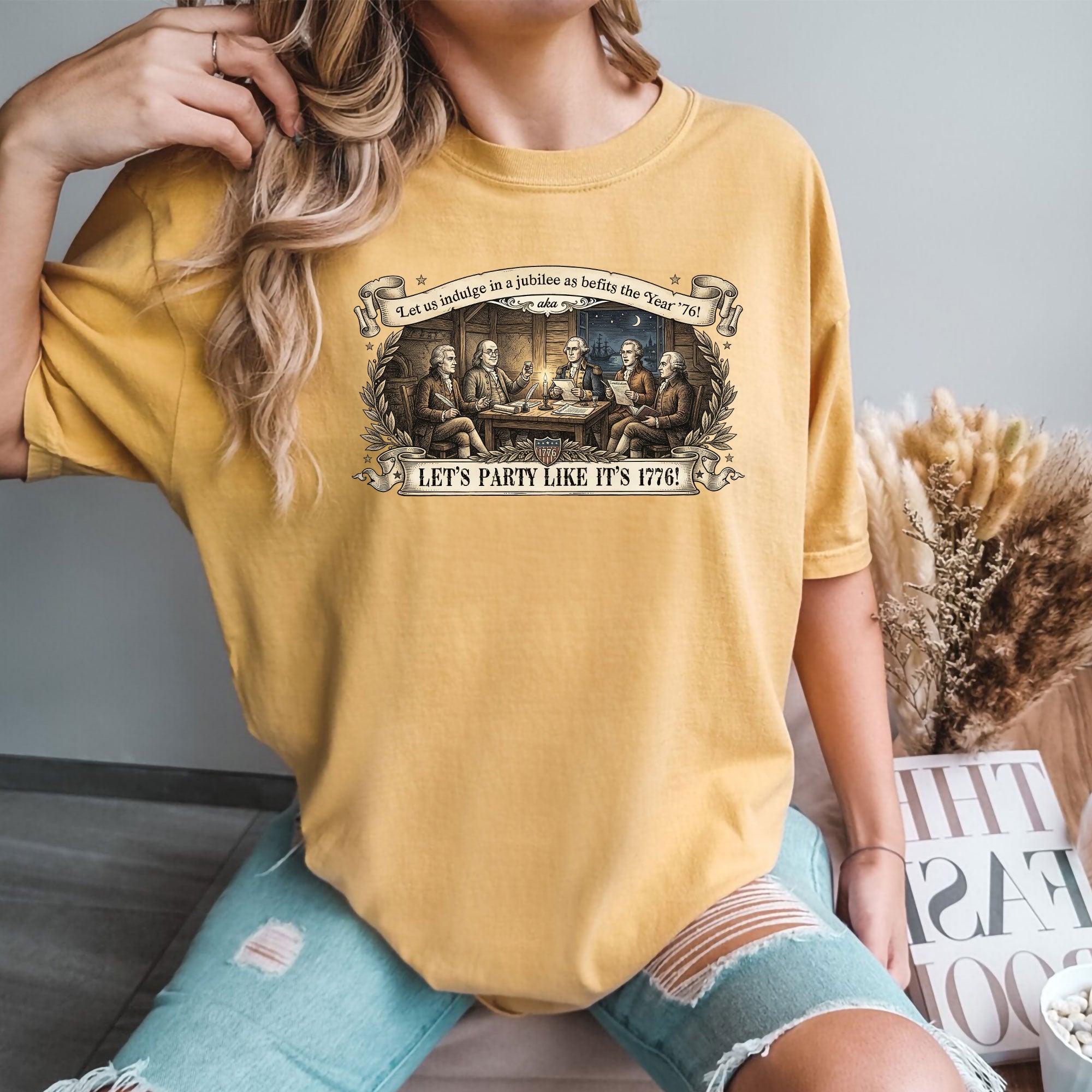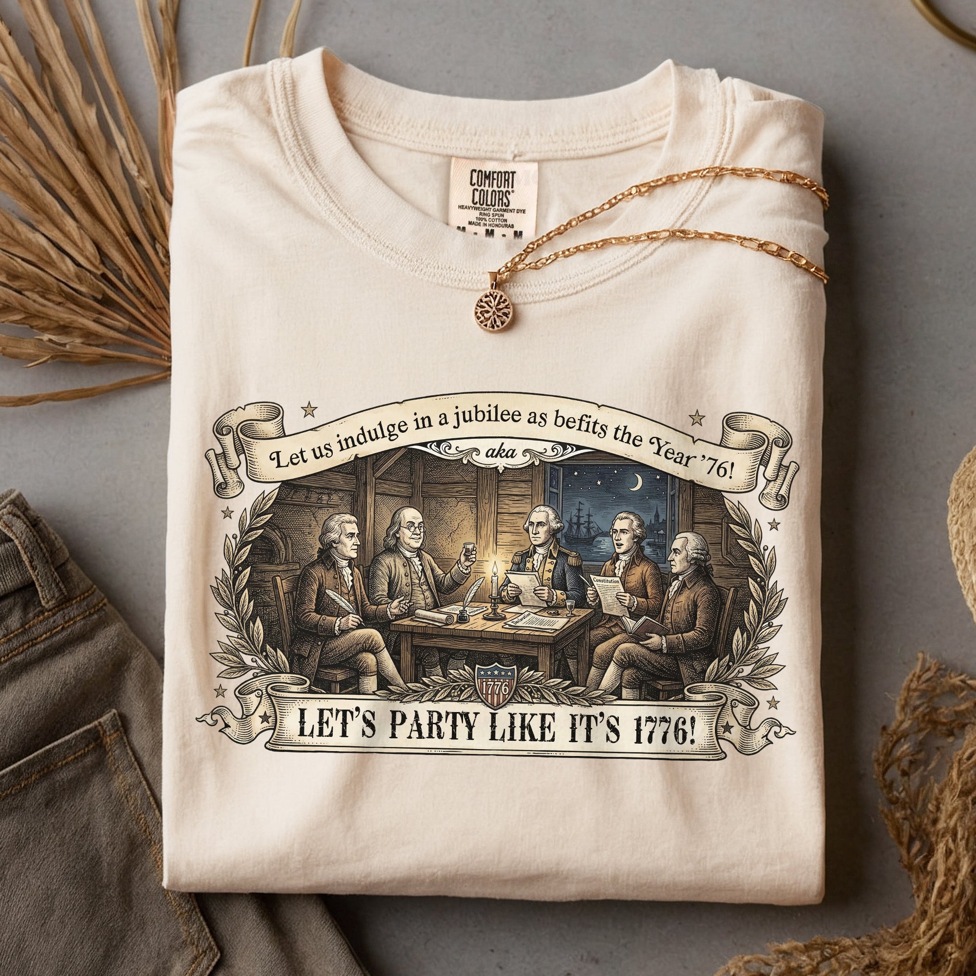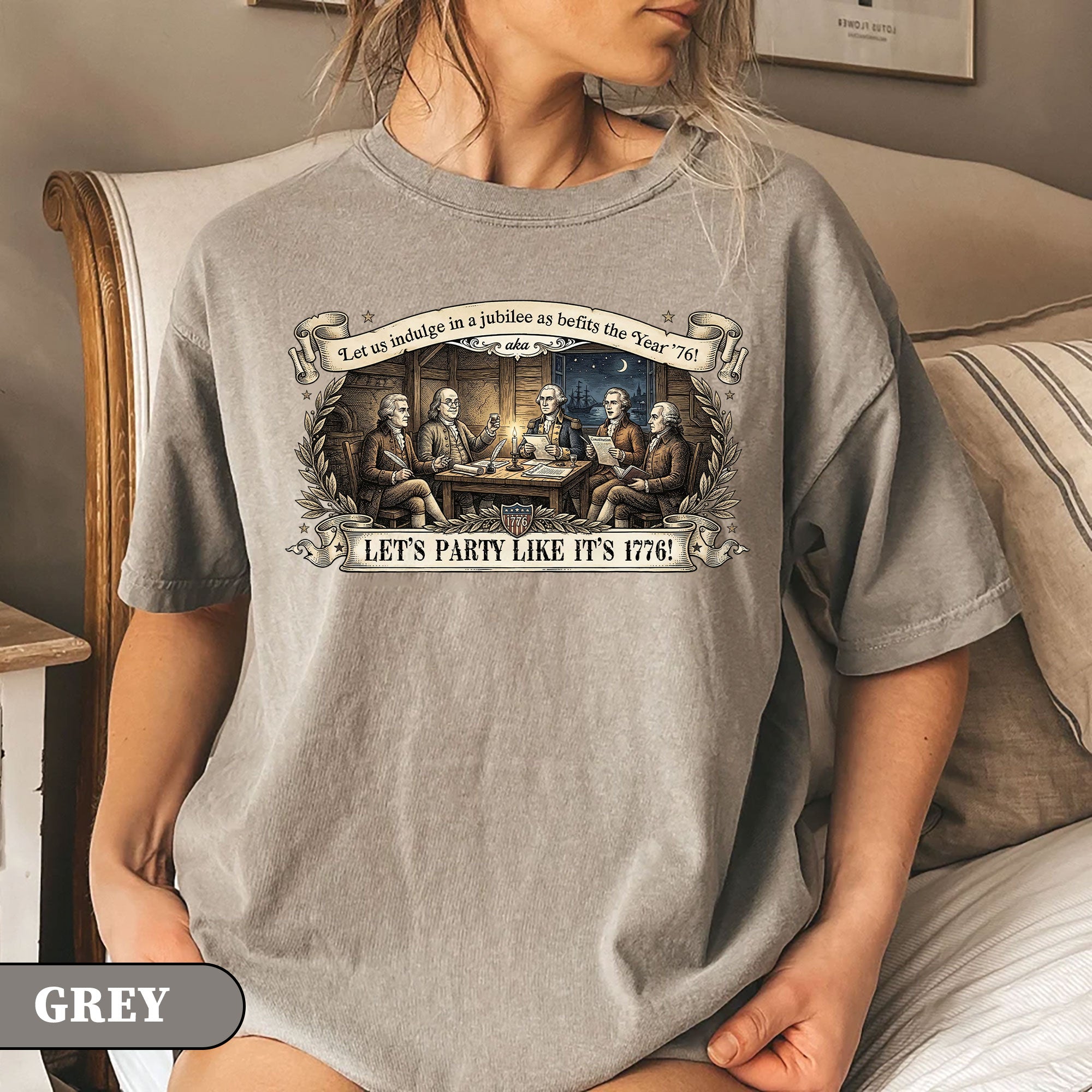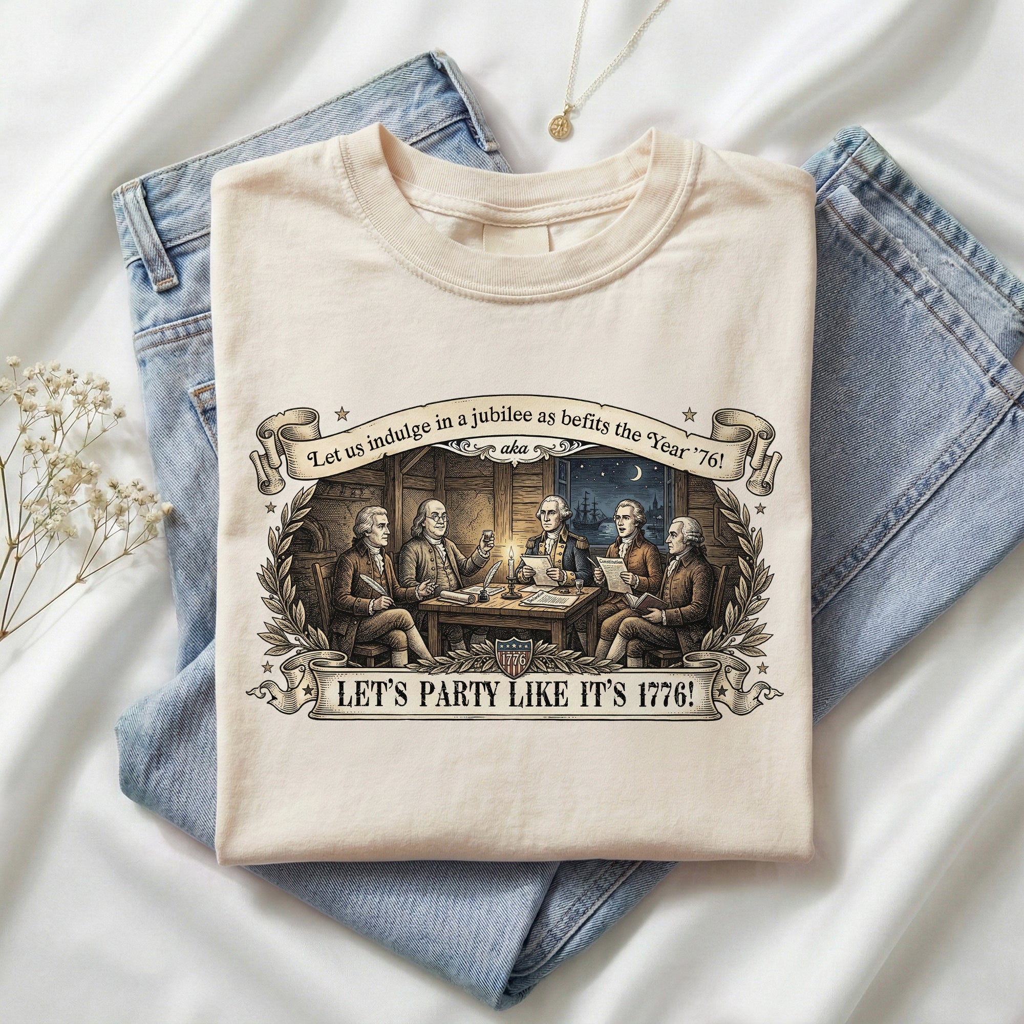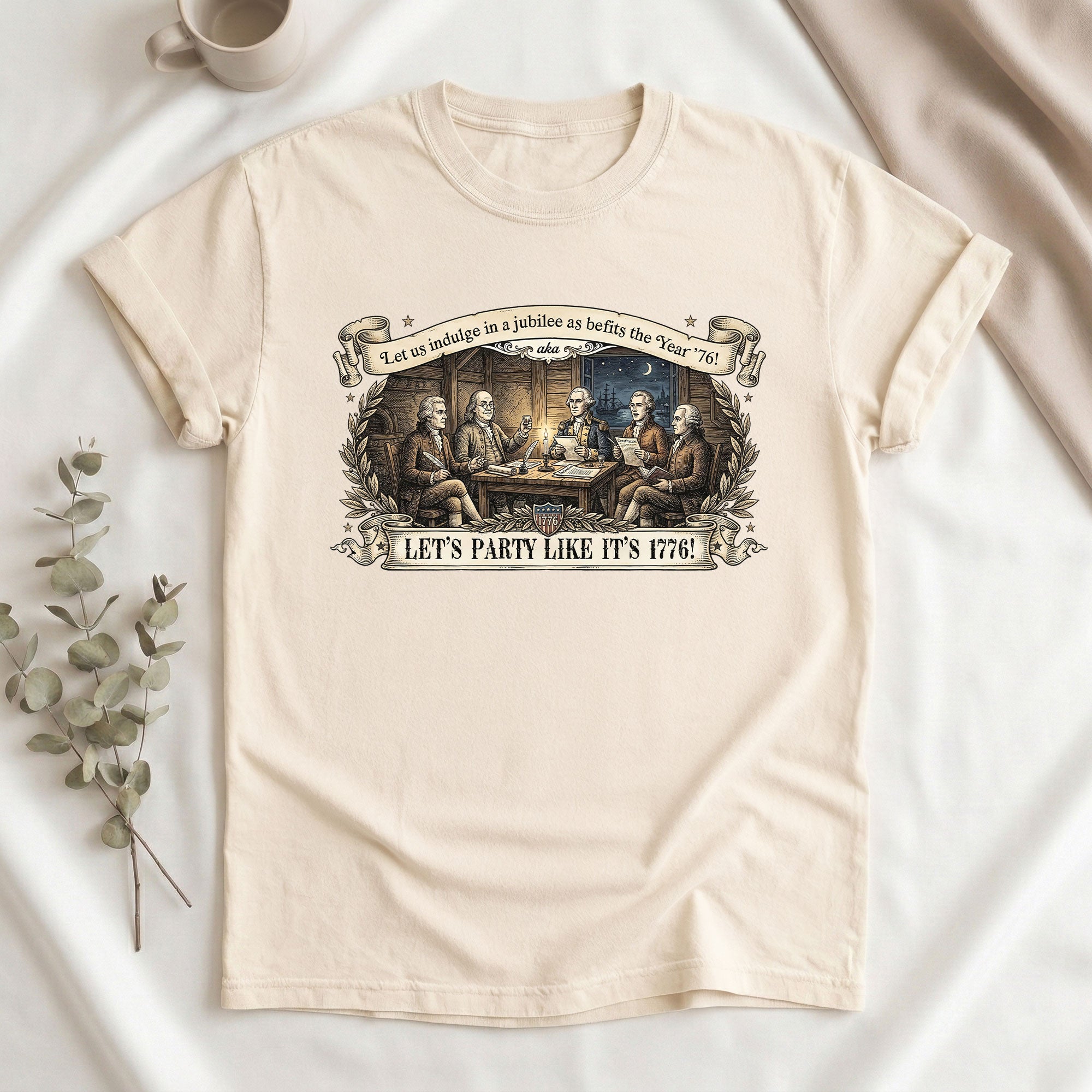 Celebrate American history with this vintage Founding Fathers 1776 T-shirt. Featuring a classic historical illustration and the bold phrase “Let’s Party Like It’s 1776,” this unisex tee captures the spirit of independence and patriotism. Crafted from soft, comfortable cotton blend fabric, it’s perfect for everyday wear, Independence Day celebrations, 4th of July parties, history enthusiasts, and showing American pride. Available in multiple sizes for men, women, and all patriots. Ideal for barbecues, historical events, or casual outings. Durable print ensures long-lasting vibrancy through washes. Embrace the revolutionary vibe with this timeless patriotic apparel piece.