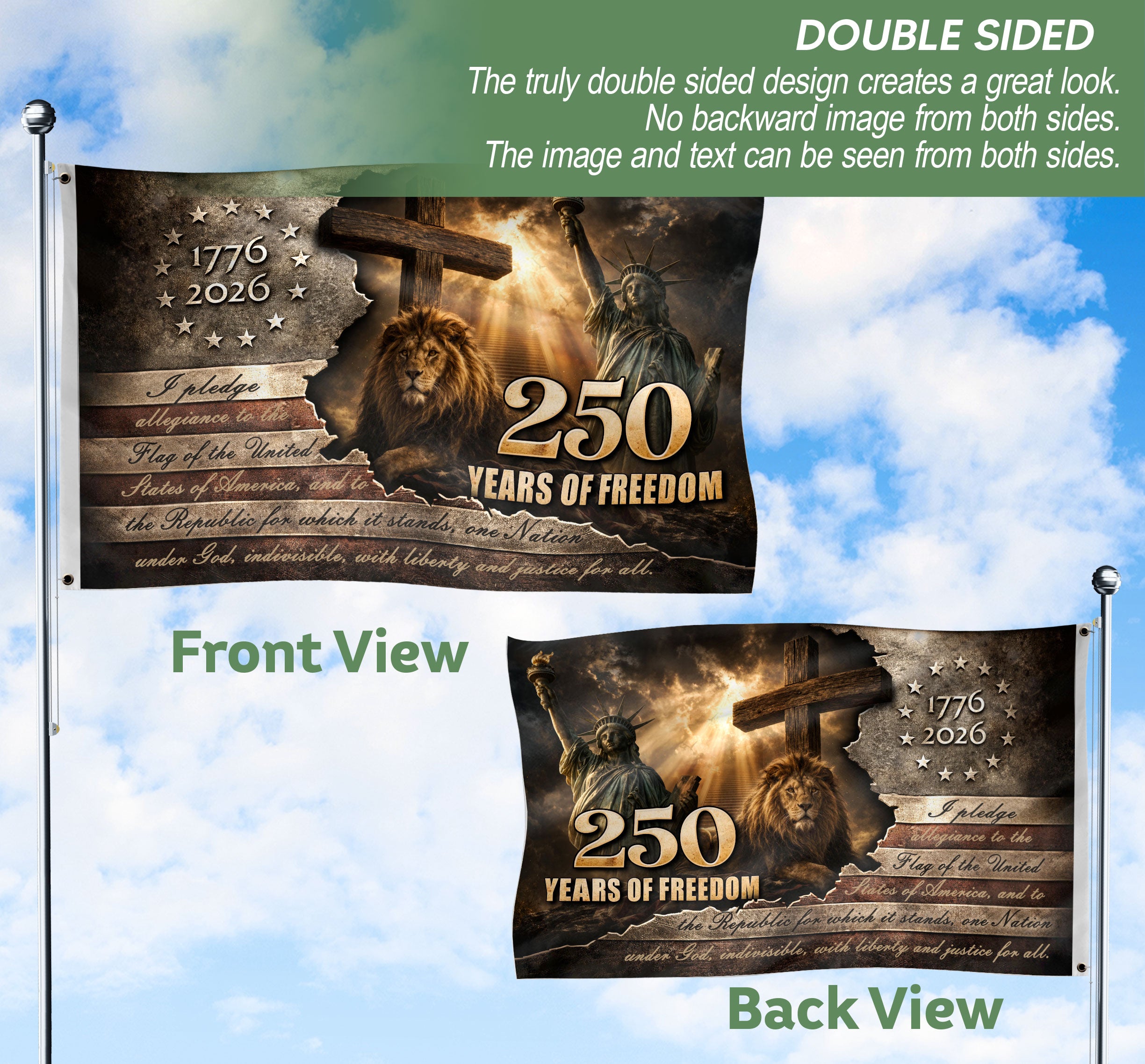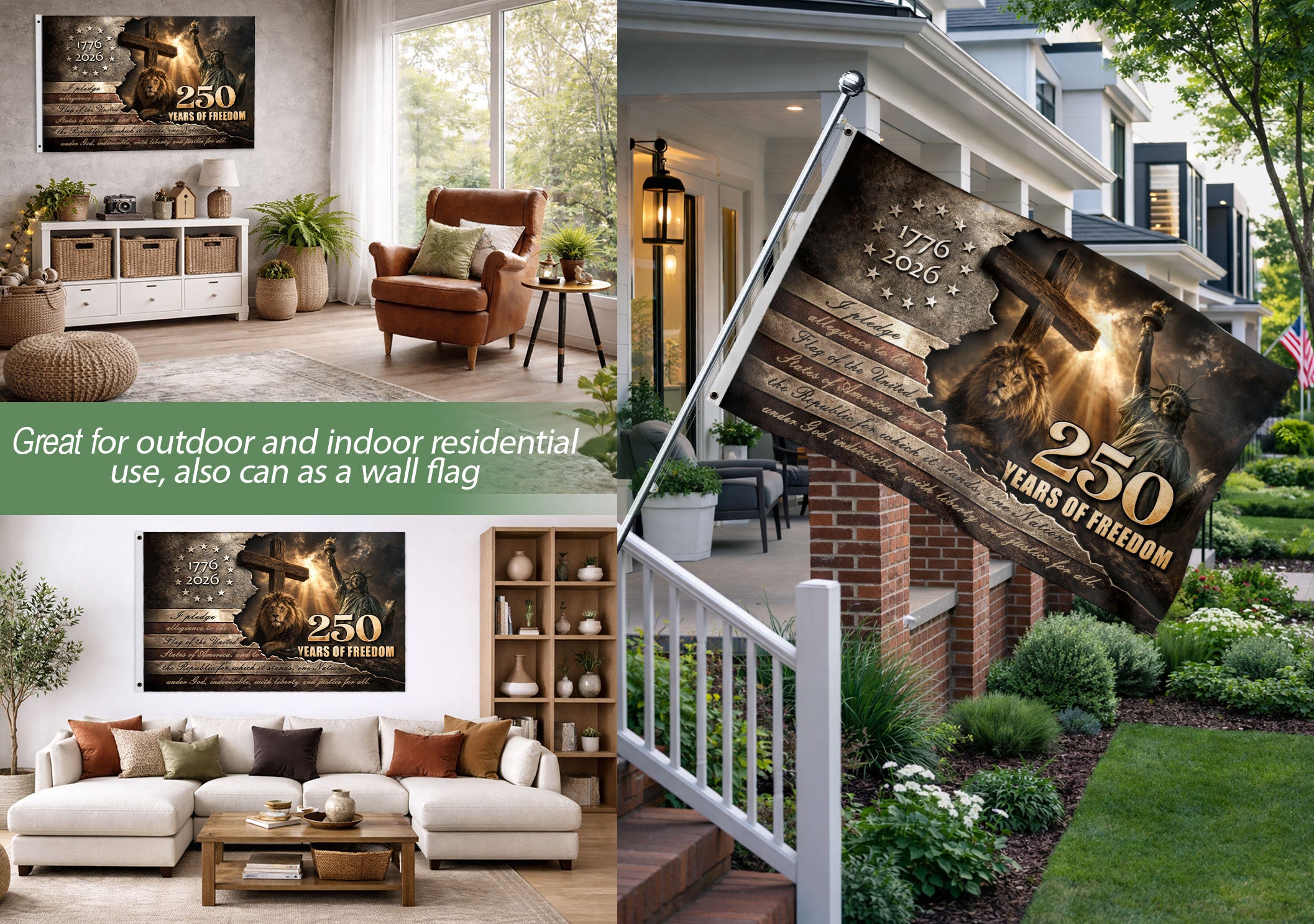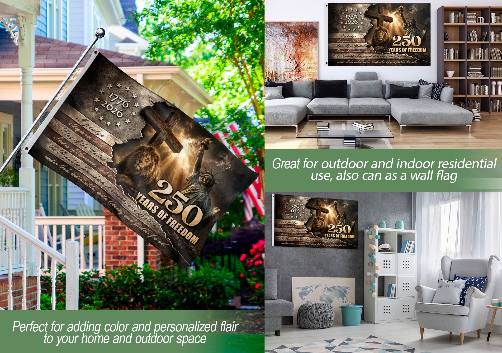 Celebrate America’s enduring spirit with this Patriotic Lion Cross House Flag, featuring a majestic Lion of Judah resting at the base of a rustic wooden cross. The dramatic vintage stars-and-stripes backdrop honors the historic milestone from 1776 to 2026, marking 250 years of freedom under the motto ‘One Nation Under God.’ Perfect for displaying outside your home to showcase national pride, this garden flag is crafted for durability and weather resistance, making it an ideal gift for patriots, history enthusiasts, and Fourth of July celebrations. The bold design combines religious symbolism with American patriotism, creating a powerful statement piece for porches, yards, or patios.
