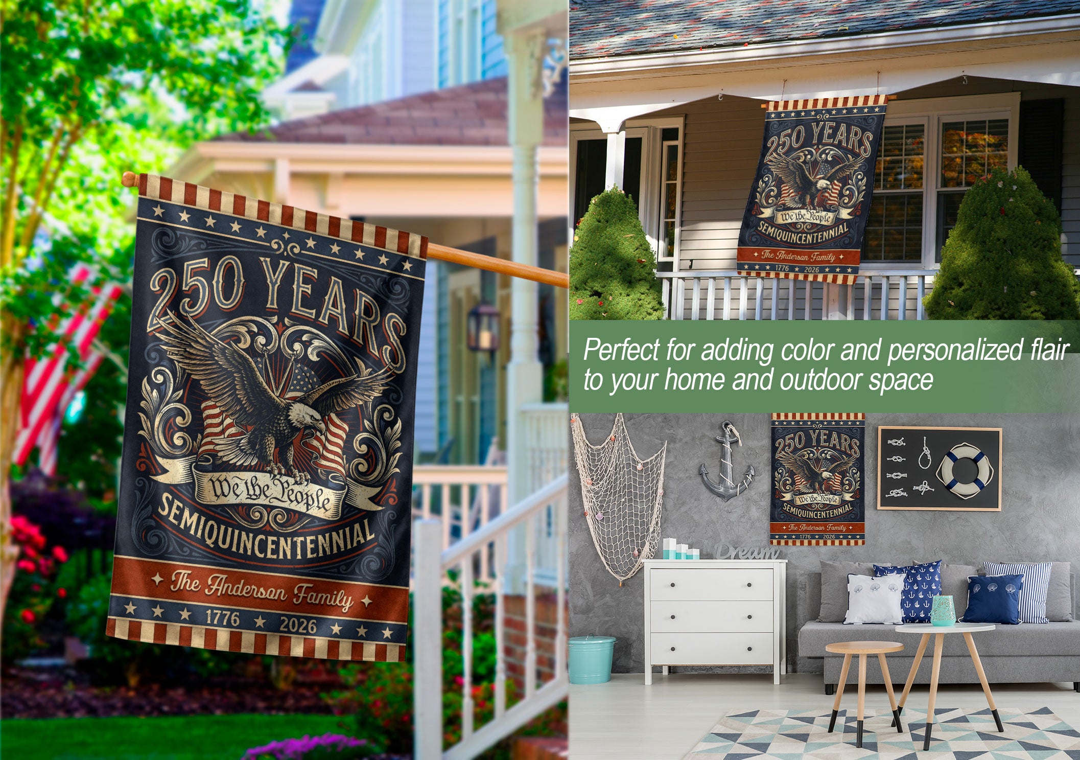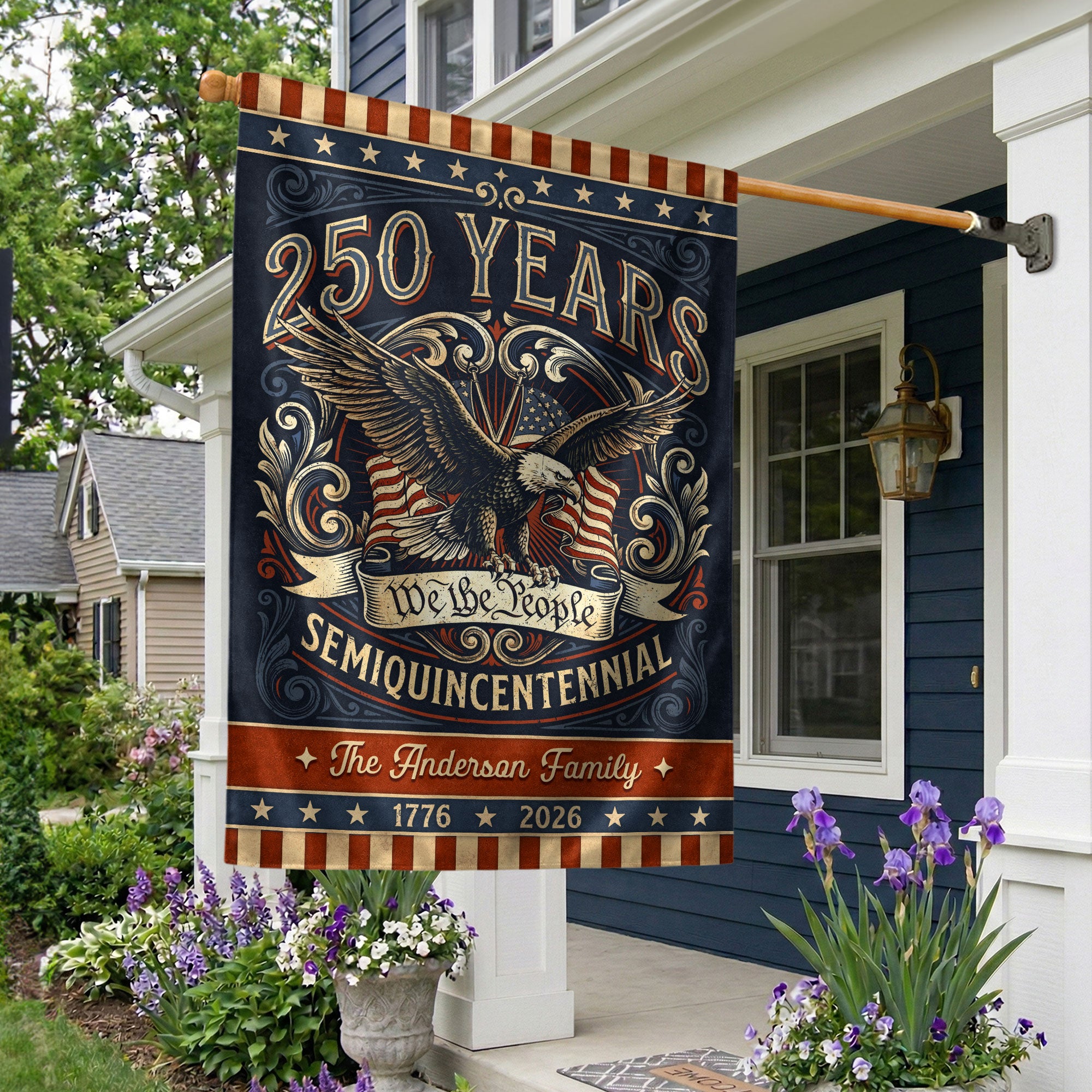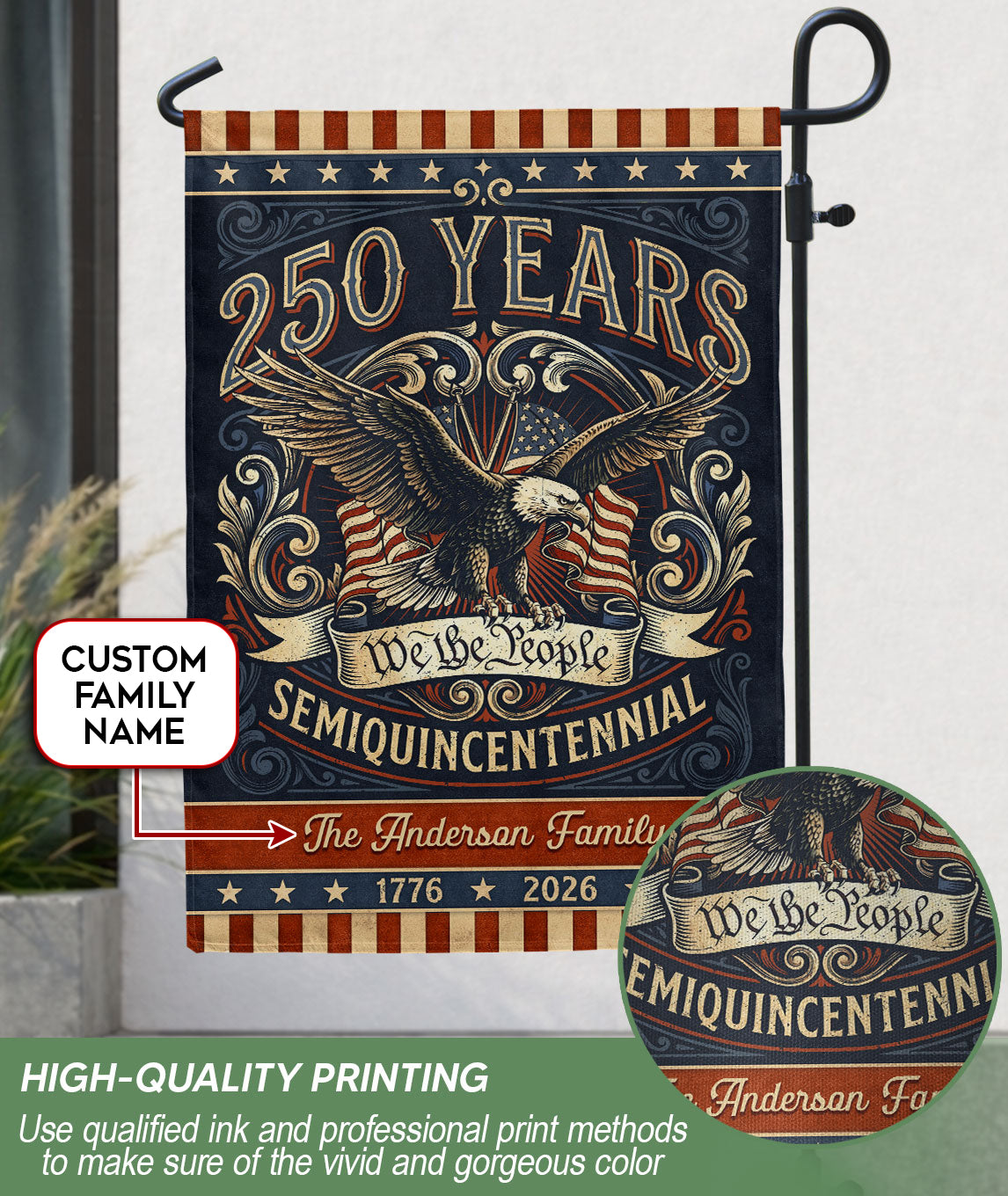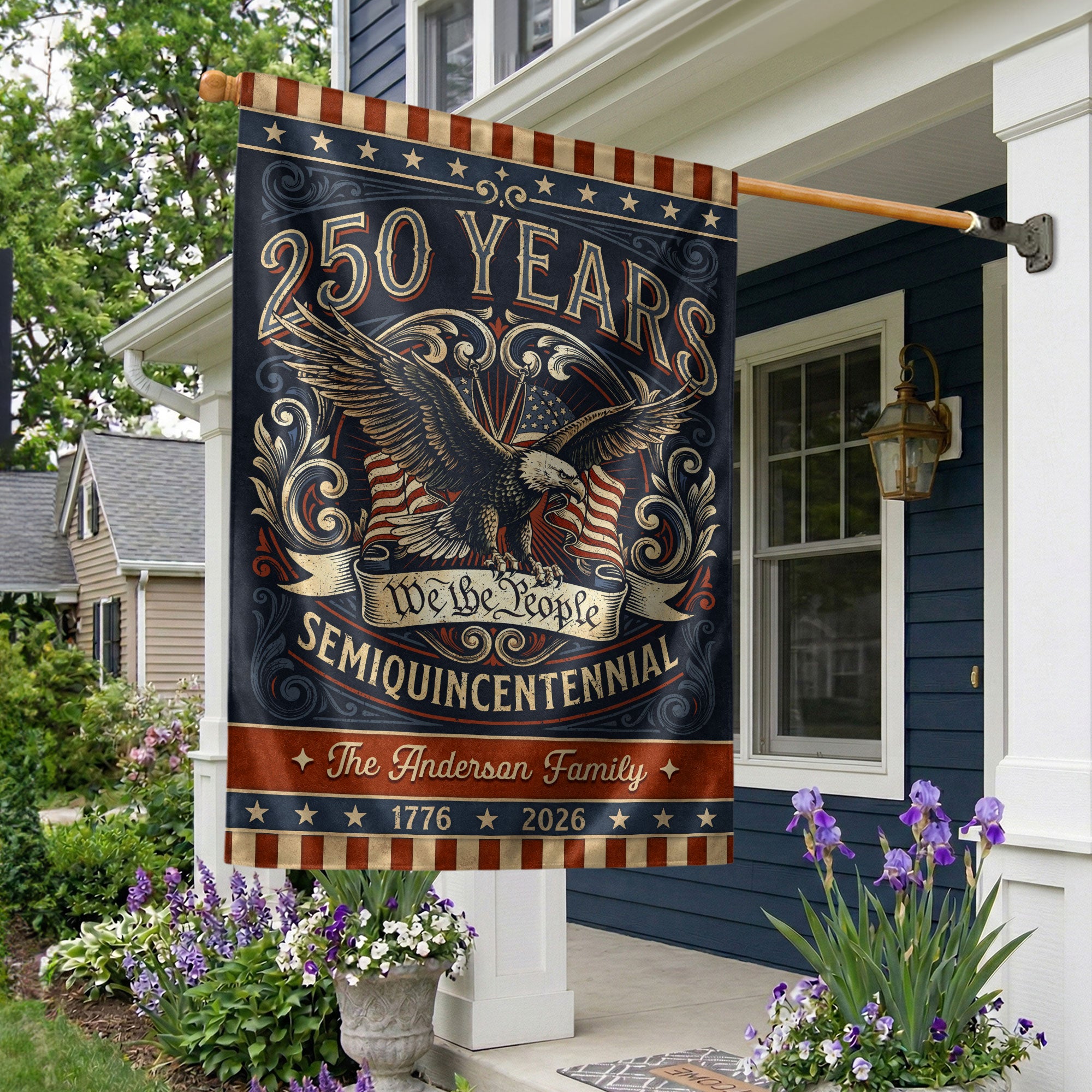 Celebrate America’s 250th anniversary with this personalized garden flag featuring a bold eagle, ‘We the People’ scroll, and vintage American flag accents. Customizable with your family name, it honors the journey from 1776 to 2026 and the spirit of liberty. Perfect for gardens, porches, or patios to display patriotism. Durable weather-resistant fabric ensures long-lasting vibrancy. Ideal for historic milestone commemorations, family gatherings, Independence Day, or as a thoughtful personalized gift for patriots. Easy to install with a standard garden flag pole (not included). Show your pride in the USA’s enduring legacy.