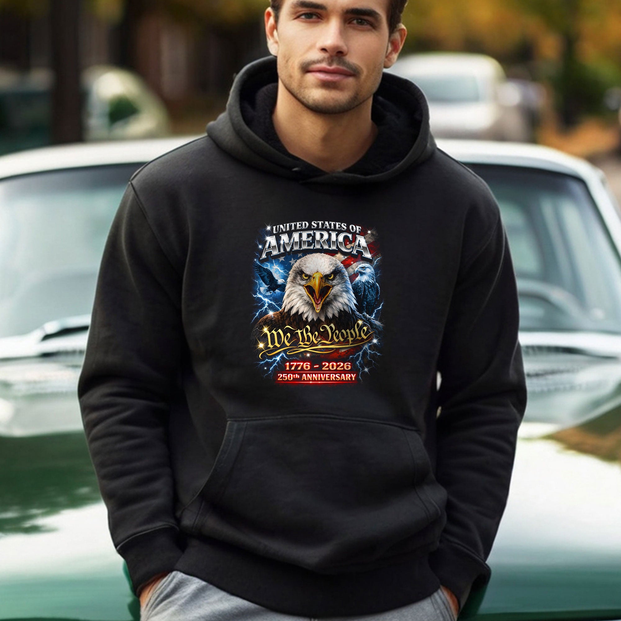 Celebrate America’s 250th anniversary from 1776 to 2026 with this retro 90s bootleg style hoodie featuring a bold We The People eagle graphic. Crafted for comfort and durability, this patriotic apparel blends throwback bootleg fashion with enduring heritage. Perfect for patriots who appreciate vintage-inspired designs with an unmistakable edge. Made from high-quality cotton-poly blend fabric, it offers a relaxed unisex fit ideal for casual wear, layering, or showing national pride at events, rallies, or everyday outings. The oversized graphic print captures the gritty 90s aesthetic while honoring the United States’ milestone legacy. Available in multiple sizes for men, women, and all fans of retro patriotic clothing.