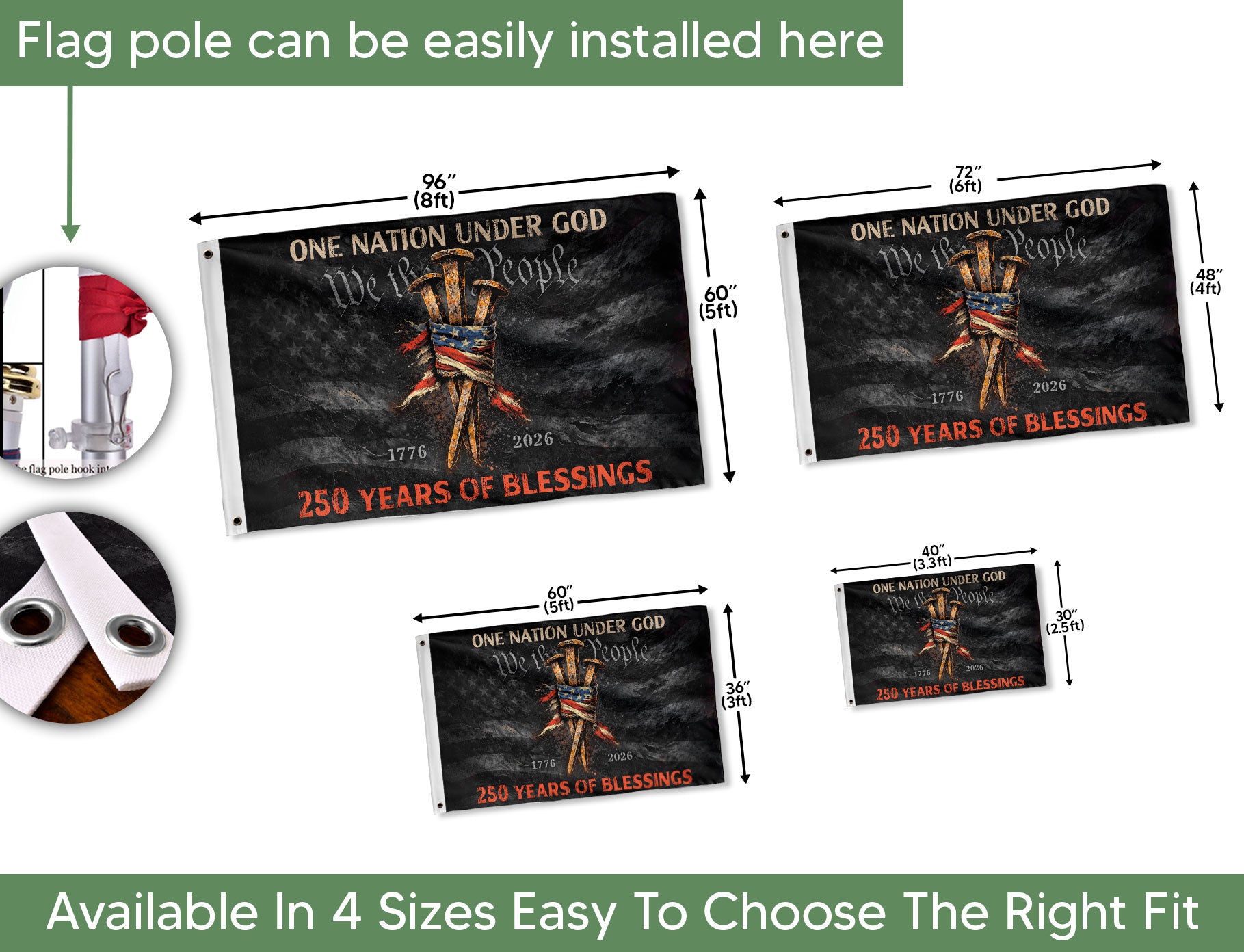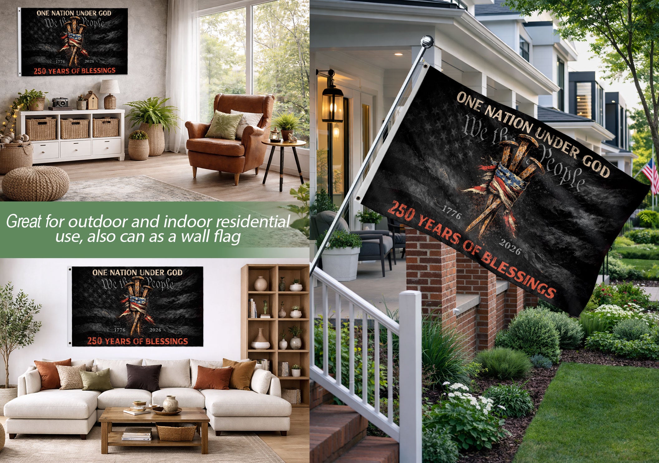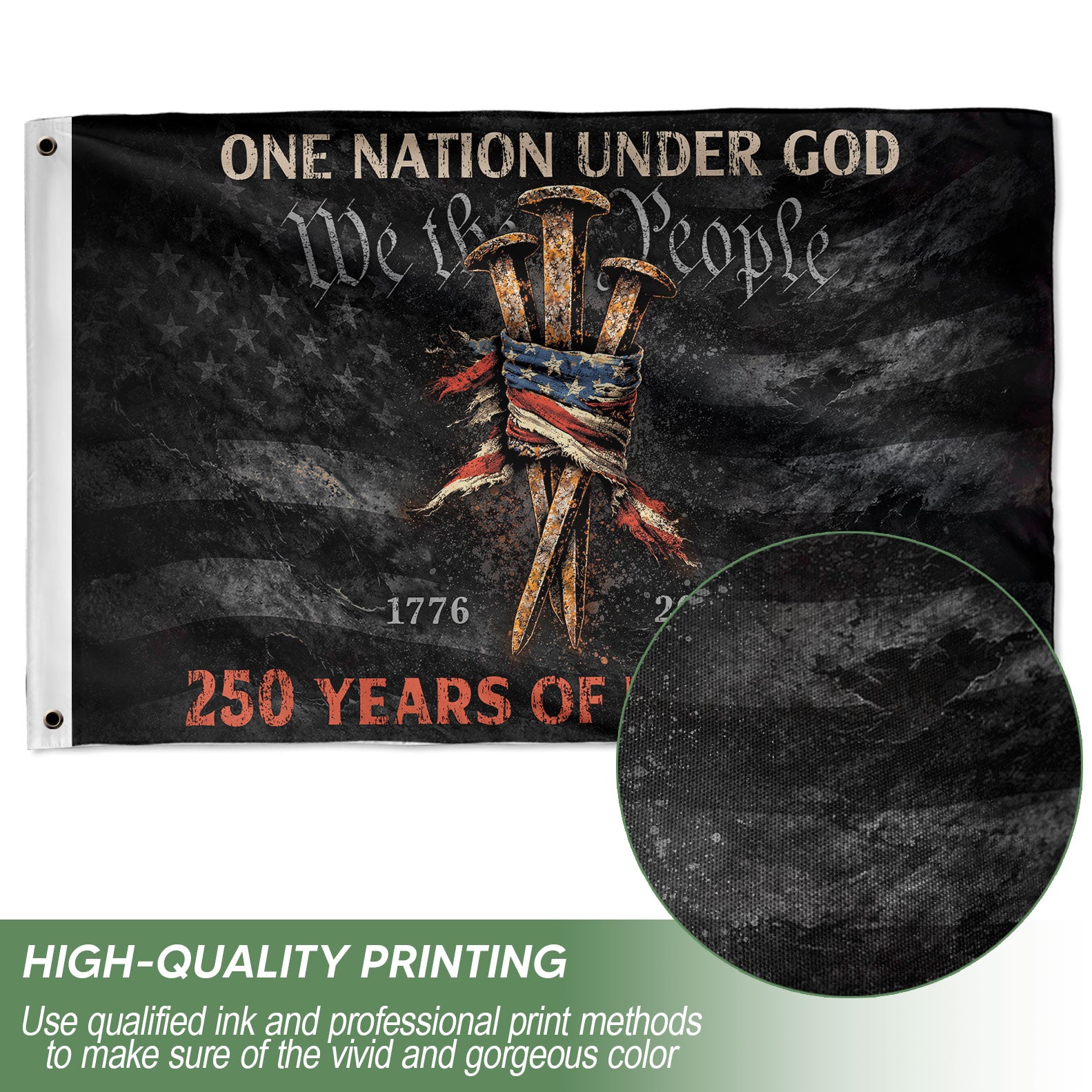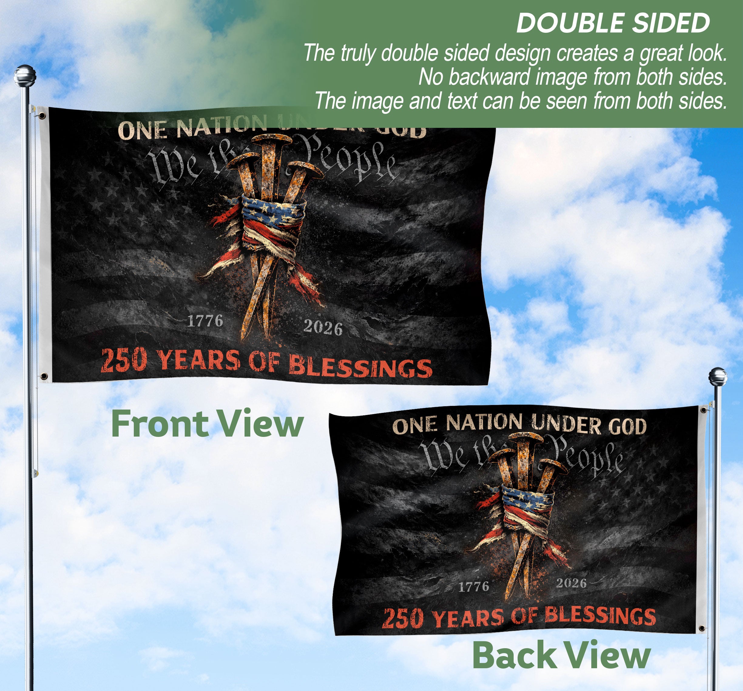Elevate your home decor with the Three Nails Cross Christian House Flag, a striking symbol of faith and patriotism. This house flag prominently features the iconic three nails cross design alongside the powerful phrases ‘One Nation Under God’ and ‘We The People.’ Crafted from durable, weather-resistant polyester fabric, it measures standard house flag size for easy display on porches, patios, or flagpoles. The bold graphics are printed with high-quality, fade-resistant ink to maintain vibrancy through seasons. Perfect for Christian homeowners, patriots, and those celebrating American values and religious devotion. Double-sided printing ensures visibility from both sides. Includes hanging sleeve and brass grommets for secure attachment. Ideal for holidays, everyday display, or events like Independence Day, Memorial Day, or church gatherings. Express your beliefs proudly with this meaningful outdoor banner.