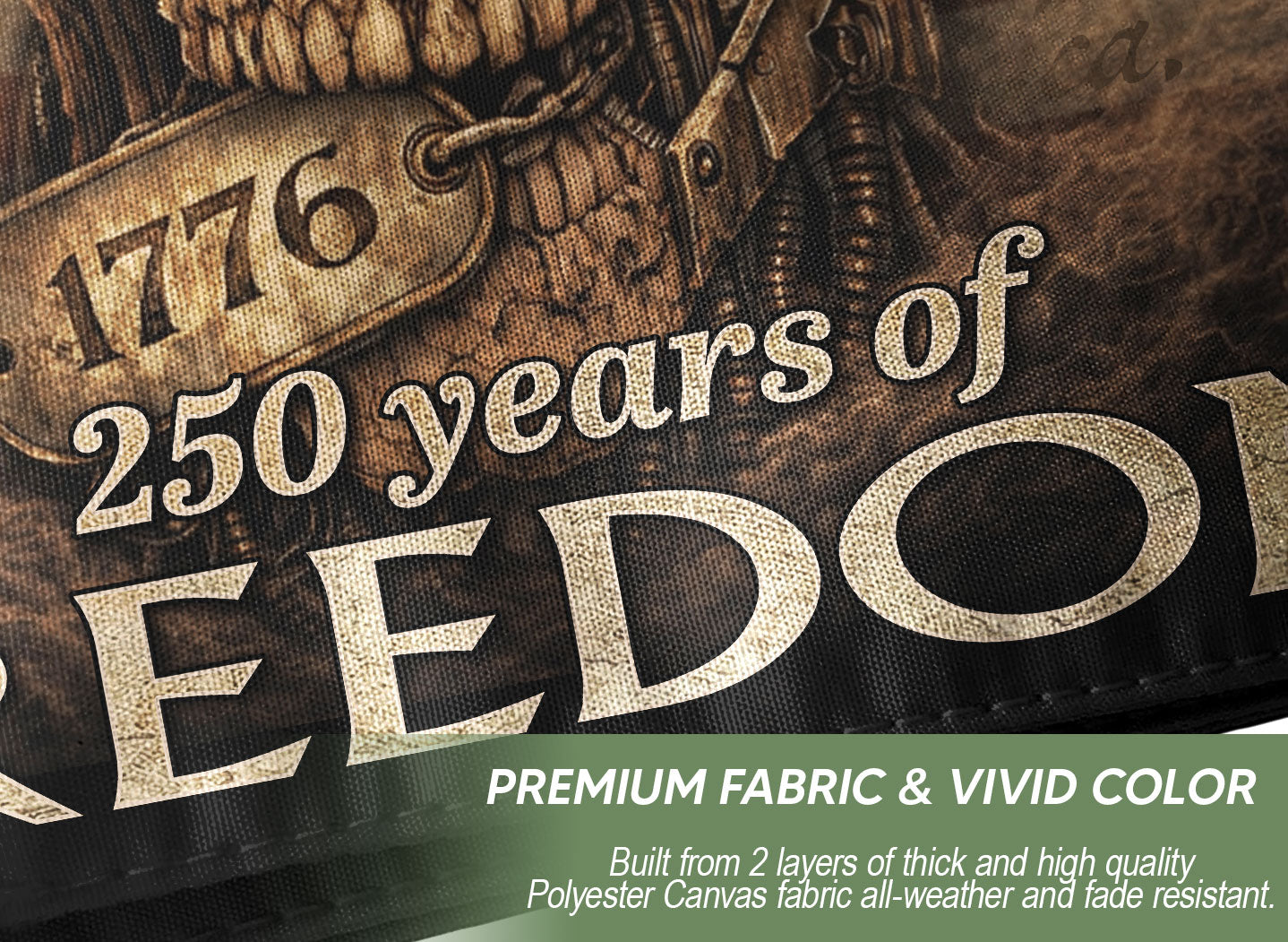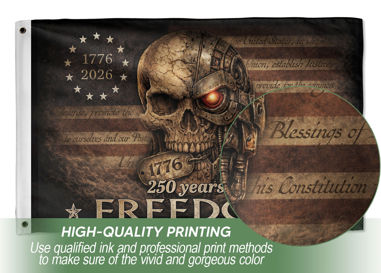 Celebrate 250 years of American independence with this striking United States anniversary flag spanning 1776-2026. Featuring a bold mechanical metal design and cyber skull motif, this patriotic garden flag blends historic freedom with modern edge. Crafted for durability, it’s perfect for outdoor display in gardens, patios, yards, or porches. The intricate cyber skull intertwined with the American flag symbolizes strength, resilience, and futuristic patriotism. Ideal for history enthusiasts, veterans, and proud Americans marking the semiquincentennial. Weather-resistant material ensures long-lasting vibrancy. Easy to hang with a sturdy sleeve. Measures standard garden flag size for versatile use. Show your patriotic spirit with this unique 250th anniversary commemorative flag.