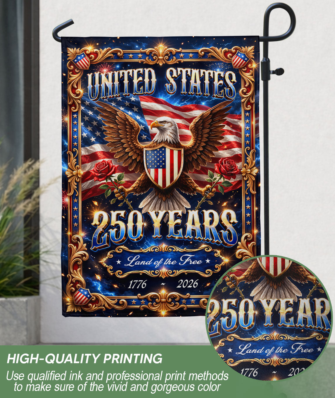 Celebrate America’s 250th anniversary with this United States 250 Years House Flag commemorating 1776-2026. Featuring a majestic bald eagle with outspread wings protecting the stars and stripes, framed by elegant golden filigree and blooming red roses. This patriotic ‘Land of the Free’ garden flag captures the enduring spirit of the nation. Perfect for outdoor display in gardens, yards, porches, or patios to show American pride. Durable polyester construction withstands weather elements, double-sided print for visibility from all angles. Ideal for Independence Day, Memorial Day, Fourth of July, or everyday display. Easy to hang with sleeve or grommets. Proudly showcase your patriotism with this vibrant tribute to the USA’s history and future.