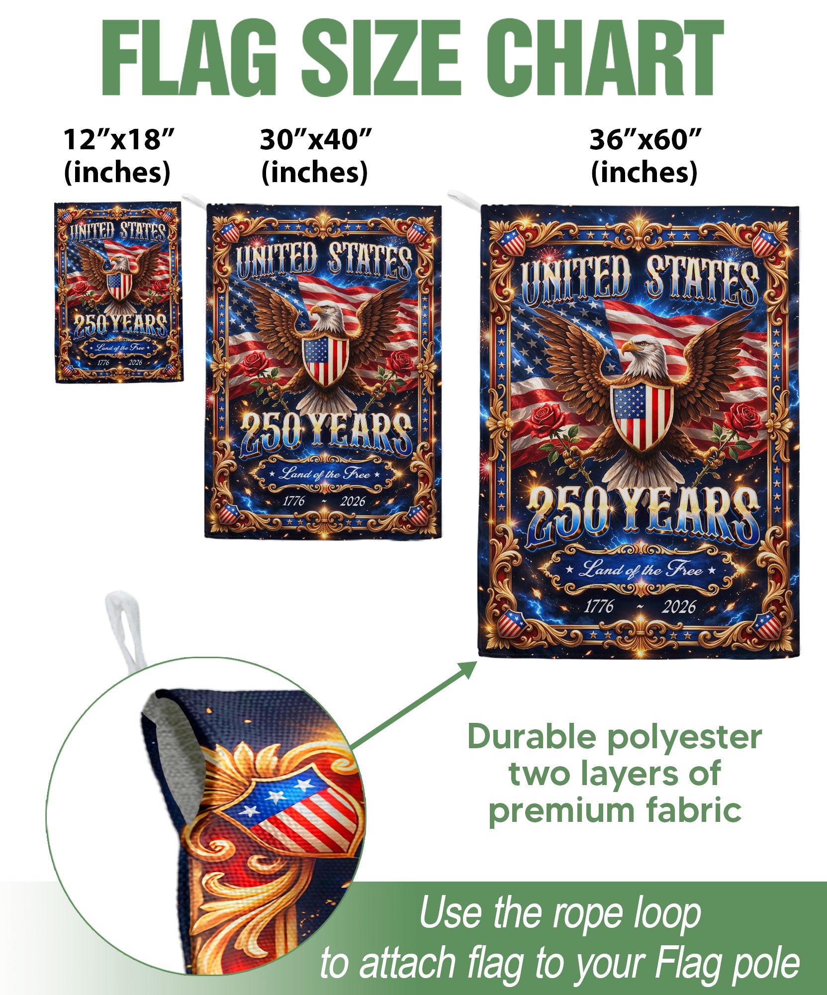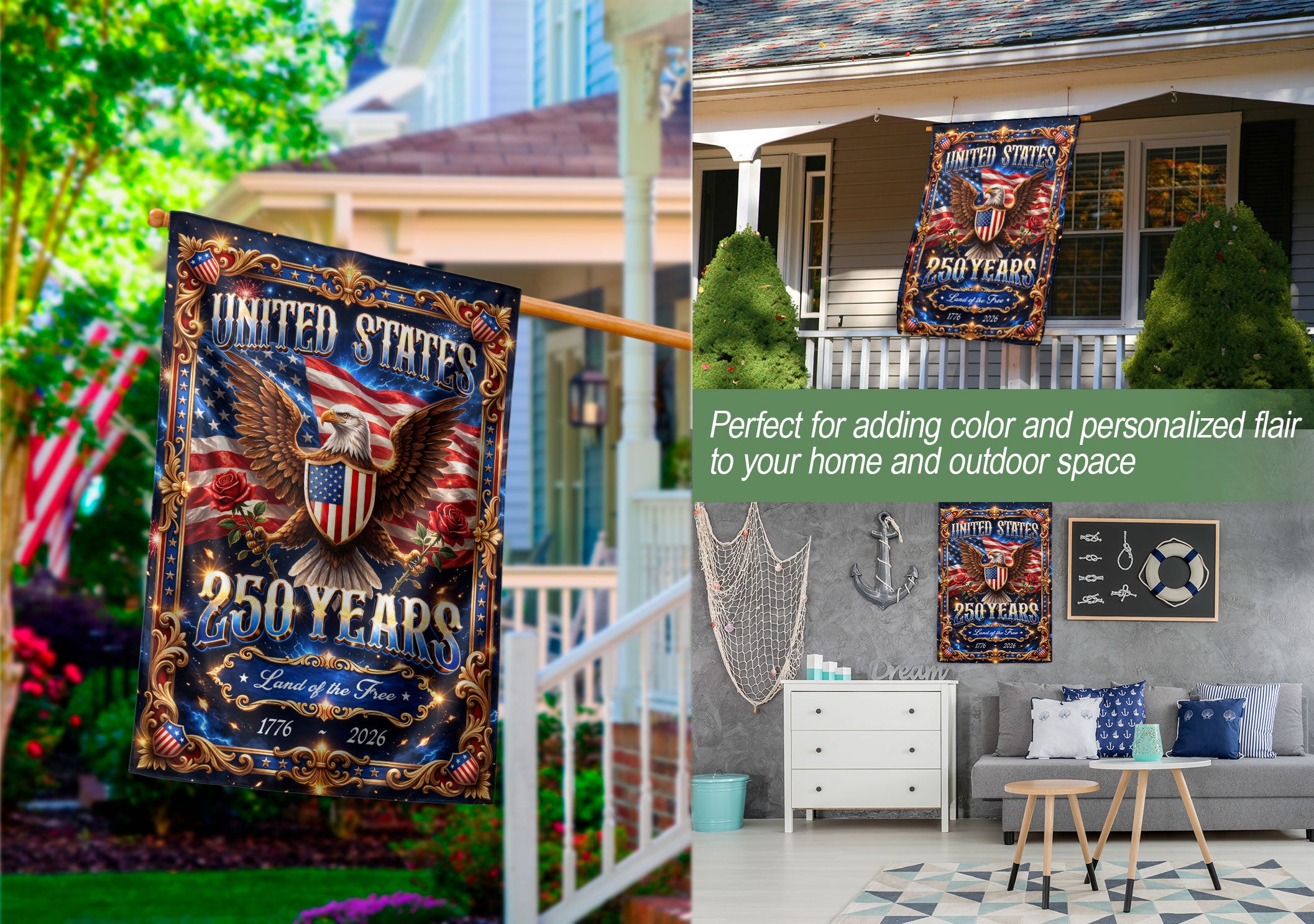 Celebrate America’s 250th anniversary with this striking United States garden flag featuring a majestic eagle, iconic American flag elements, and bold ‘Land of the Free’ text commemorating 1776-2026. Crafted from durable, weather-resistant polyester fabric, this vibrant double-sided flag measures approximately 12.5×18 inches, perfect for garden stakes, porches, yards, or walkways. Display your patriotic pride year-round or during national holidays like Independence Day, Memorial Day, and Veterans Day. The high-quality print ensures fade-resistant colors that withstand sun, wind, and rain, adding a touch of heritage, strength, and freedom to any outdoor space. Easy to install on standard garden flag poles (pole not included) for hassle-free setup.
