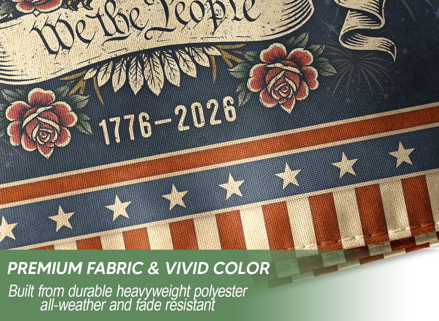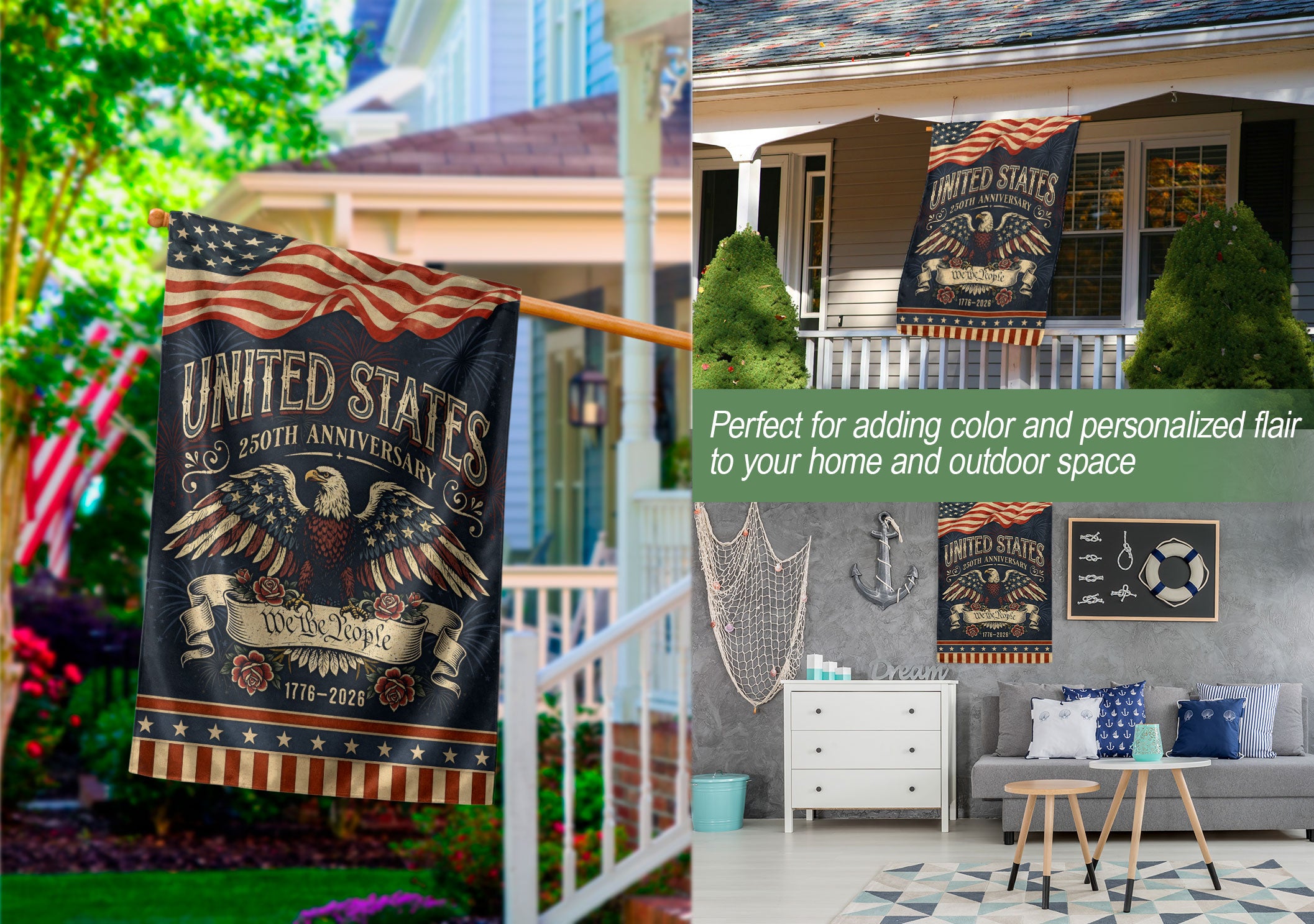 Celebrate America’s 250th anniversary from 1776 to 2026 with this patriotic house flag featuring the iconic We The People Bald Eagle in distressed vintage artwork. This double-sided banner proudly displays the spirit of the founding principles on both sides, making it perfect for porches, gardens, or outdoor displays. Crafted for durability to withstand weather, it’s an ideal way to honor the nation’s milestone in meaningful fashion. Hang it high to show your American pride during parades, holidays, or everyday patriotism.
