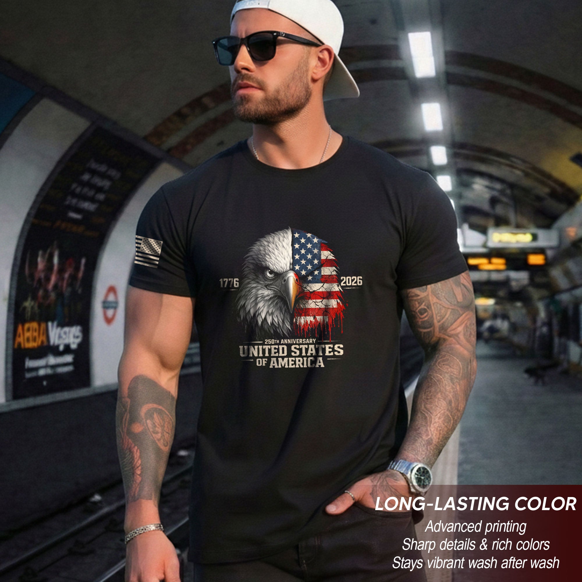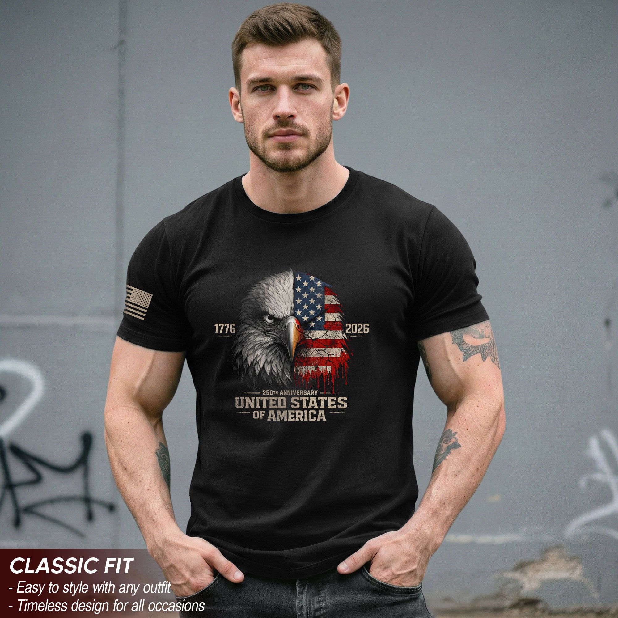 Celebrate America’s 250th anniversary from 1776 to 2026 with this patriotic T-shirt featuring a distressed USA flag and majestic eagle graphic. The vintage-inspired design captures timeless national pride, courage, and resilience. Crafted from soft, comfortable cotton blend fabric, this unisex tee offers a rugged, worn-in look perfect for Independence Day celebrations, veterans, history enthusiasts, or everyday wear. Available in multiple sizes for men, women, and youth. Machine washable for easy care. Show your American spirit with this limited-edition 250 years tee.