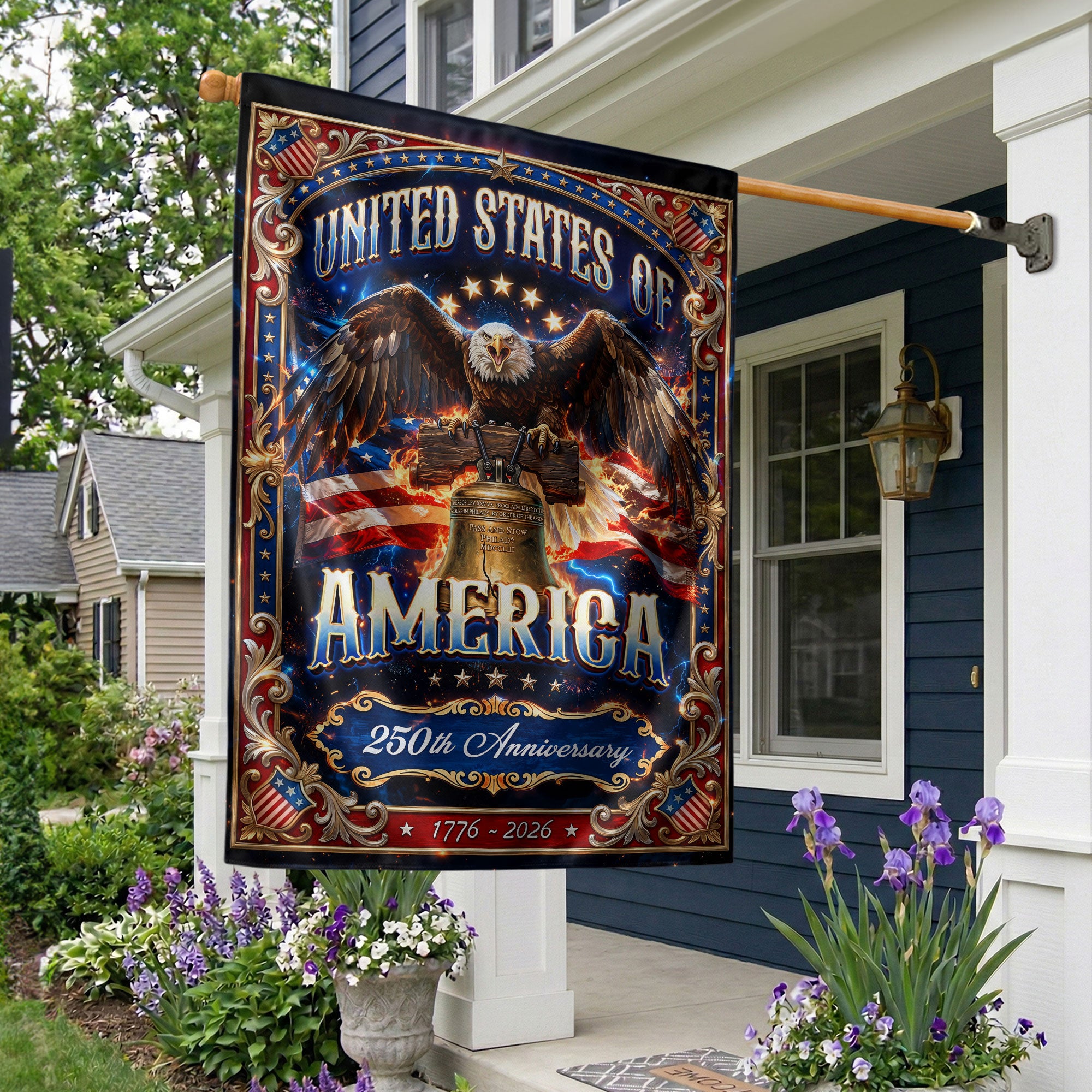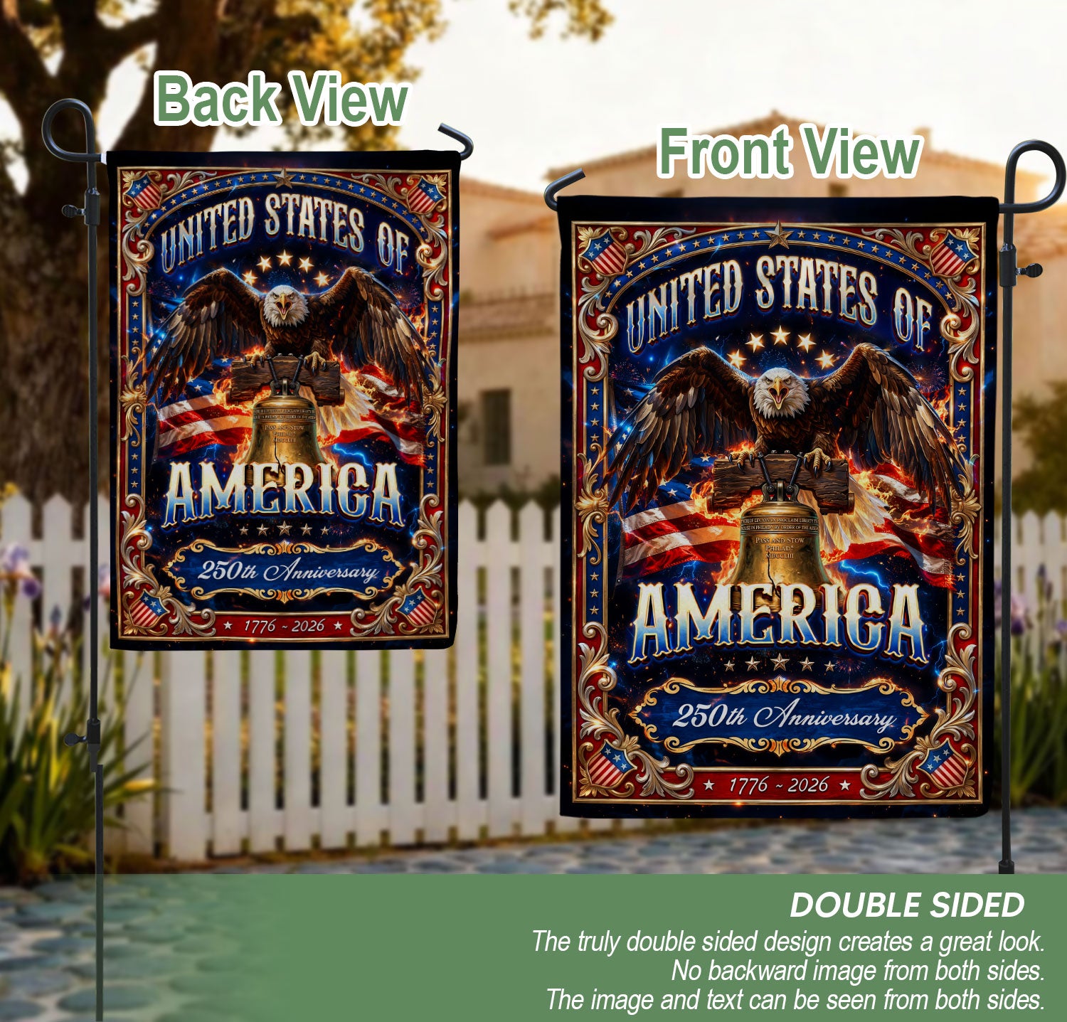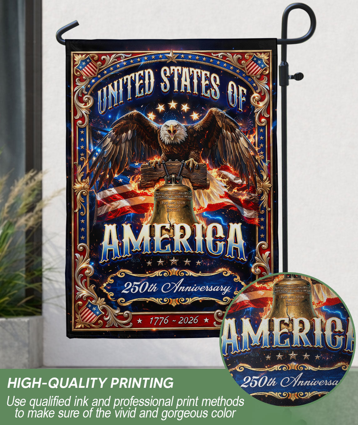 Display your American patriotism with this United States garden flag featuring a striking eagle and Liberty Bell design. Commemorating 1776 and the upcoming 250th anniversary in 2026, this durable patriotic banner enhances gardens, walkways, porches, and outdoor spaces. Made from weather-resistant polyester fabric, it measures standard garden flag size for easy display on flag poles or stakes. The bold graphics capture the spirit of American freedom and independence, making it ideal for Fourth of July celebrations, Memorial Day, or year-round display. Fade-resistant and double-sided printing ensure vibrant colors from any angle. Easy to hang and remove for seasonal use.