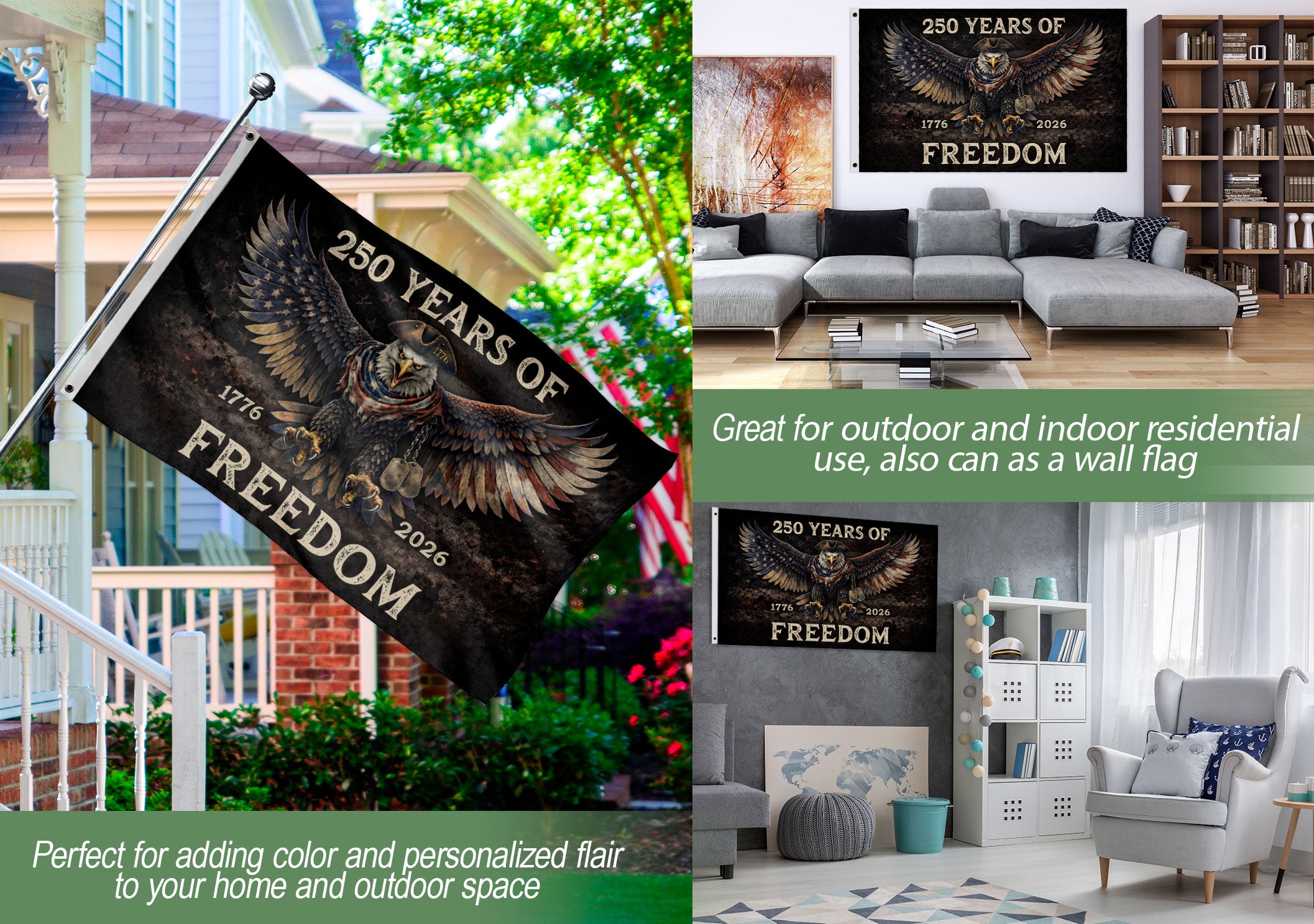 Celebrate America’s 250th anniversary with the USA 1776-2026 Freedom Flag featuring the iconic We The People design. This patriotic outdoor flag commemorates the journey from independence in 1776 to the semiquincentennial in 2026, symbolizing freedom, unity, and enduring national pride. Made from durable, weather-resistant polyester fabric, it withstands wind, rain, and sun for reliable long-term display. Ideal for homes, porches, gardens, community events, Fourth of July celebrations, Memorial Day, or Veterans Day. Double-stitched edges and reinforced grommets allow easy hanging on flagpoles, porches, or fences. Fade-resistant colors keep the vibrant reds, whites, and blues looking sharp year-round. This timeless American flag embodies heritage, fosters patriotism, and unites communities.