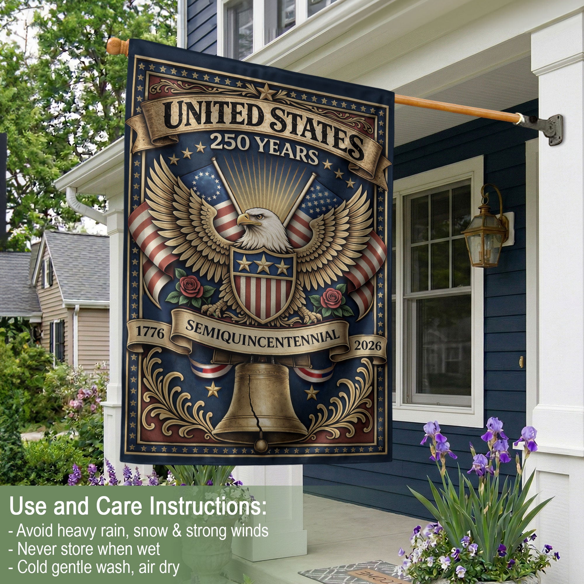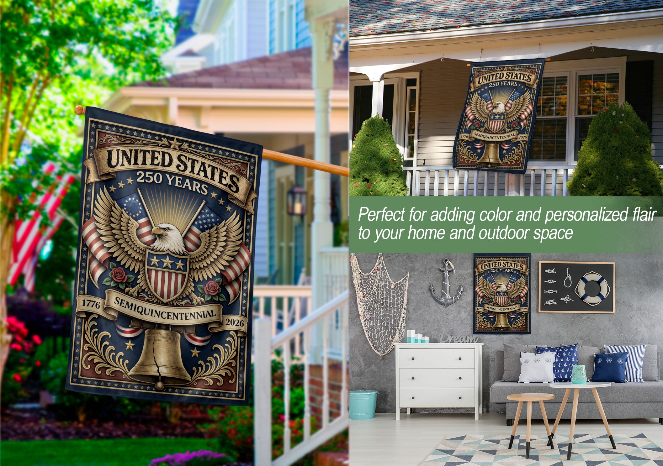 Celebrate America’s 250th anniversary from 1776 to 2026 with this striking double-sided house flag. Featuring a majestic bald eagle framed by bold stars and stripes, it embodies the strength and freedom of the United States. Perfect for outdoor display on porches, patios, gardens, or flagpoles, this high-quality banner is designed to withstand the elements while making a patriotic statement. The vibrant, weather-resistant fabric ensures long-lasting color and durability in any setting. Ideal for Independence Day, Memorial Day, Fourth of July, or everyday display of national pride. Easy to hang with reinforced grommets for secure attachment.