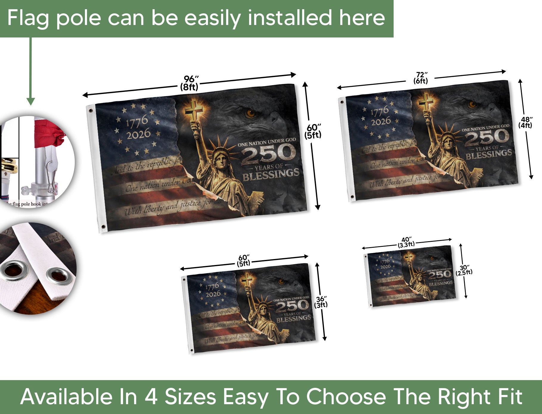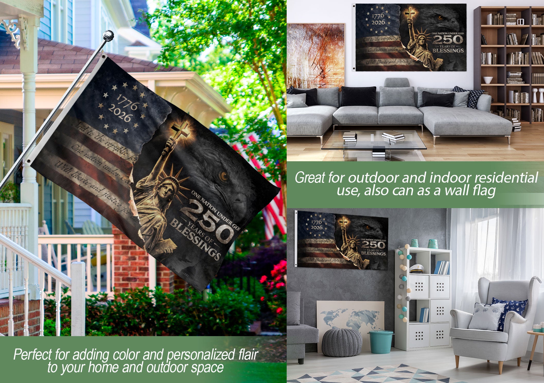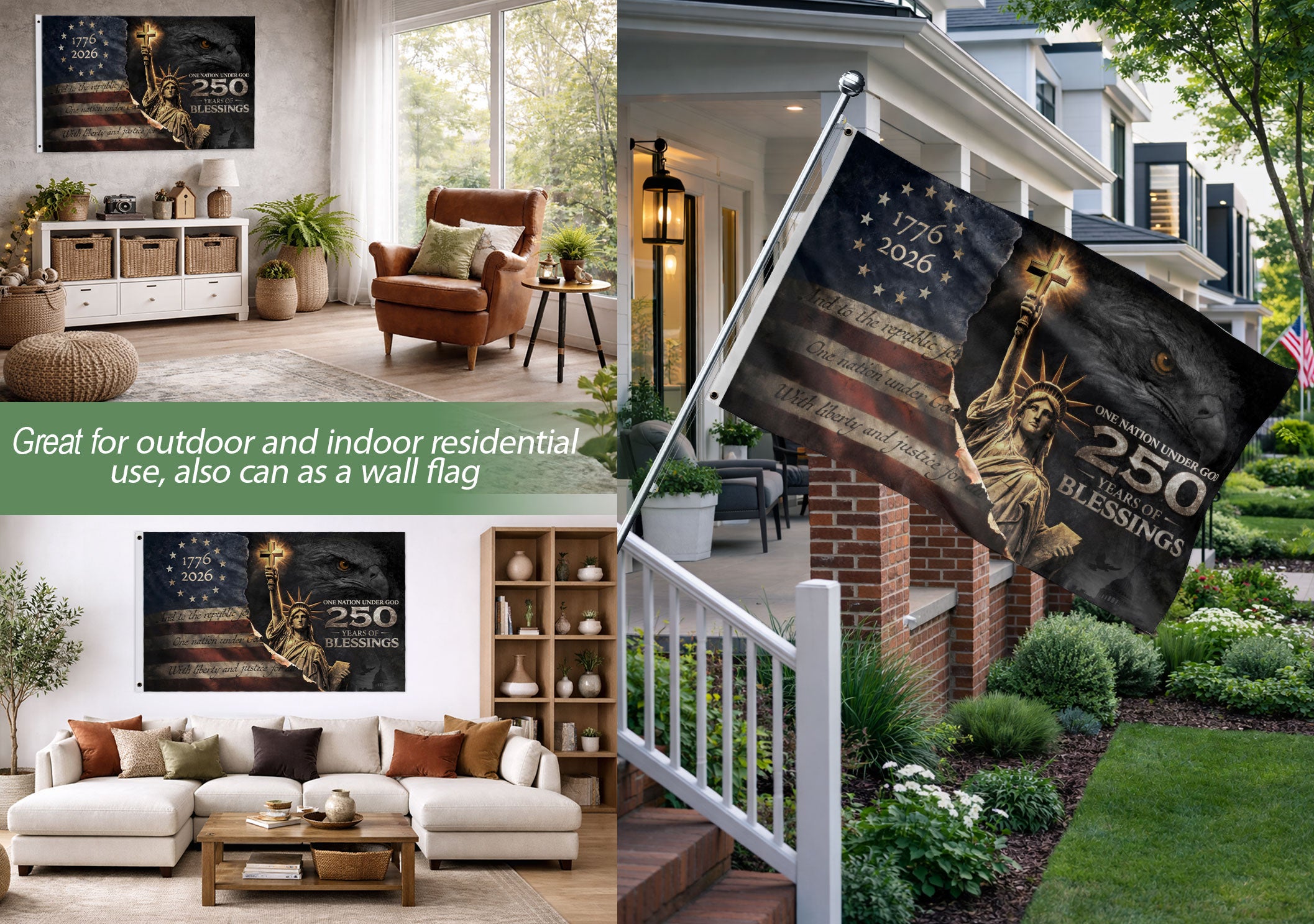 Celebrate the United States’ 250th anniversary from 1776 to 2026 with this double-sided Christian garden flag featuring the ‘One Nation Under God Blessings’ design. This patriotic flag honors America’s faith-guided heritage, spiritual strength, gratitude, and historical journey. Crafted for durability, it withstands weather elements for long-lasting outdoor display on both sides. Perfect for gardens, porches, patios, or yards, it’s an ideal way for Christians, patriots, and history enthusiasts to express pride in the nation’s legacy under God. Measuring standard garden flag size, it’s easy to install with a included pole sleeve and resists fading from sun and rain.