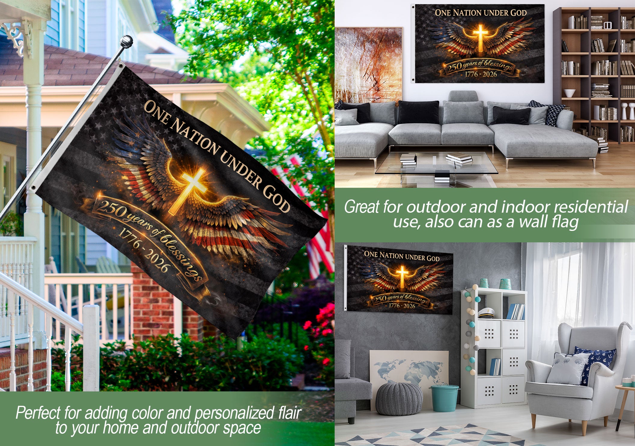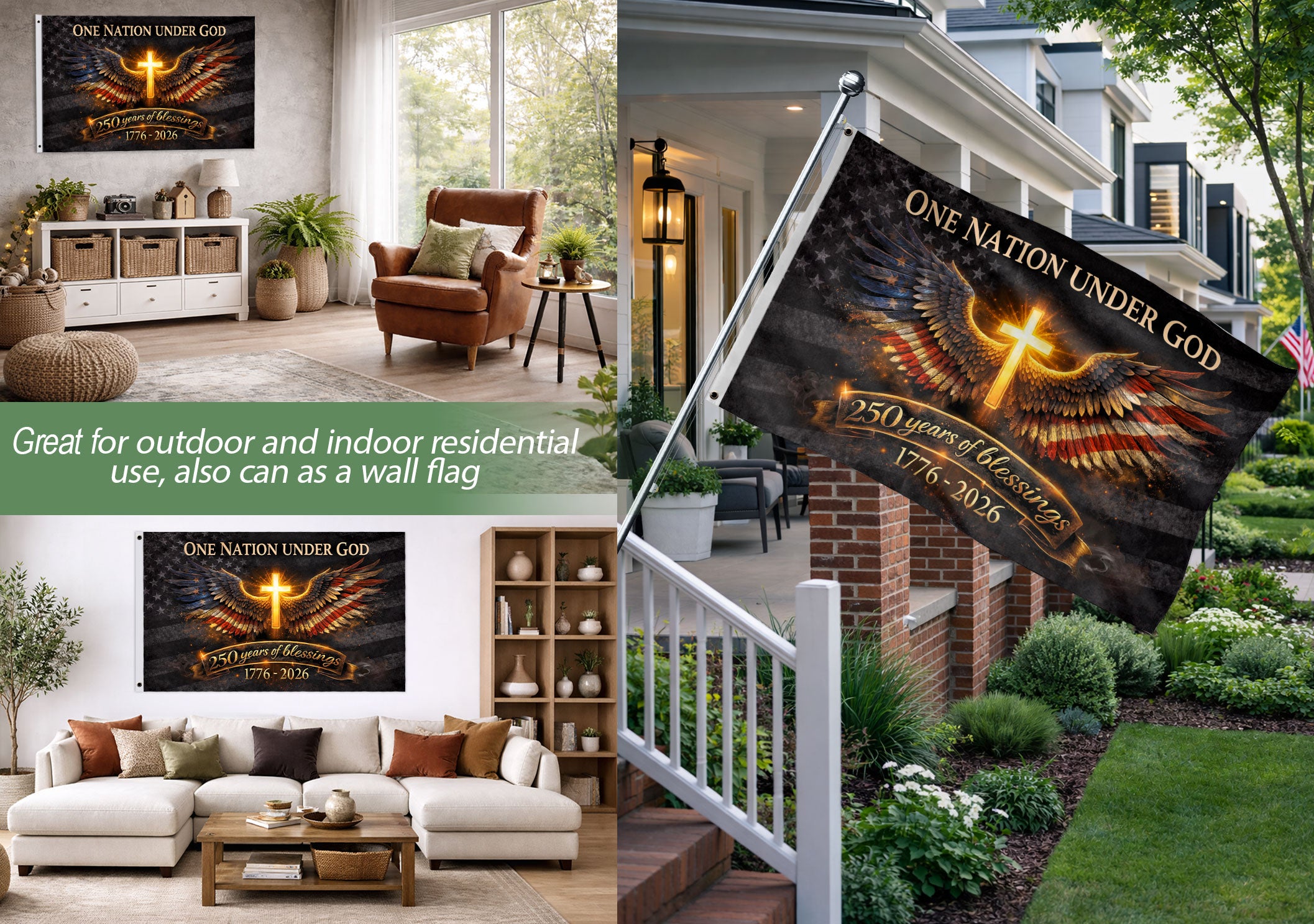 Key features include weather-resistant materials for indoor and outdoor use, bold colors that pop day or night, and a meaningful design blending the iconic cross with angelic wings against an American backdrop. Ideal for the semiquincentennial celebrations marking 250 years of American liberty rooted in faith.