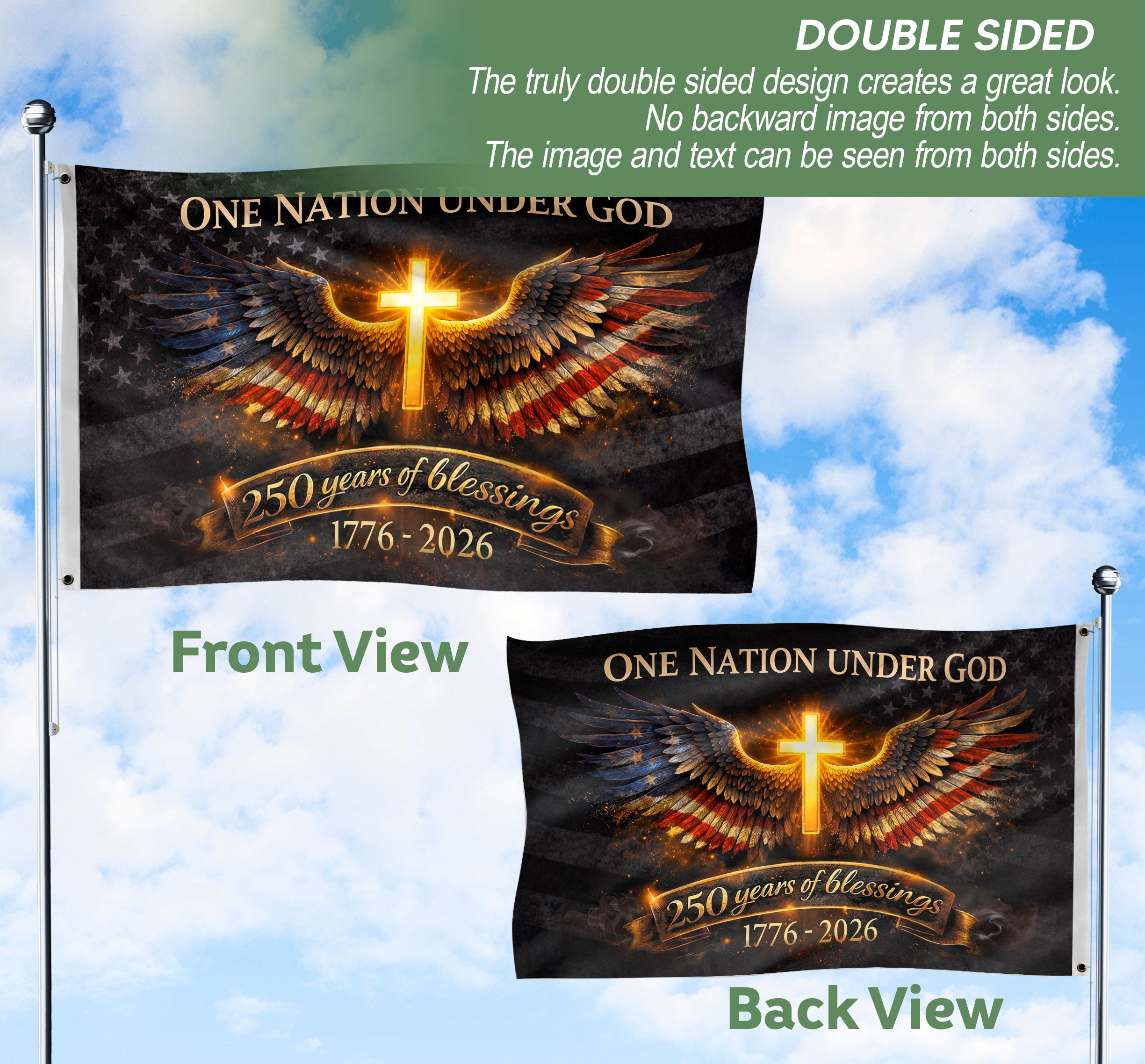 Celebrate America’s 250th anniversary from 1776 to 2026 with this striking double-sided Christian banner featuring a glowing cross and majestic angel wings. This high-quality flag honors the profound connection between American history, Christian faith, and the spirit of freedom that defines our nation. Perfect for display at home, church services, patriotic events, outdoor gatherings, or historical commemorations, it serves as a powerful symbol of hope, devotion, and spiritual heritage.