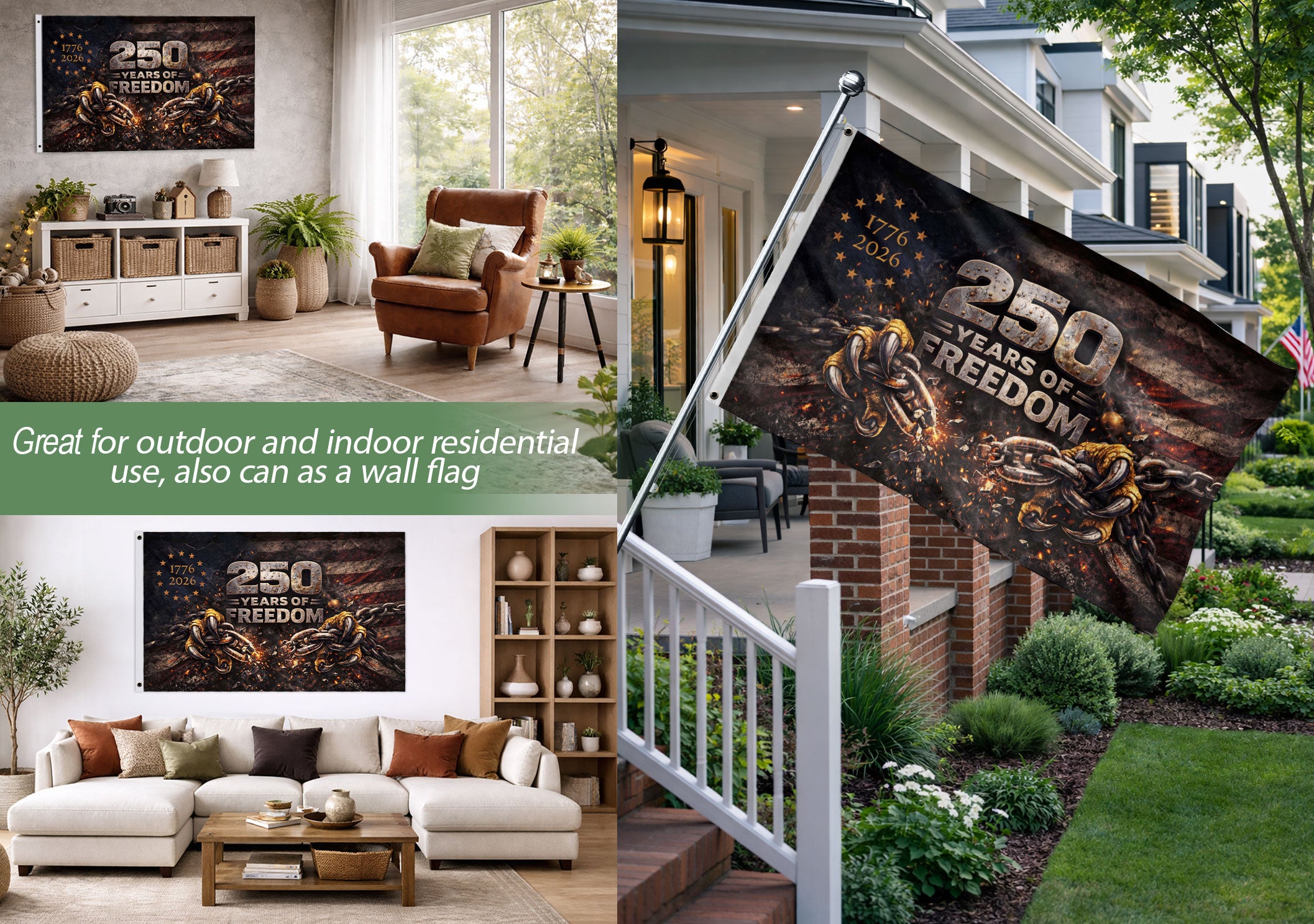 Celebrate America’s 250th anniversary from 1776 to 2026 with this double-sided house flag featuring the striking Breaking Chains design. This patriotic flag symbolizes 250 years of freedom, independence, and resilience, making it an ideal way to display national pride on your porch, garden, or home exterior. Crafted for outdoor durability, the flag is printed on both sides for clear visibility and vibrant colors from any angle. It withstands weather conditions while maintaining bold graphics that honor the spirit of liberty. Perfect for patriots, history enthusiasts, and anyone marking this historic milestone. Standard house flag size fits most hardware (not included) for easy hanging and versatile use in gardens, porches, or patios.