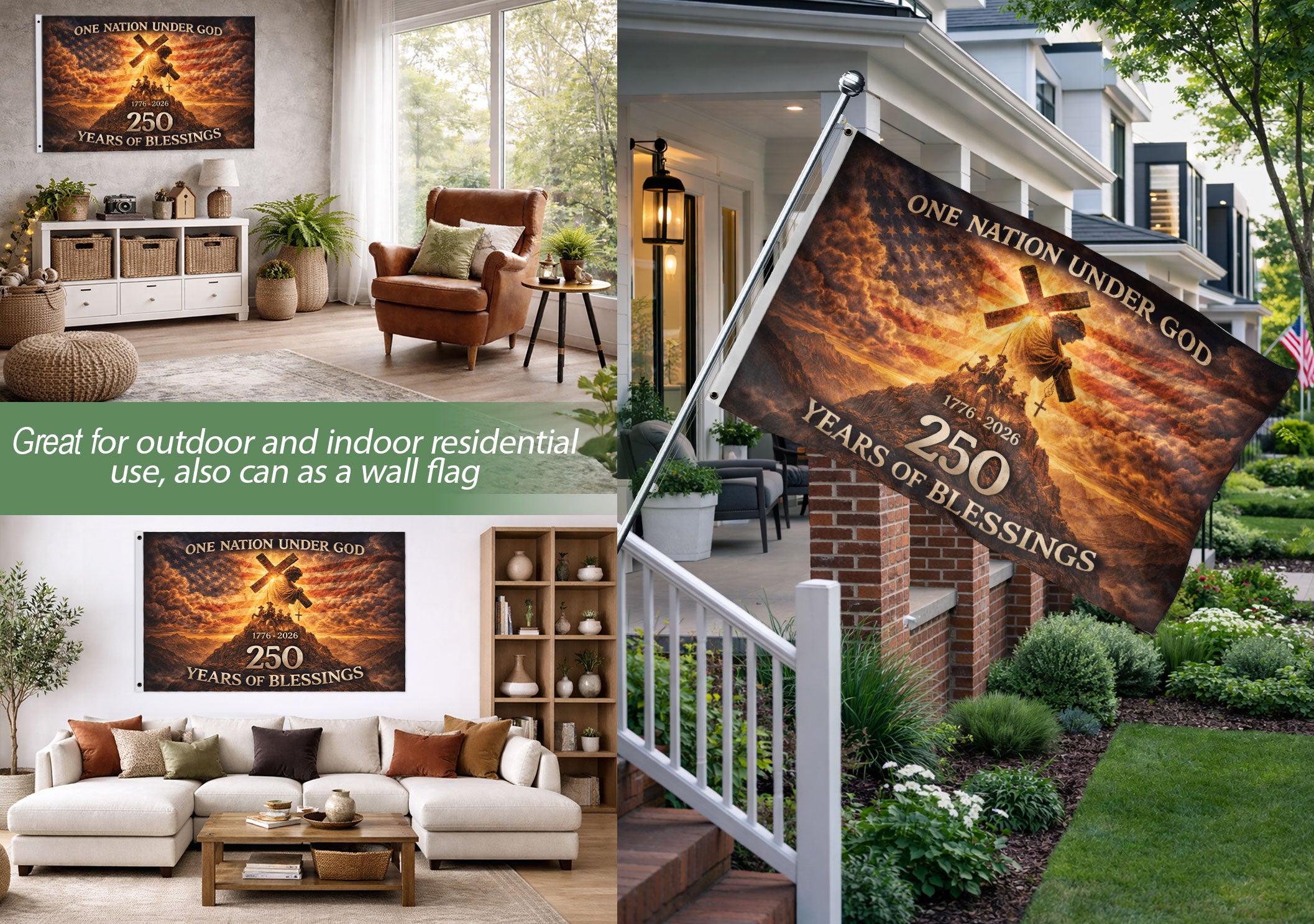 Celebrate America’s 250th anniversary from 1776 to 2026 with this durable double-sided house flag. Featuring Jesus alongside patriotic soldiers and the bold message ‘One Nation Under God,’ it honors faith, sacrifice, and the enduring story of freedom. Perfect for displaying national unity, courage, and devotion on porches, patios, yards, or gardens. Crafted for long-lasting vibrancy with vivid printing visible from both sides, it includes a standard flagpole sleeve for easy hanging. Ideal for veterans, Christians, patriots, and anyone proud of American history and values.