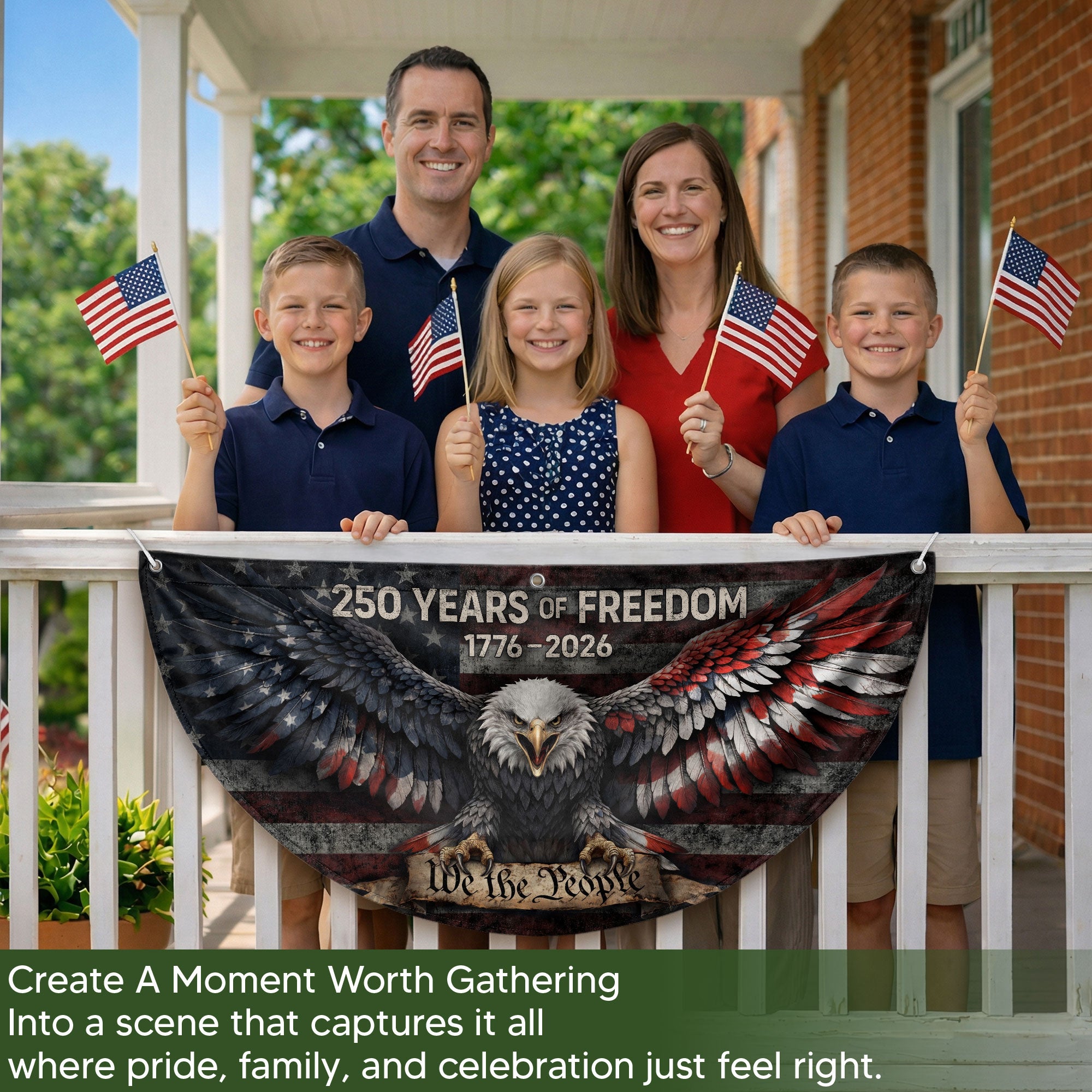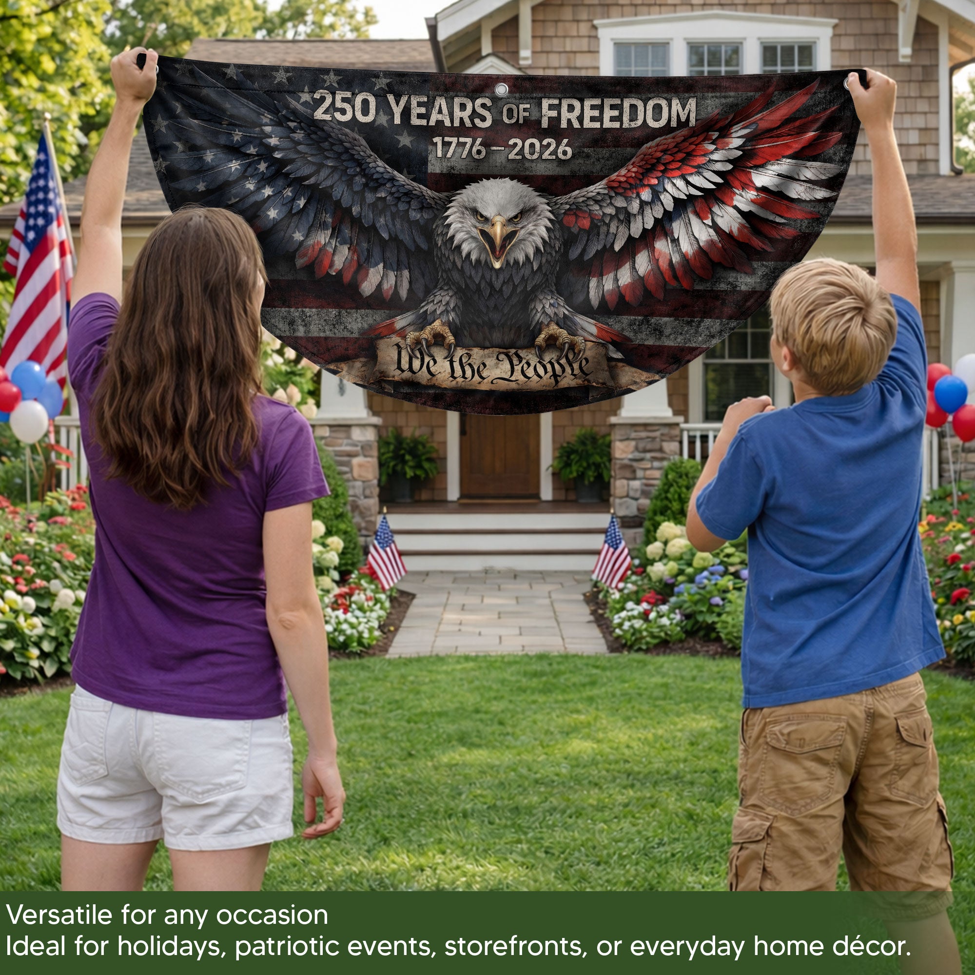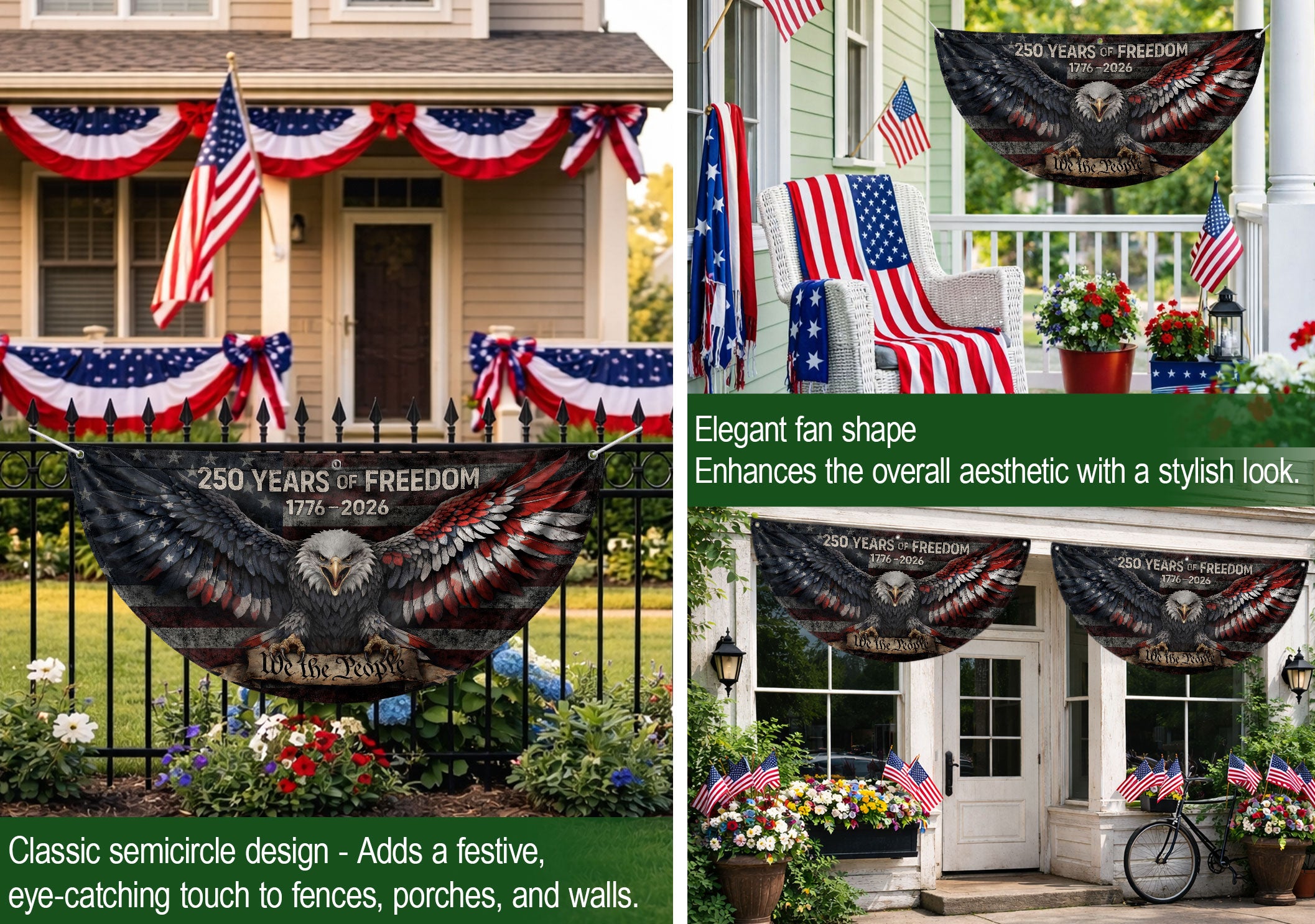 Celebrate America’s 250th anniversary from 1776 to 2026 with this striking fence flag featuring a bold American eagle design and strong patriotic theme. Perfect for outdoor display on porches, front doors, fences, or special events like Independence Day celebrations and historical commemorations. Crafted for durability to withstand weather exposure, this banner adds a meaningful touch of national pride to your home or gathering. Easy to hang and remove, it’s an ideal way to honor 250 years of freedom and American heritage.