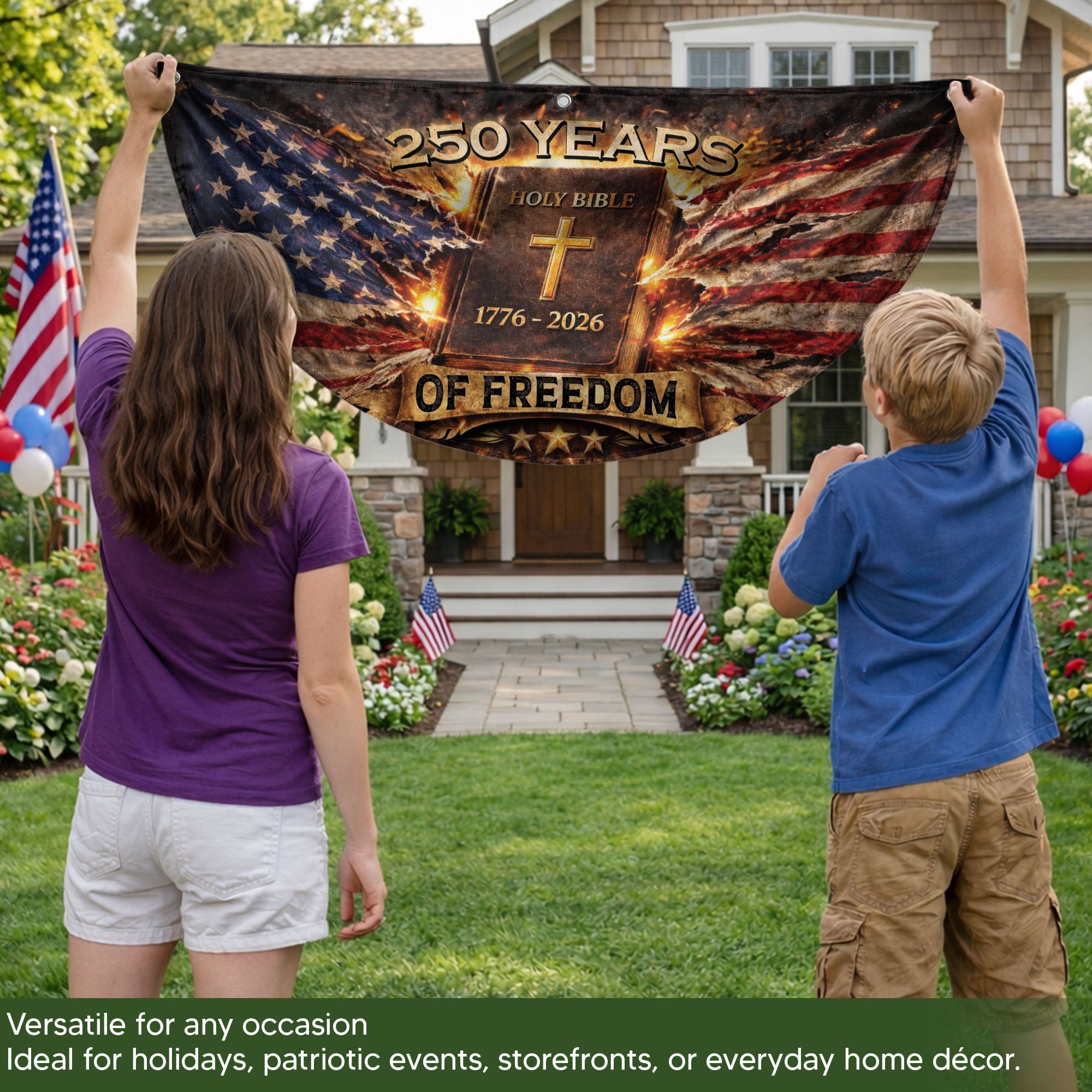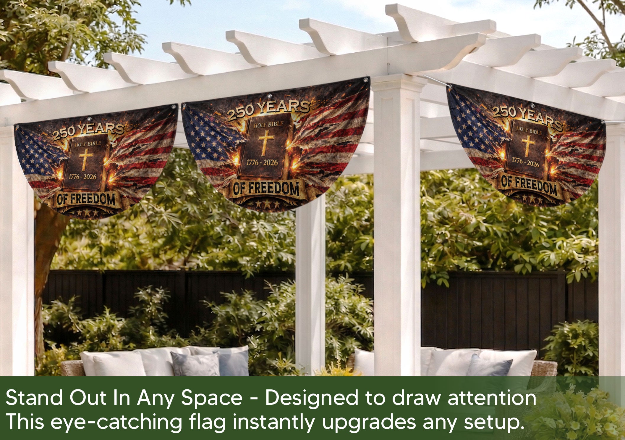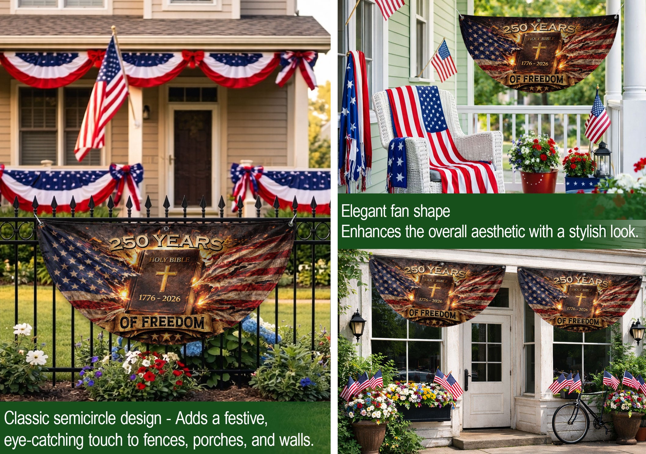 Celebrate America’s 250th anniversary from 1776 to 2026 with this patriotic fence flag featuring a Christian cross and Bible design. Crafted from durable, weather-resistant fabric with vibrant, fade-resistant printing, this banner ensures long-lasting outdoor display. Perfect for fences, yards, porches, or gardens during Independence Day, Memorial Day, or any patriotic event. The elegant faith-inspired artwork honors American freedom and heritage, blending national pride with spiritual symbolism. Easy to hang with reinforced edges and grommets for secure attachment. Ideal for homeowners, churches, and veterans showcasing their love for country and faith.