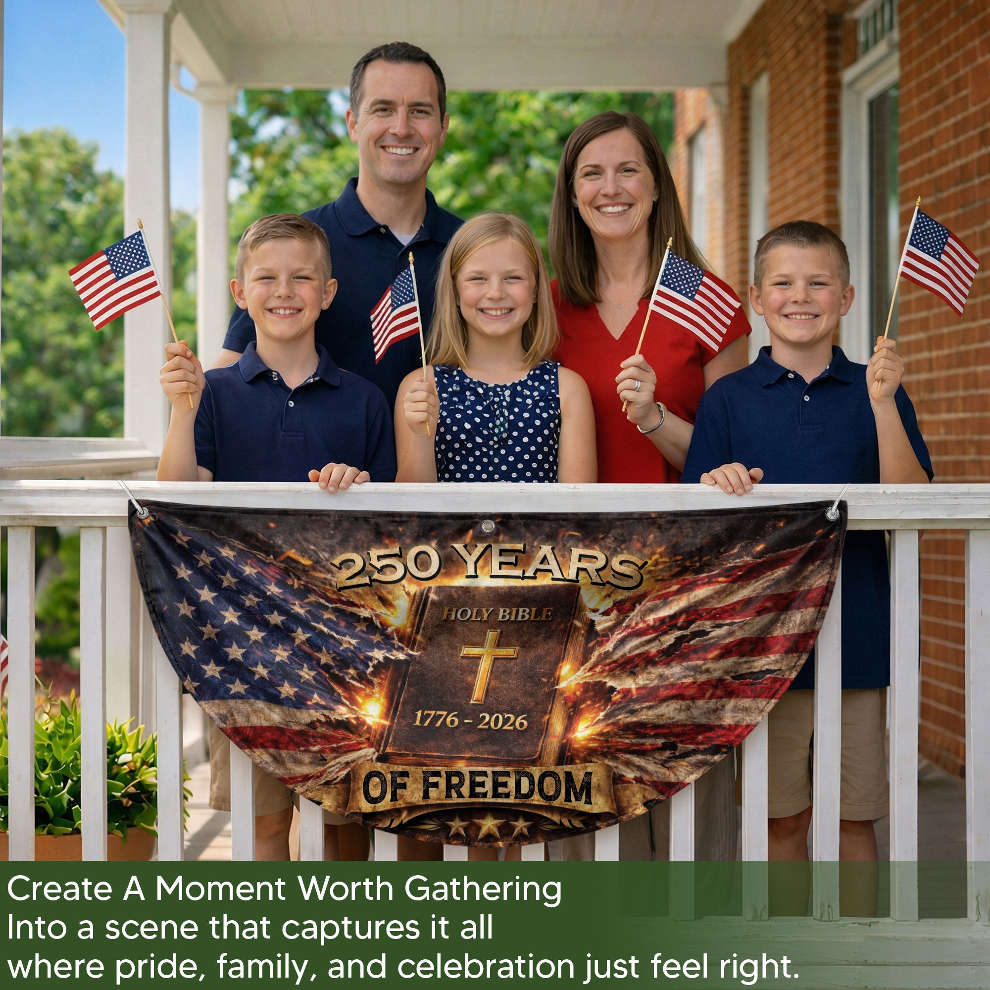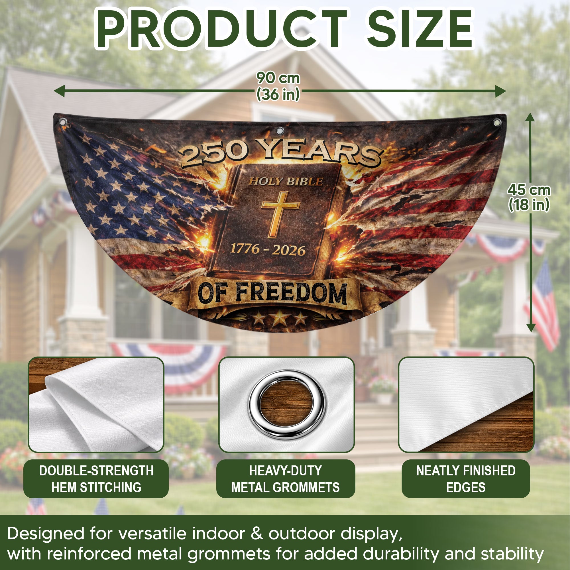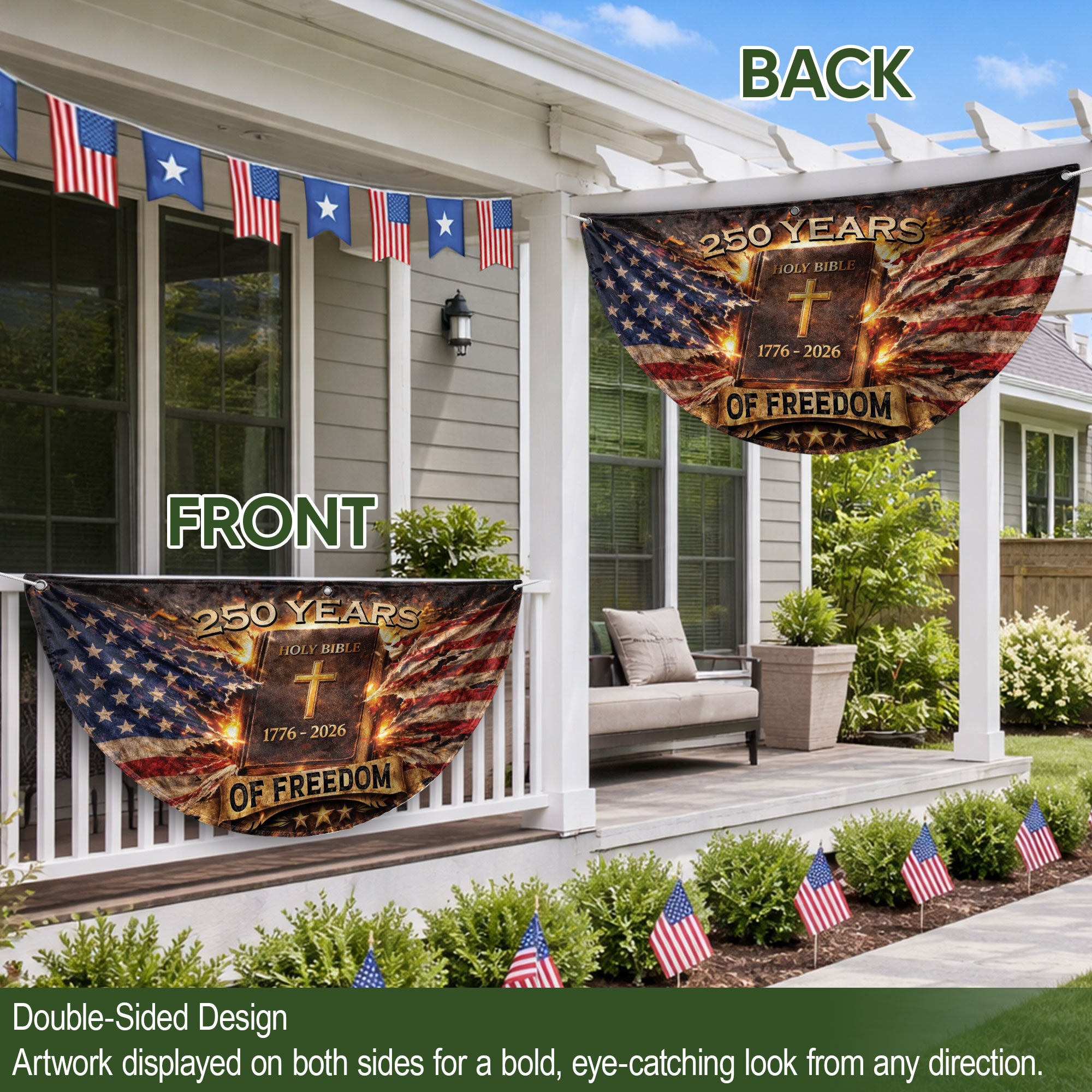 Celebrate America’s 250th anniversary from 1776 to 2026 with this patriotic fence flag featuring a Christian cross and Bible design. Crafted from durable, weather-resistant fabric with vibrant, fade-resistant printing, this banner ensures long-lasting outdoor display. Perfect for fences, yards, porches, or gardens during Independence Day, Memorial Day, or any patriotic event. The elegant faith-inspired artwork honors American freedom and heritage, blending national pride with spiritual symbolism. Easy to hang with reinforced edges and grommets for secure attachment. Ideal for homeowners, churches, and veterans showcasing their love for country and faith.