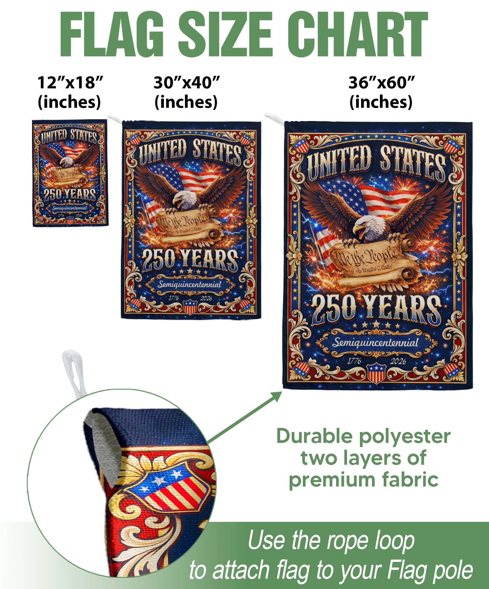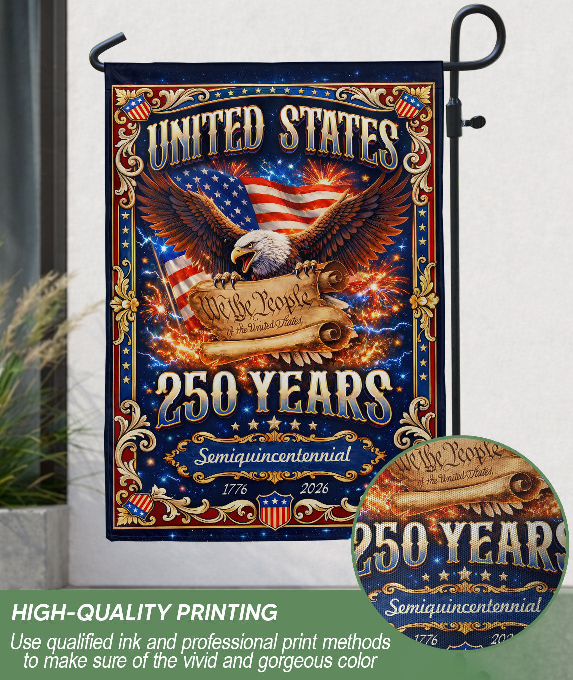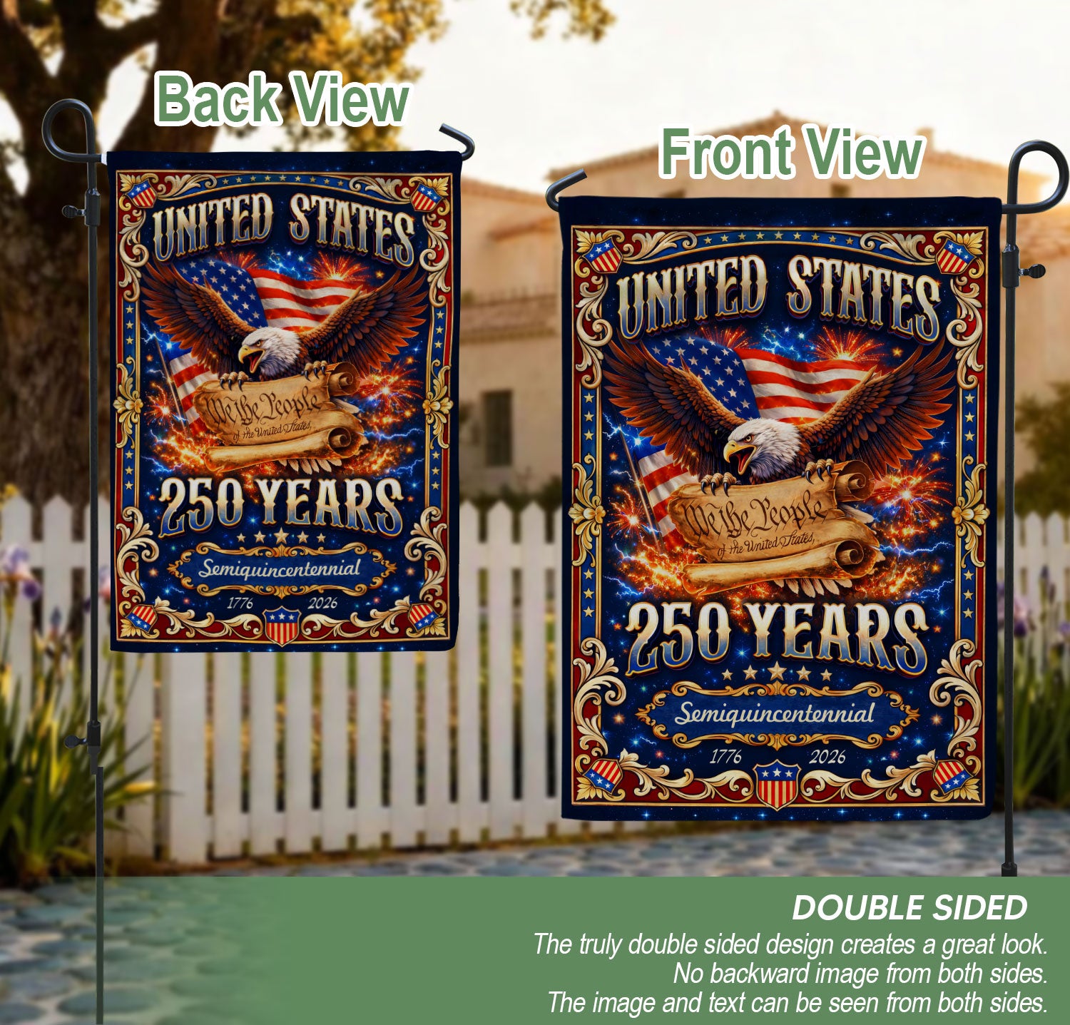 Celebrate America’s 250th anniversary from 1776 to 2026 with this double-sided garden flag featuring ‘We The People’ and Constitution-inspired imagery. Crafted for durability, this patriotic yard flag honors the principles that built the nation, symbolizing enduring liberty and freedom. Perfect for gardens, porches, or yards to display national pride. The high-quality, weather-resistant design ensures vibrant colors on both sides, making it ideal for holidays, Independence Day, or everyday patriotic displays.