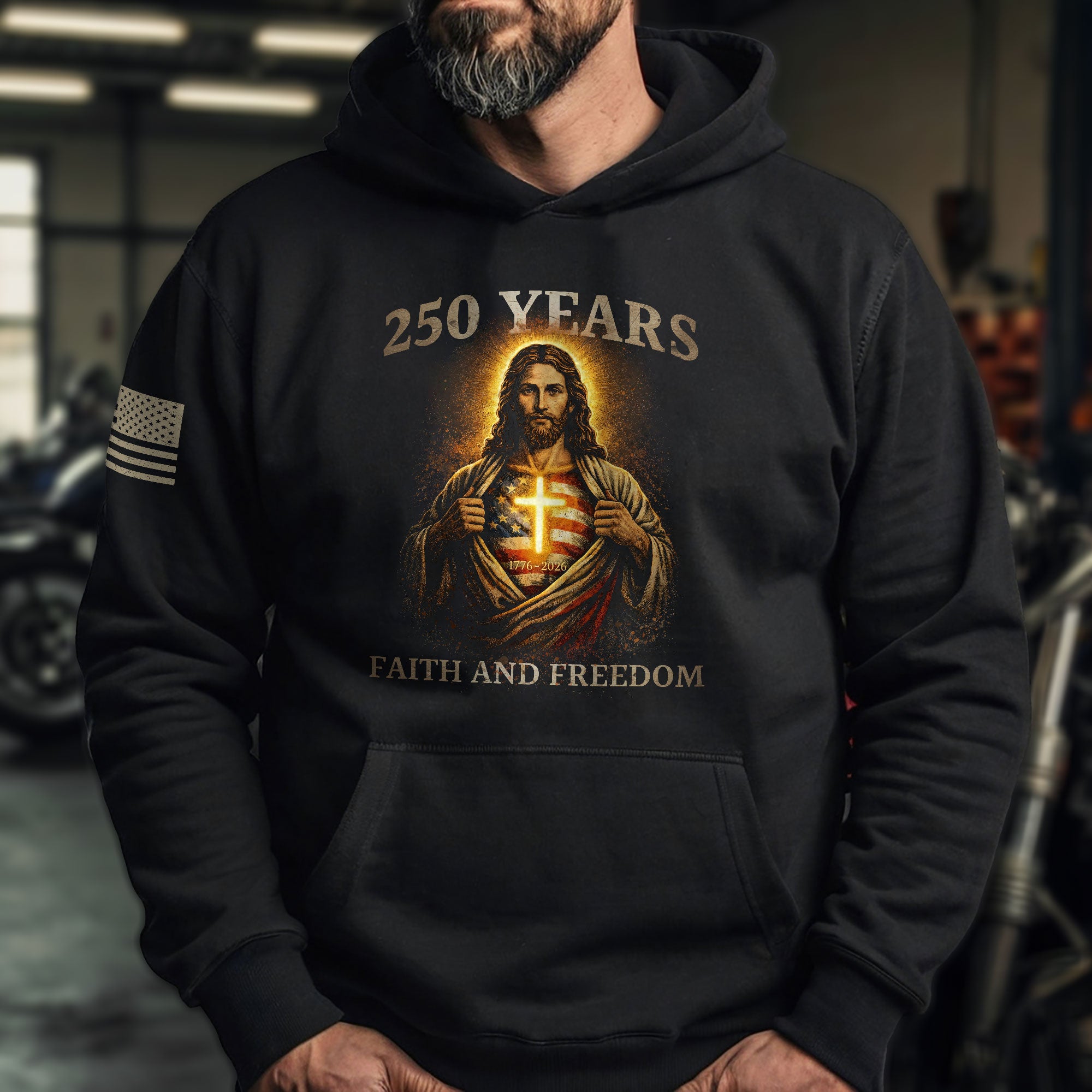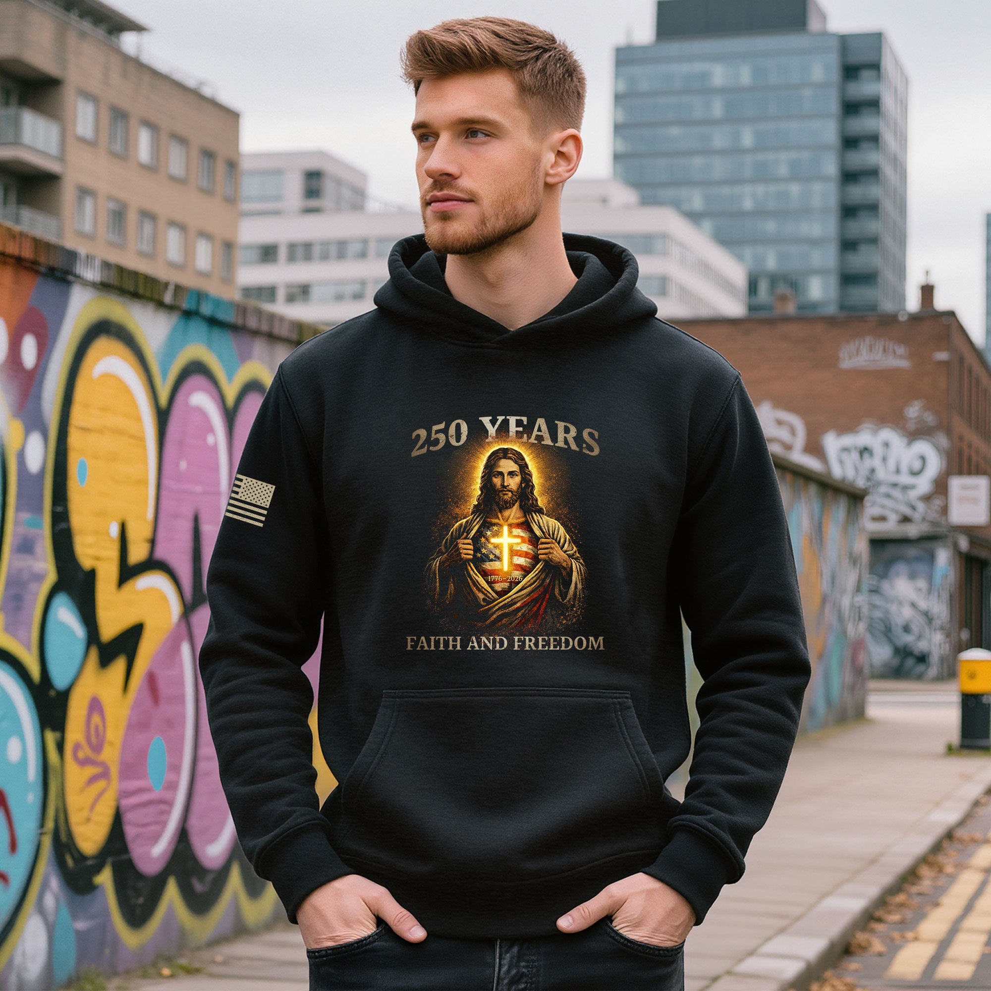 Celebrate America’s 250th anniversary from 1776 to 2026 with this patriotic men’s hoodie featuring a powerful Jesus cross and US flag design. Crafted for comfort and durability, it blends faith and freedom in a bold statement of national pride. Made from premium soft fleece material with a cozy hood, ribbed cuffs, and kangaroo pocket, this pullover hoodie is perfect for everyday wear, casual outings, or showing your devotion during patriotic events like Independence Day, Memorial Day, or Veterans Day. The vibrant graphic print honors the legacy of independence under God’s guidance, making it an ideal gift for men who value faith, freedom, and American history. Available in multiple sizes for a relaxed unisex fit. Machine washable for easy care. Embrace 250 years of strength and liberty with this essential wardrobe piece.