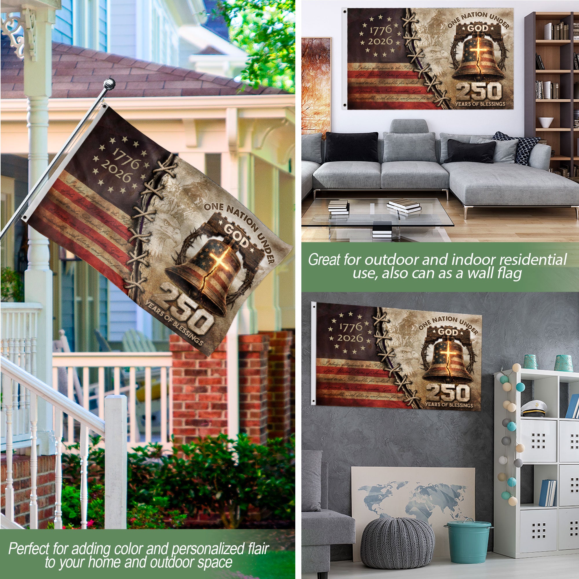 Celebrate America’s 250th anniversary from 1776 to 2026 with this meaningful Christian flag, blending patriotic pride and faith. Crafted for durable outdoor use, this garden flag features symbolic designs honoring national heritage, unity, and religious values. Ideal for porches, gardens, yards, or patios, it withstands weather elements while adding a touch of inspiration. Perfect decoration for Independence Day, national holidays, or everyday display of American spirit and Christian faith. Double-sided printing ensures visibility from all angles, with premium polyester material for vibrant colors and fade resistance.