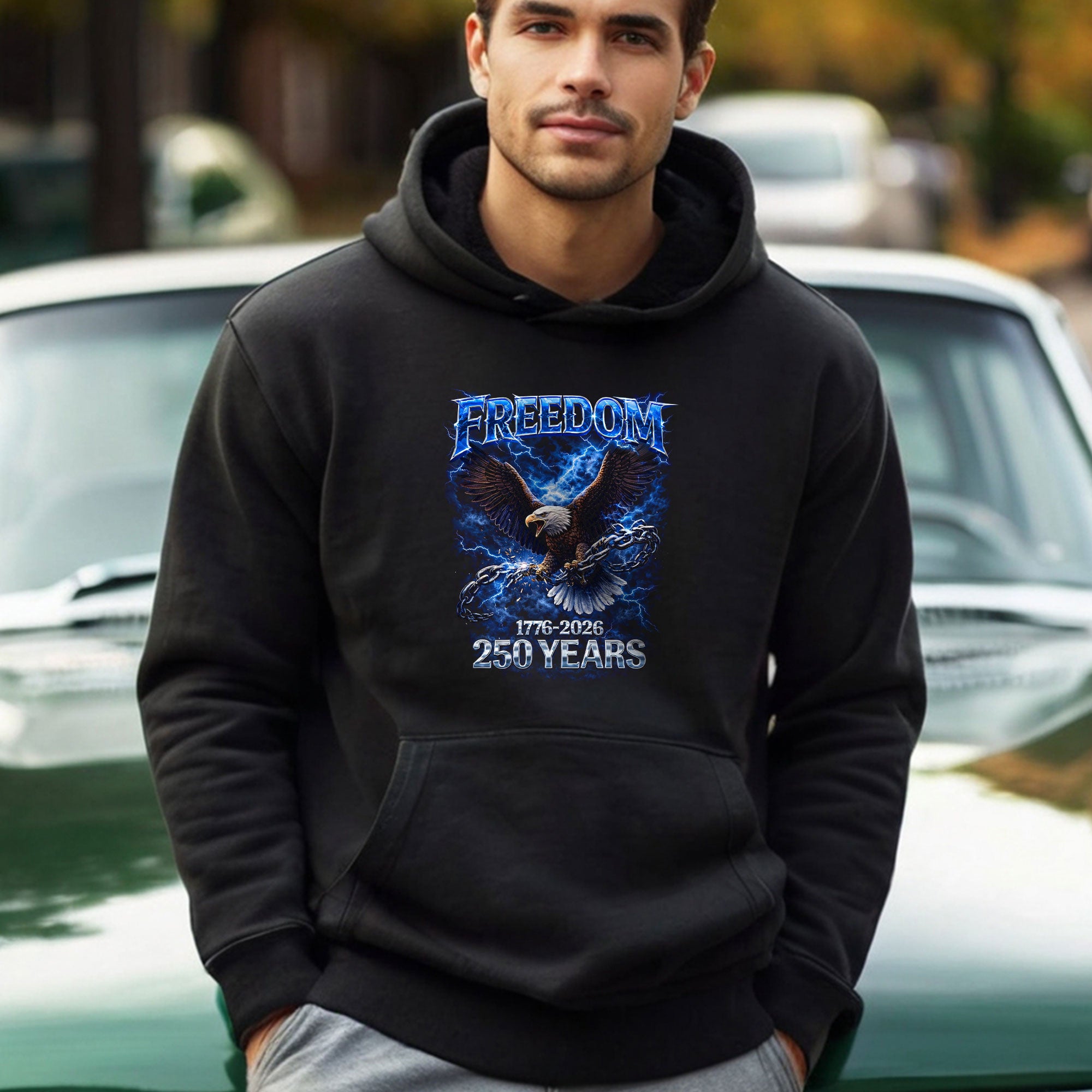Celebrate 250 years of American independence with this vintage bootleg eagle hoodie, spanning 1776-2026. Featuring a striking retro eagle design in classic bootleg style, this freedom hoodie captures the rebellious spirit, pride, and resilience of America’s story. Crafted for comfort, it’s perfect for patriotic events, casual outings, or showing your love for freedom year-round. Made from soft, durable cotton-poly blend fabric with a cozy fleece-lined hood, ribbed cuffs, and kangaroo pocket for everyday wear. Ideal for history buffs, patriots, and anyone embracing retro patriotic apparel. Available in multiple sizes for men, women, and unisex fit.