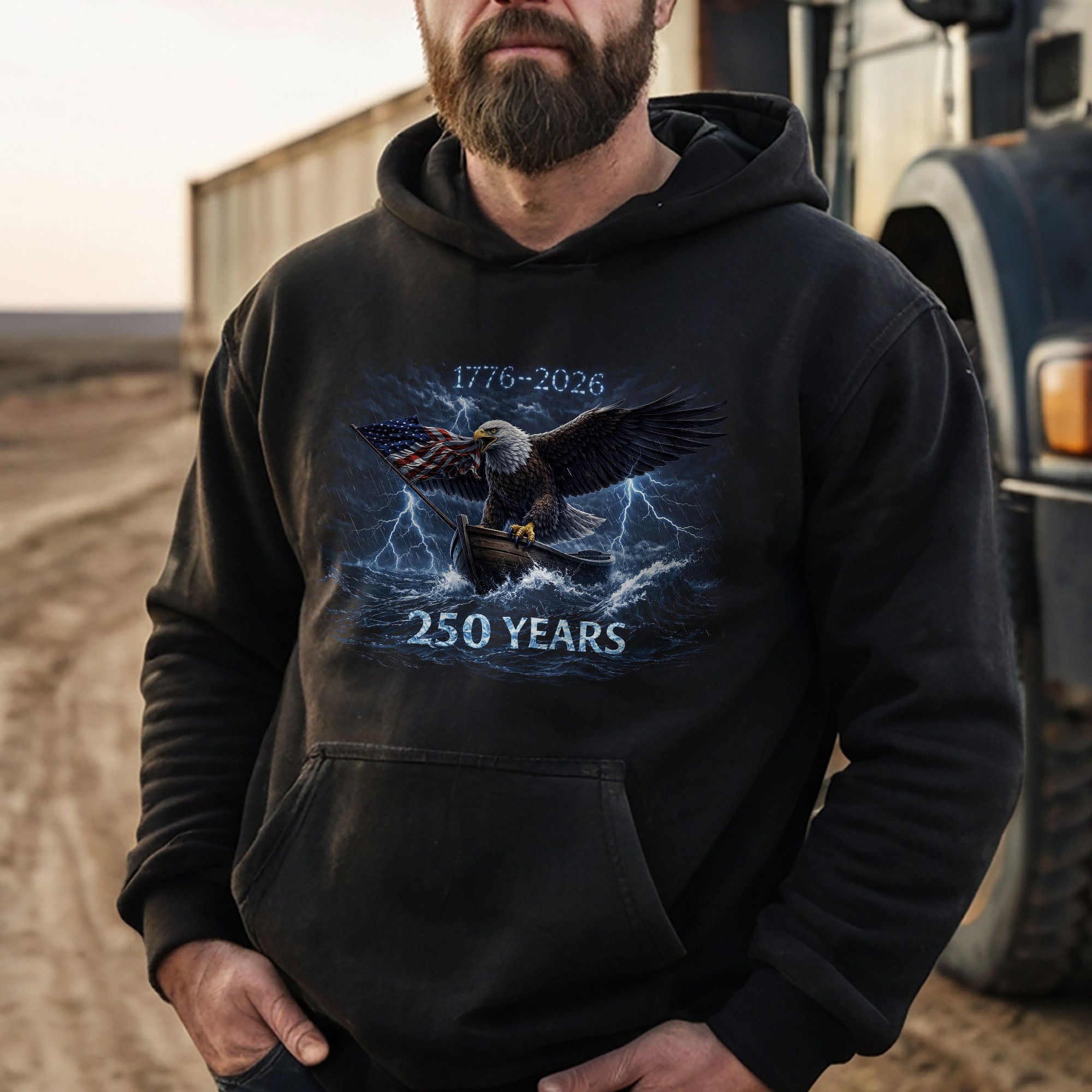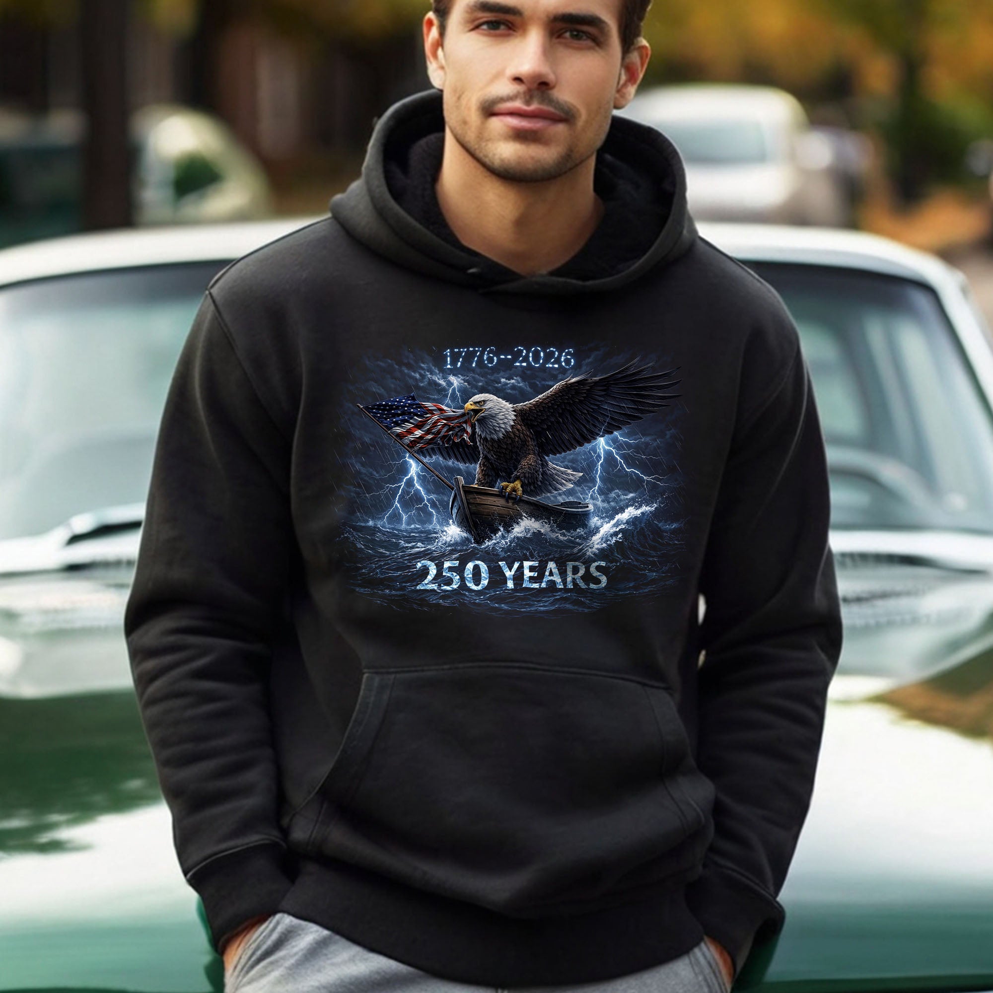 Celebrate 250 years of American independence with this vintage bootleg hoodie featuring a bold eagle and flag graphic inspired by 90s retro patriotic streetwear. Spanning from 1776 to 2026, the design fuses timeless freedom symbols with street-ready attitude, perfect for history enthusiasts, patriots, and casual wearers. Crafted for comfort and durability, this unisex hoodie offers a relaxed fit ideal for everyday outings, festivals, or showing national pride. The high-quality graphic print ensures vibrant colors that withstand washes, while the soft fleece interior provides warmth for cooler days. Whether layering for a rugged look or pairing with jeans for urban style, this anniversary hoodie embodies resilience and American spirit in a nostalgic bootleg aesthetic.