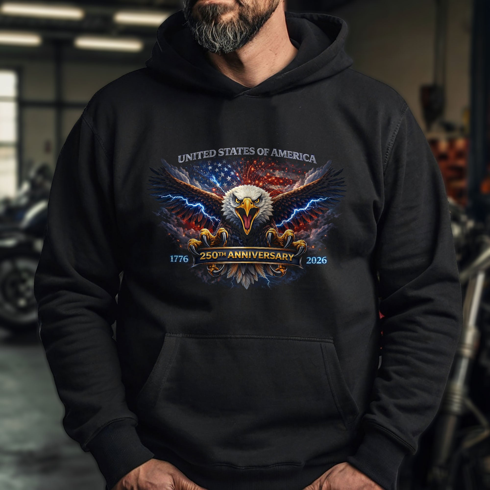 Celebrate 250 years of American independence with the Vintage Bootleg USA 1776-2026 Freedom Hoodie. This patriotic hoodie features bold eagle and American flag graphics, capturing the raw energy of 90s streetwear with authentic bootleg style. Crafted for comfort and durability, it’s perfect for everyday wear, casual outings, or showing national pride at events. The unisex design offers a relaxed fit, cozy fleece lining, and adjustable drawstring hood. Ideal for history enthusiasts, patriots, and fans of vintage-inspired apparel. Honor the spirit of freedom forged in 1776 and reimagined for 2026.