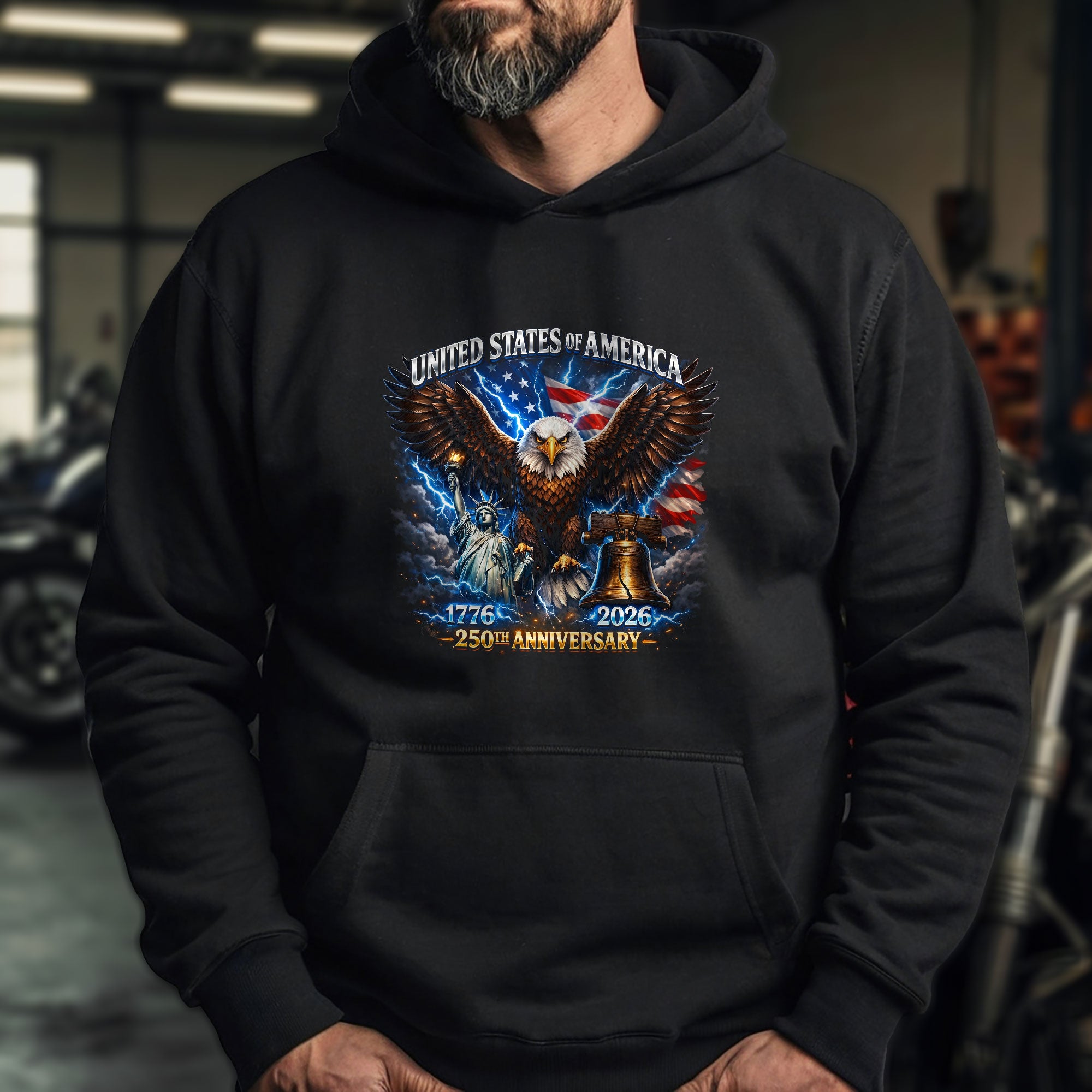 Celebrate 250 years of American resilience with the Vintage Bootleg USA Eagle Hoodie. This patriotic hoodie features a bold heritage-inspired graphic showcasing the Liberty Bell, shield, and eagle emblem, commemorating the 1776-2026 250th anniversary. Crafted for comfort and style, it offers a fearless bootleg twist on classic Americana design. Perfect for patriots, history enthusiasts, and everyday wear during Fourth of July events, rallies, or casual outings. Made with soft, durable fabric for all-day comfort, this freedom hoodie embodies unity, strength, and defended liberty across generations. Ideal for layering in cooler weather or showing national pride year-round.