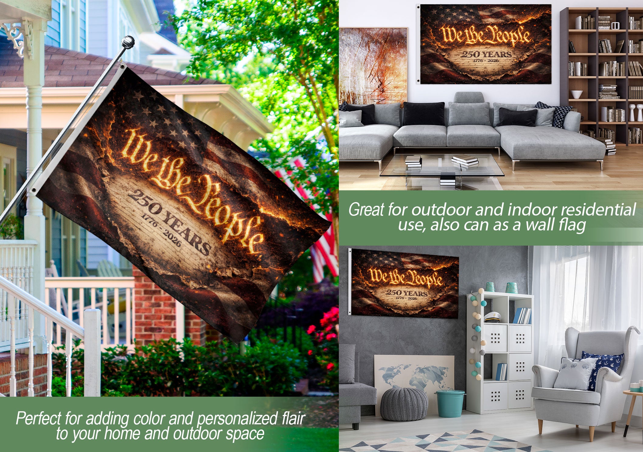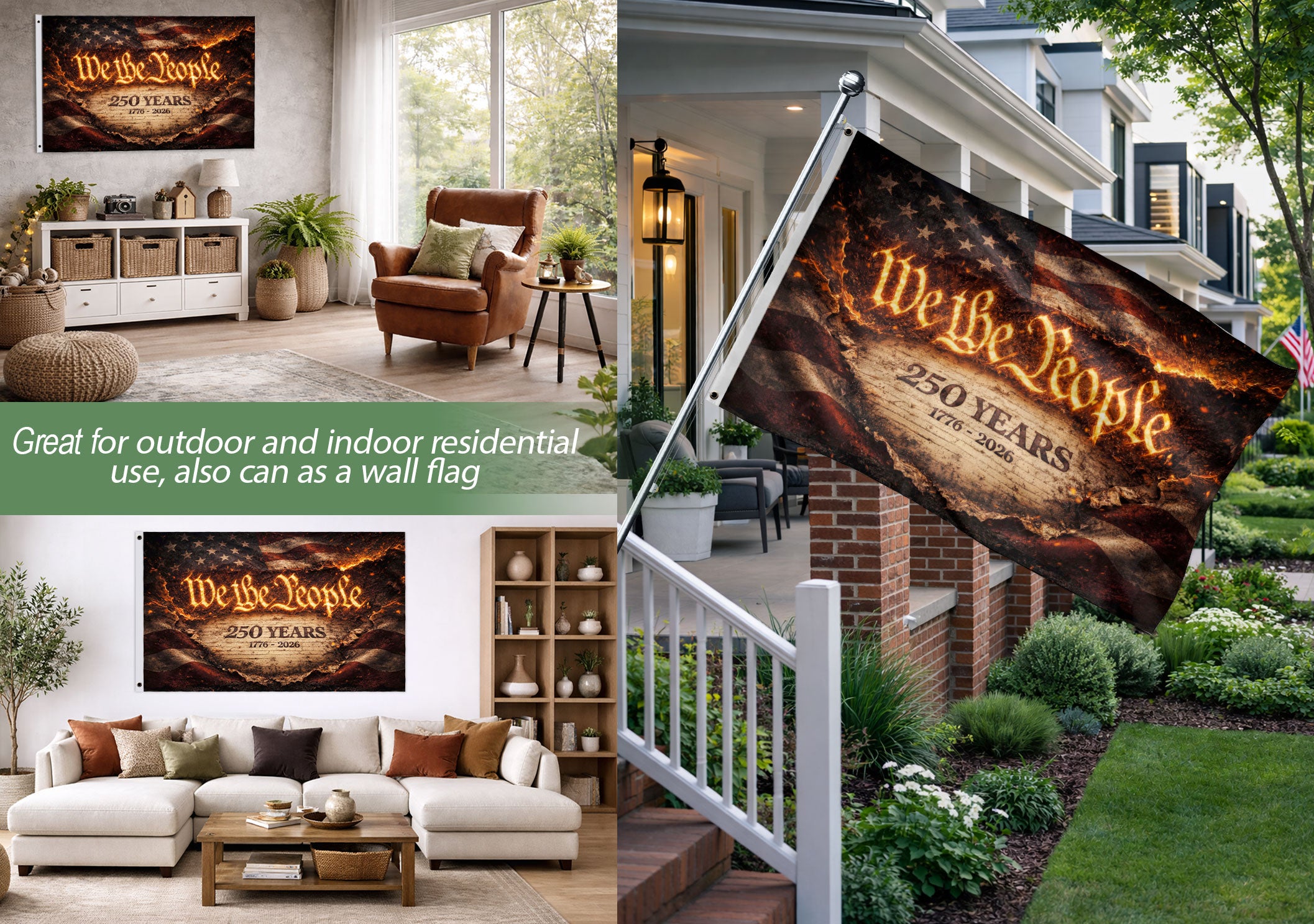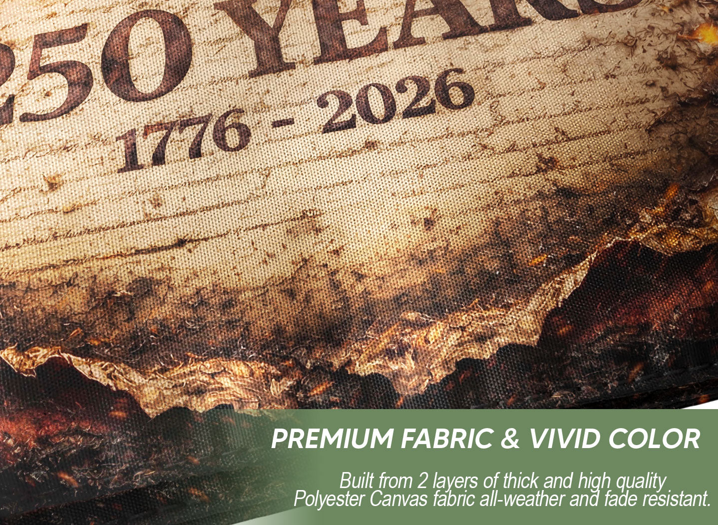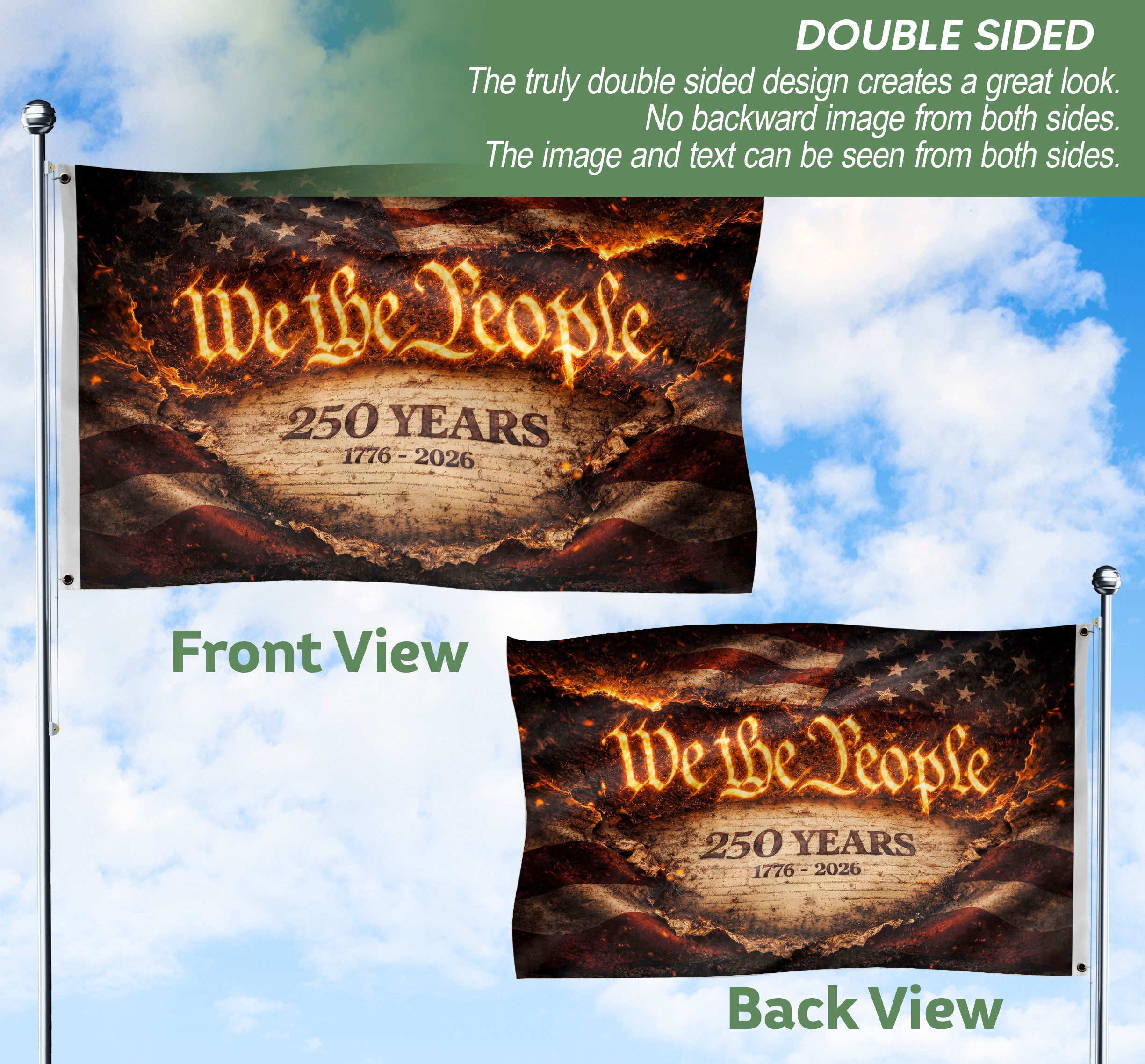 Celebrate 250 years of American independence with the We The People 250 Years Flag, spanning 1776-2026. This striking fire-style patriotic yard flag captures the fiery spirit of unity, liberty, and the enduring ideals of the nation. Double-sided for visibility from both directions, it’s crafted from durable, weather-resistant polyester fabric perfect for outdoor display in your yard, garden, or porch. The bold design features the iconic ‘We The People’ message in a dramatic flame motif, honoring the semiquincentennial anniversary. Easy to hang with a reinforced sleeve for standard flag poles or stakes. Ideal for patriots, history enthusiasts, and Fourth of July celebrations. Fade-resistant colors ensure long-lasting vibrancy through sun, wind, and rain.
