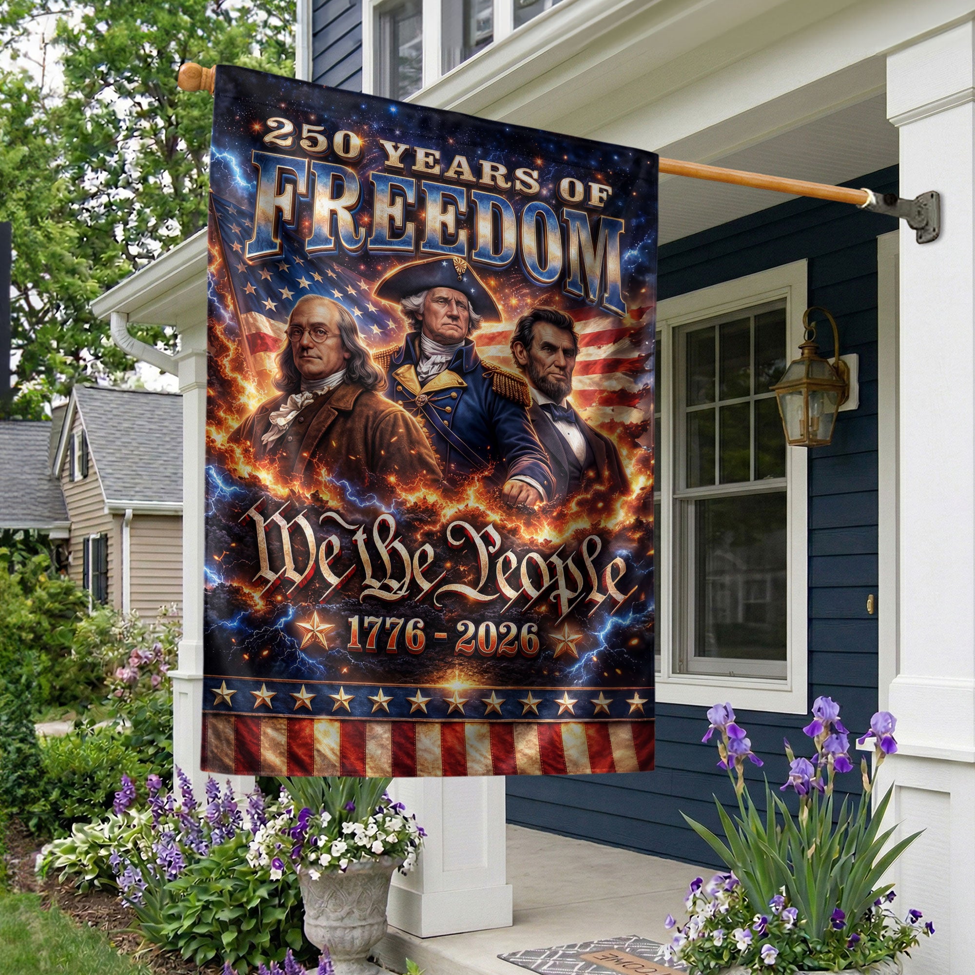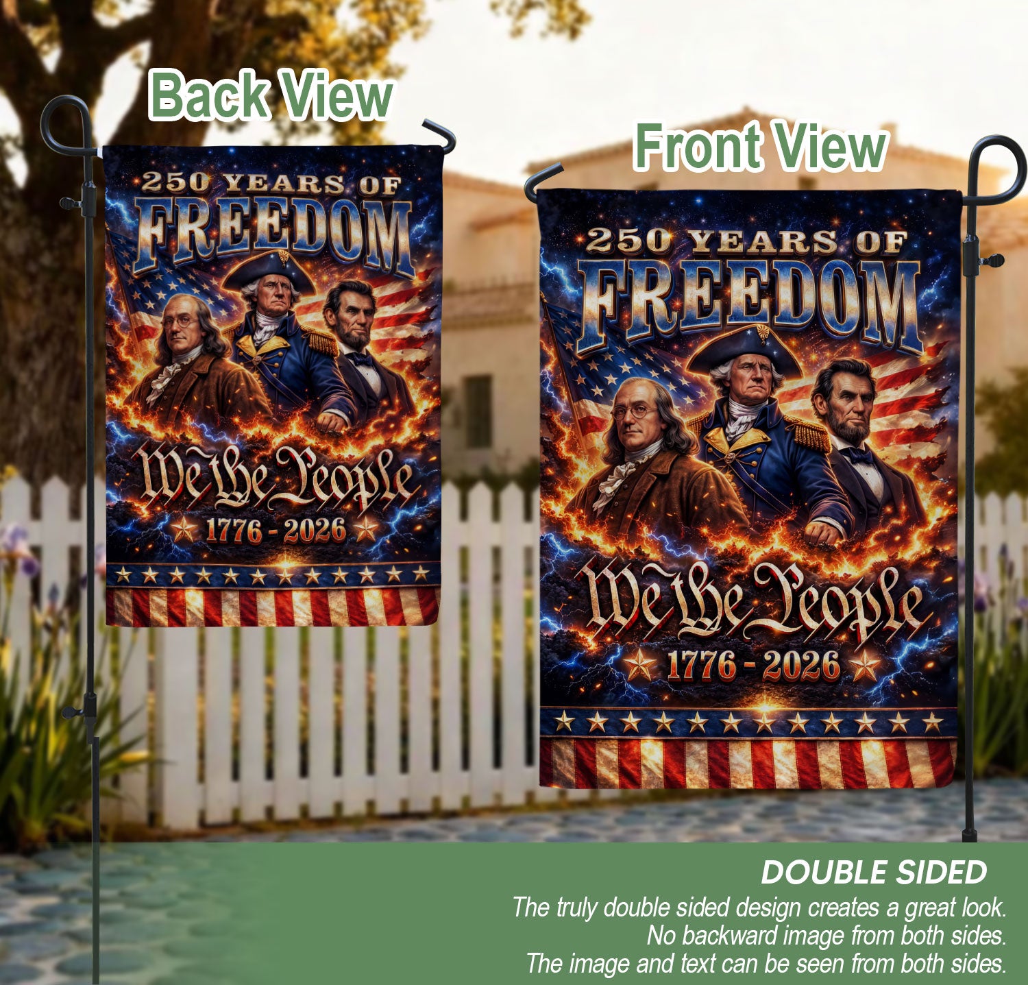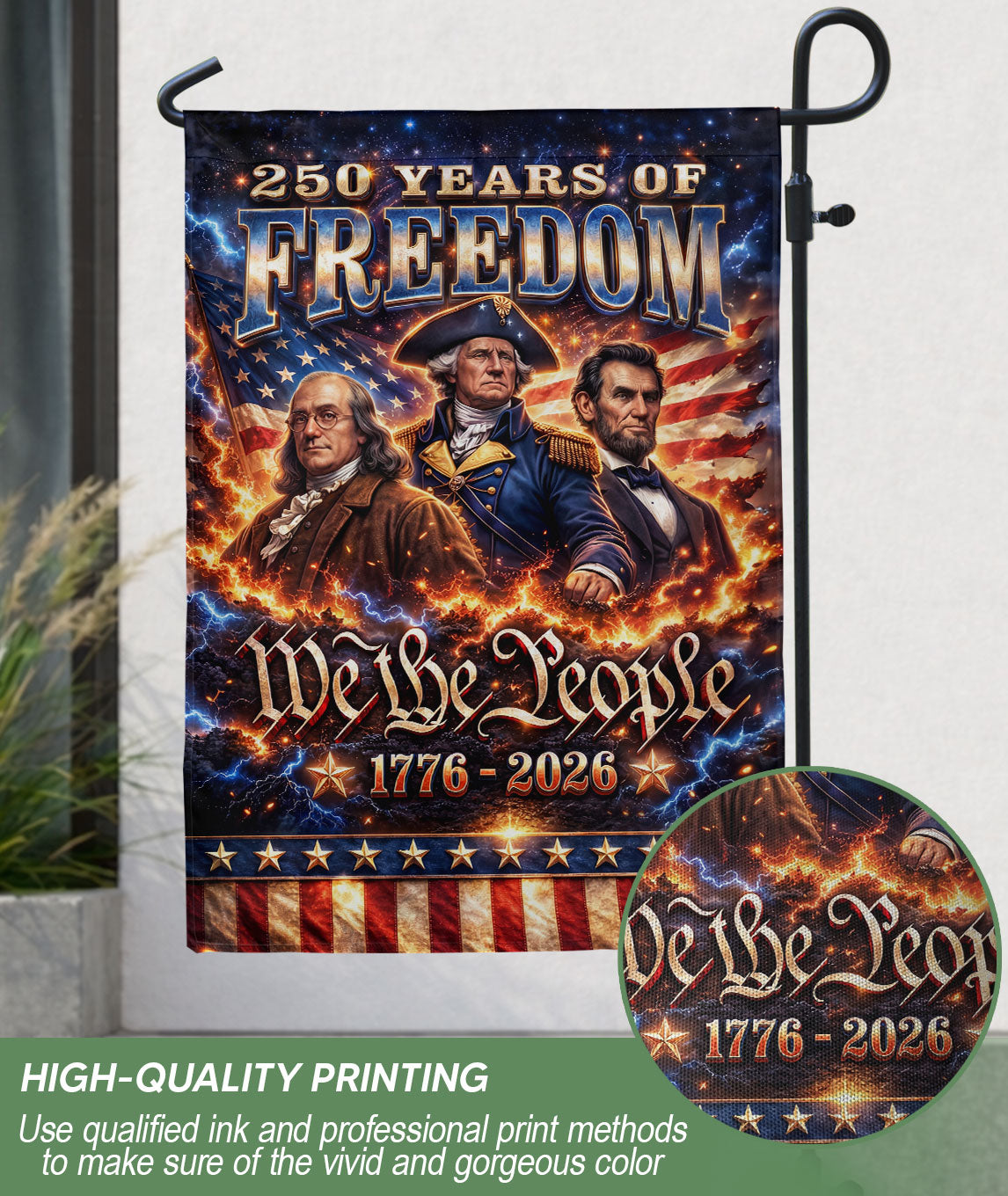 Celebrate America’s 250th anniversary with the We The People 250 Years of Freedom 1776-2026 garden flag. This double-sided garden flag features iconic portraits of George Washington, Abraham Lincoln, and Benjamin Franklin, honoring the founding fathers and leaders who shaped the nation’s history. Crafted for durability, it displays vibrant colors and clear images on both sides, perfect for outdoor display in gardens, yards, porches, or patios. The design captures the spirit of unity, resilience, and freedom from 1776 to 2026, making it an ideal decorative piece for patriotic holidays like Independence Day, Memorial Day, or the upcoming semiquincentennial celebration. Easy to hang with a standard garden flag bracket (not included), this flag is weather-resistant to withstand outdoor conditions. Show your American pride with this historical tribute to the visionaries behind the United States’ enduring legacy.