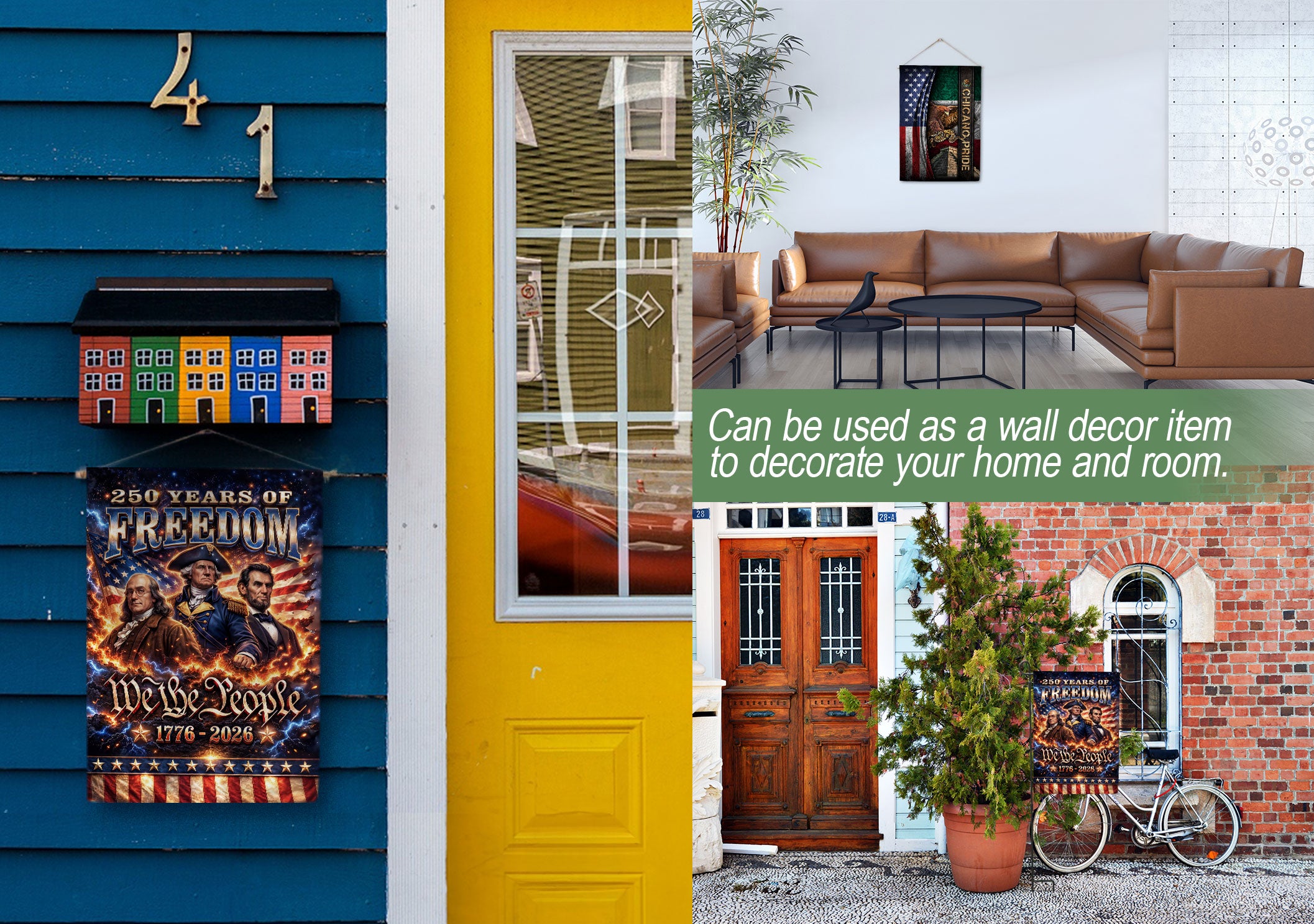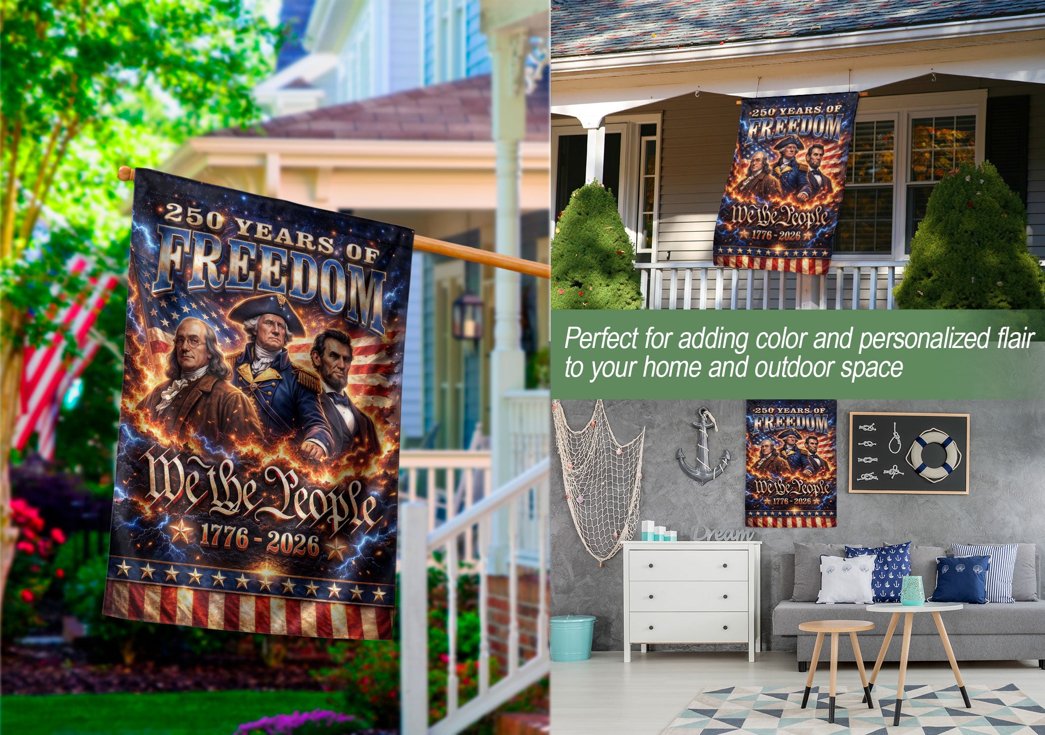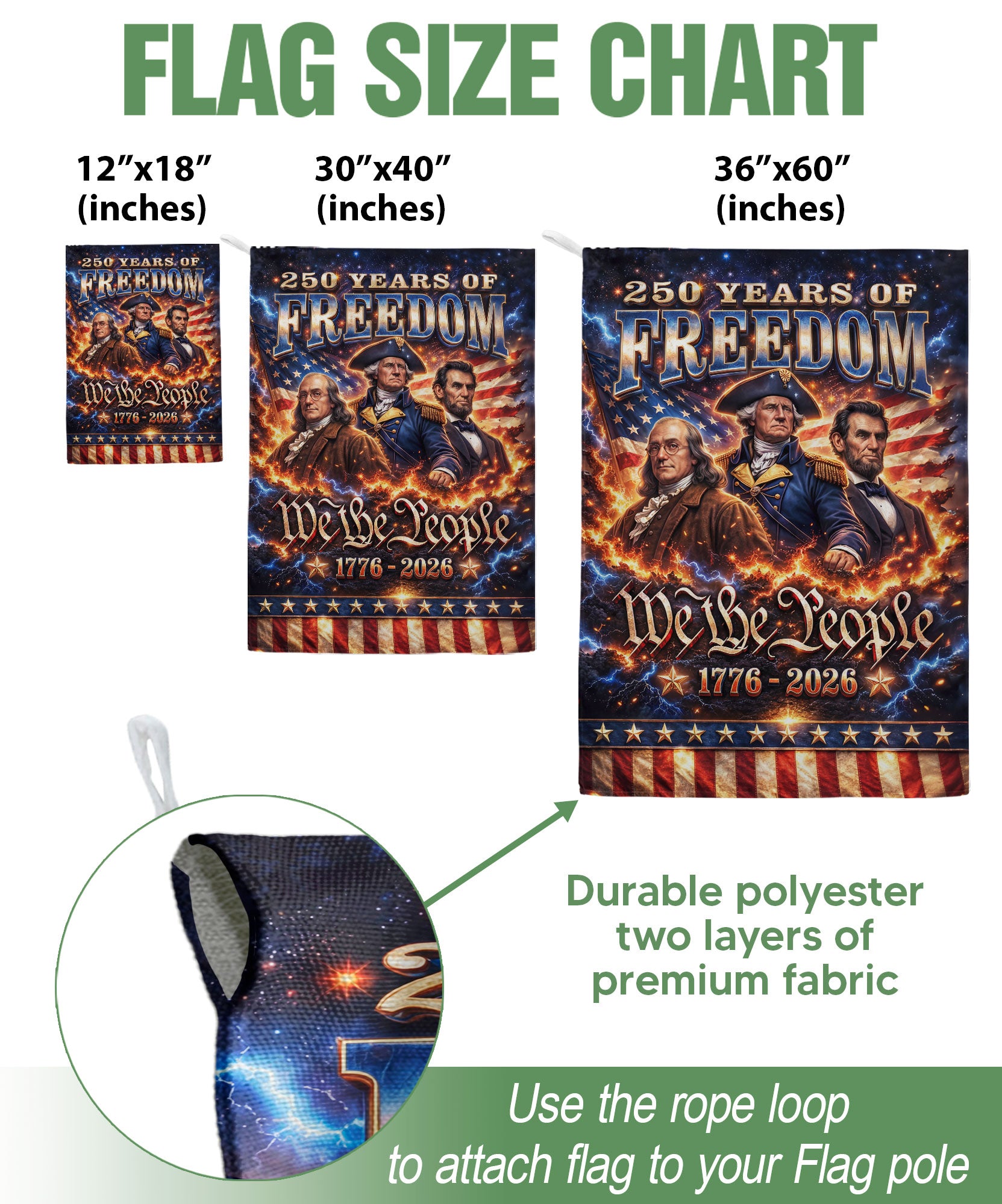Celebrate America’s 250th anniversary with the We The People 250 Years of Freedom 1776-2026 garden flag. This double-sided garden flag features iconic portraits of George Washington, Abraham Lincoln, and Benjamin Franklin, honoring the founding fathers and leaders who shaped the nation’s history. Crafted for durability, it displays vibrant colors and clear images on both sides, perfect for outdoor display in gardens, yards, porches, or patios. The design captures the spirit of unity, resilience, and freedom from 1776 to 2026, making it an ideal decorative piece for patriotic holidays like Independence Day, Memorial Day, or the upcoming semiquincentennial celebration. Easy to hang with a standard garden flag bracket (not included), this flag is weather-resistant to withstand outdoor conditions. Show your American pride with this historical tribute to the visionaries behind the United States’ enduring legacy.
