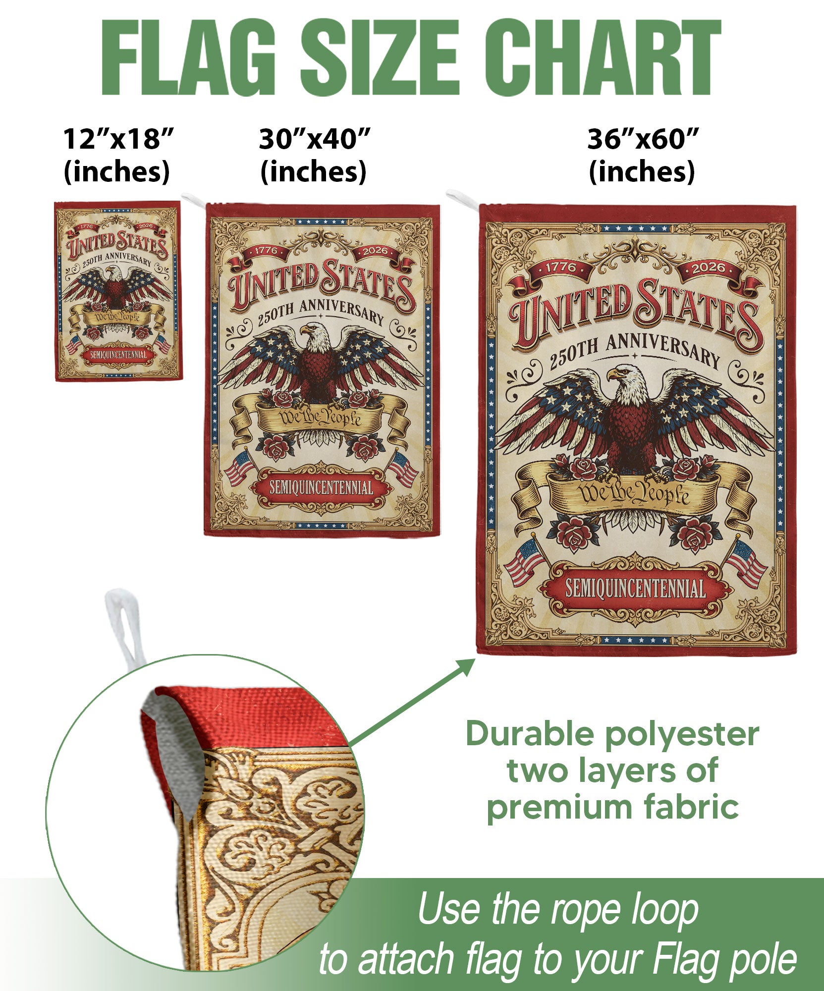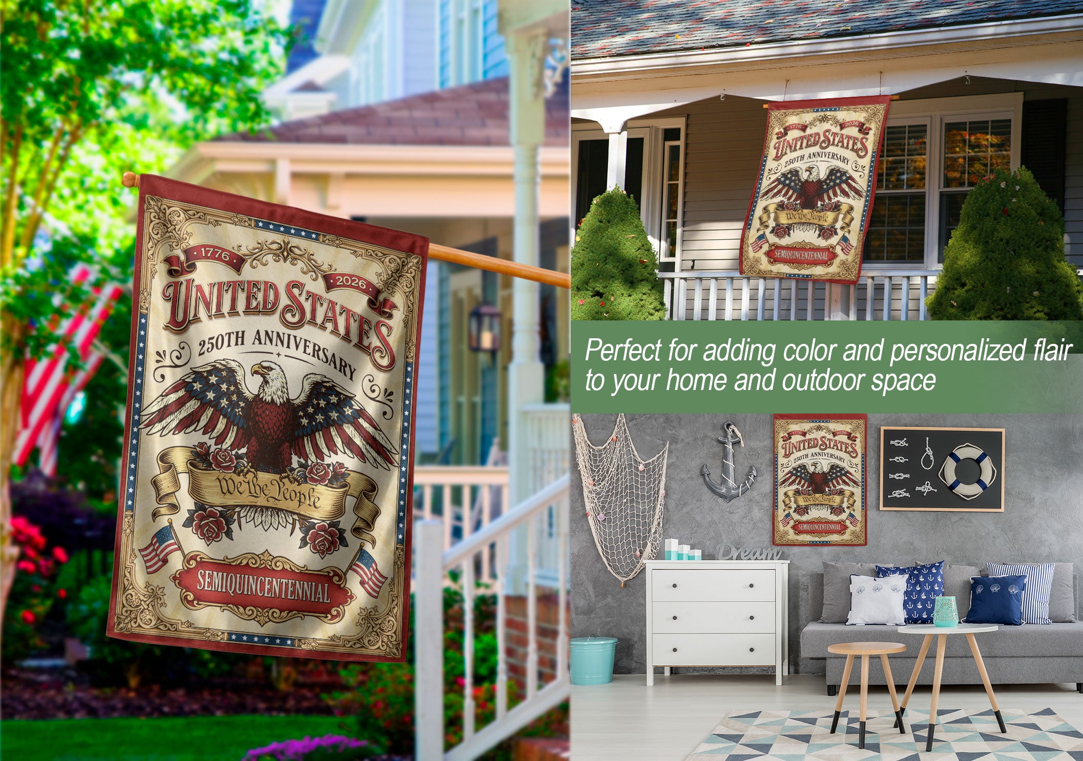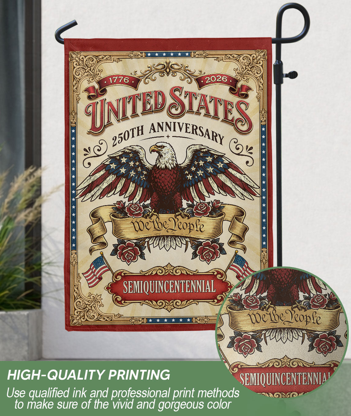 Celebrate 250 years of American independence with this We The People 250 Years United States 1776-2026 Garden Flag. Featuring a striking bald eagle design and the iconic ‘We The People’ phrase, this double-sided USA banner captures the pride, strength, and patriotic spirit of the nation. Perfect for gardens, porches, or patios, it serves as a bold tribute to the 250th anniversary. Crafted with high-quality, weather-resistant fabric for vibrant colors and durability in outdoor conditions. Easy to hang with a sleeve for standard garden flag poles. Ideal for history enthusiasts, patriots, and anyone honoring America’s enduring legacy from 1776 to 2026.