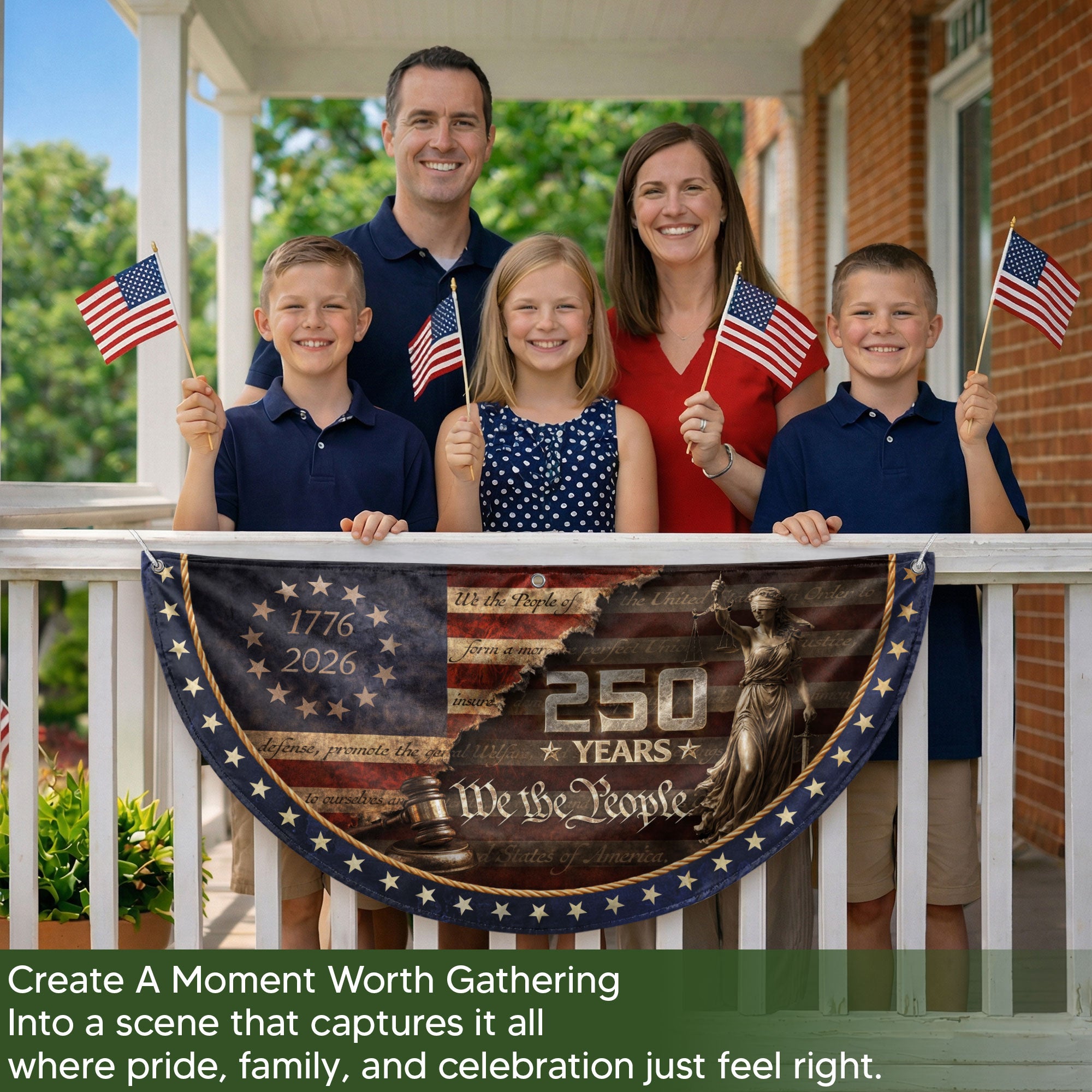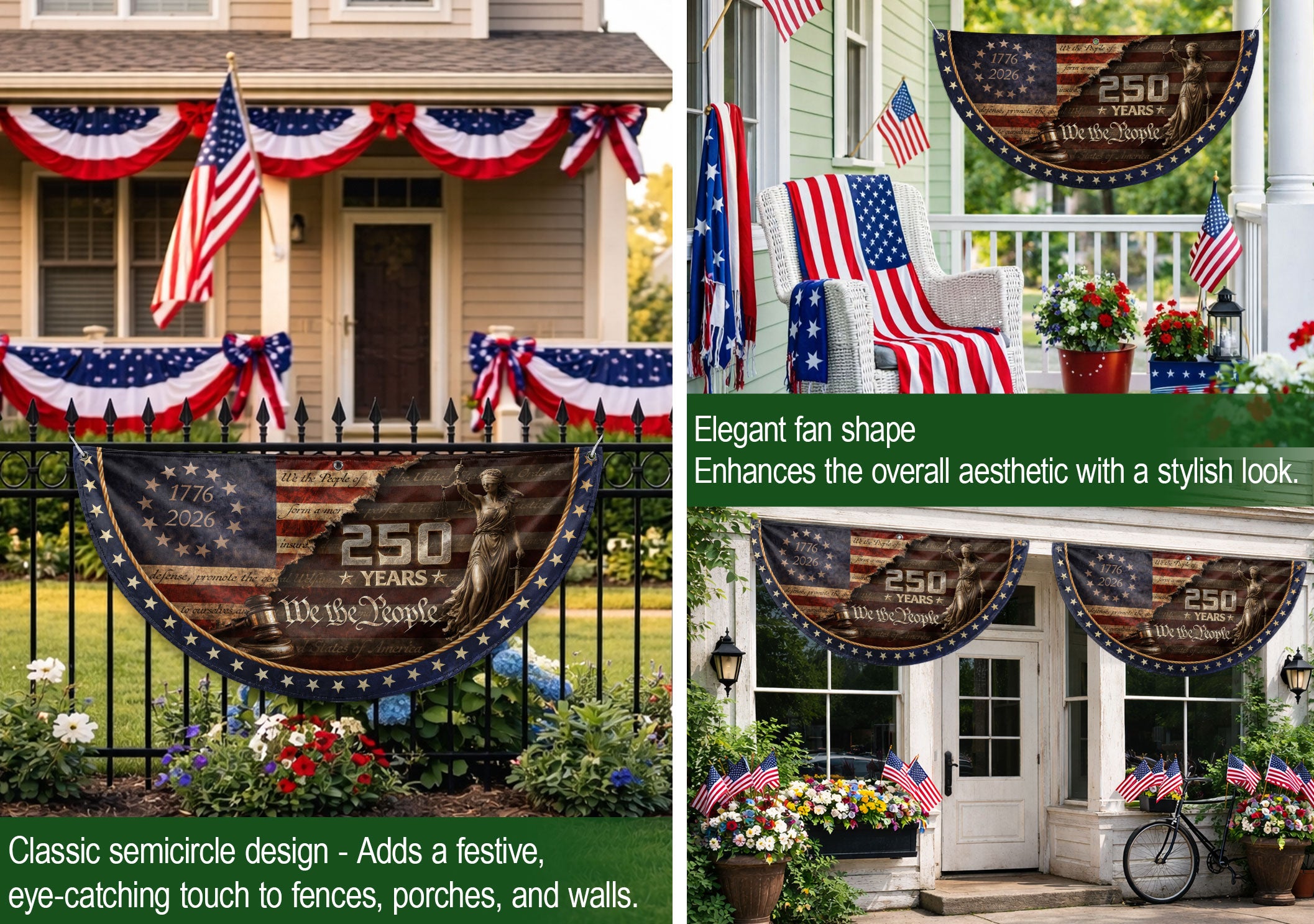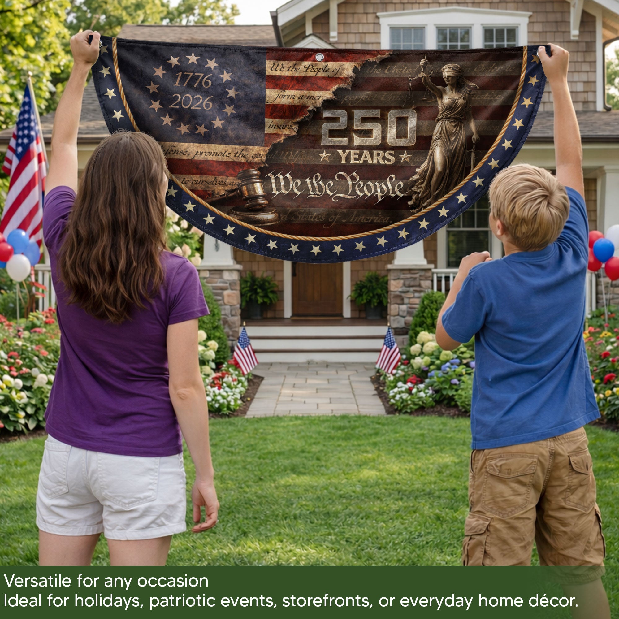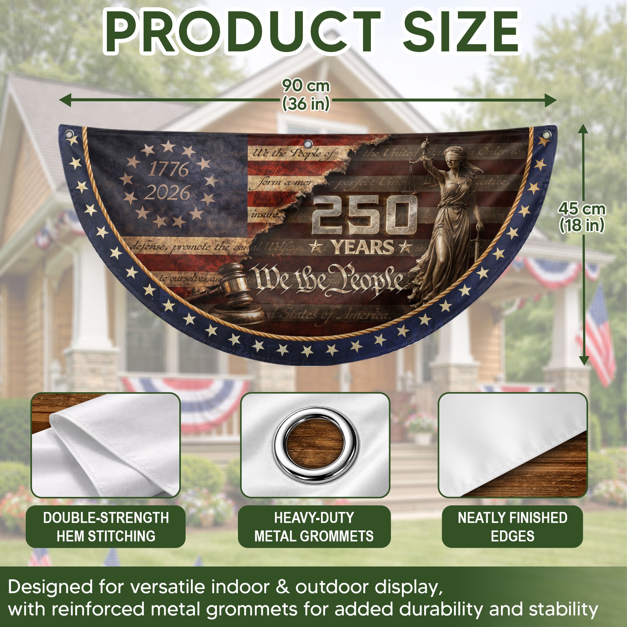 Celebrate 250 years of American independence with this striking fence flag honoring Lady Justice, judge’s gavel, and the iconic ‘We The People’ preamble spanning 1776-2026. Framed by a circle of 13 stars and patriotic motifs, this durable outdoor flag serves as a dignified tribute to justice, freedom, and the nation’s foundational principles. Ideal for fences, porches, or gardens, it withstands weather while proudly displaying American heritage. Perfect for patriots, history enthusiasts, and civic displays during the semiquincentennial.